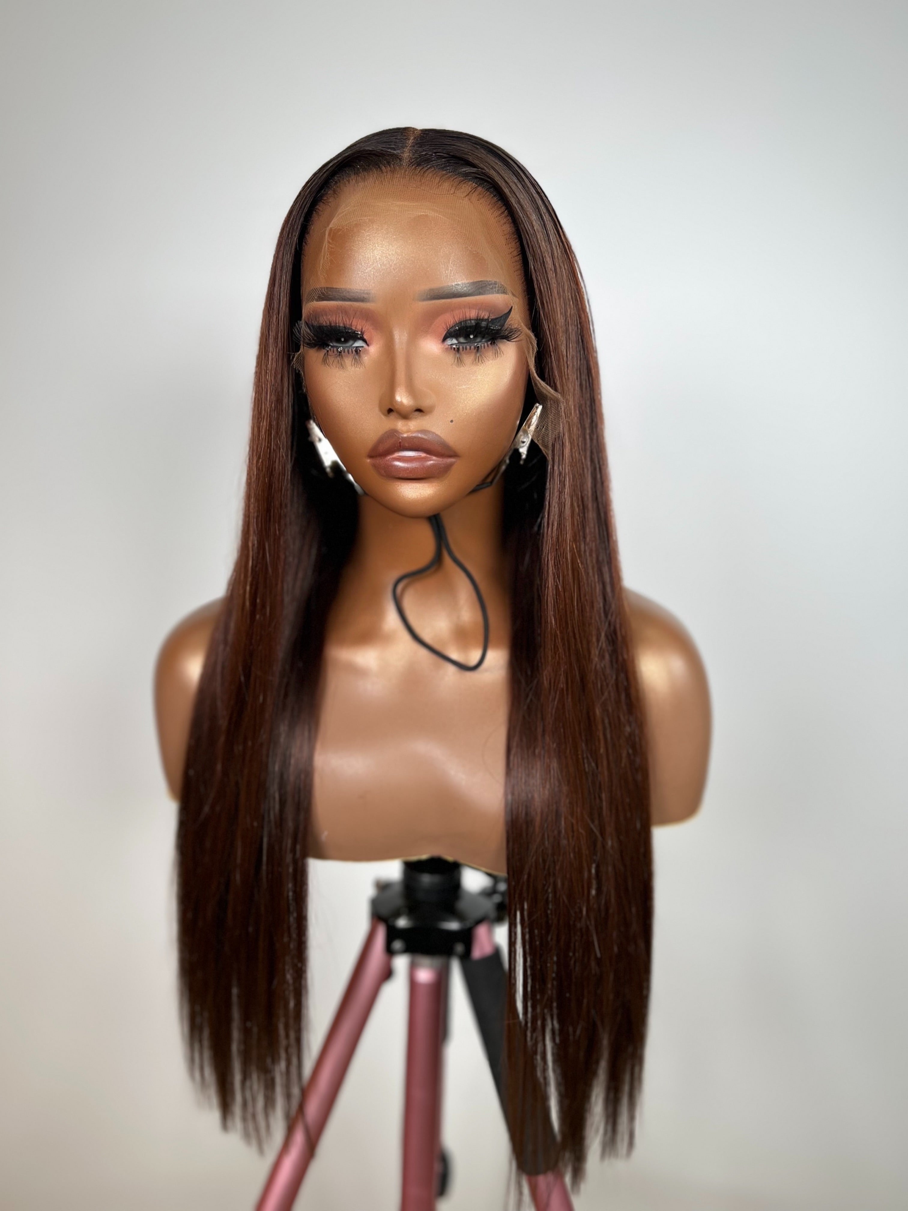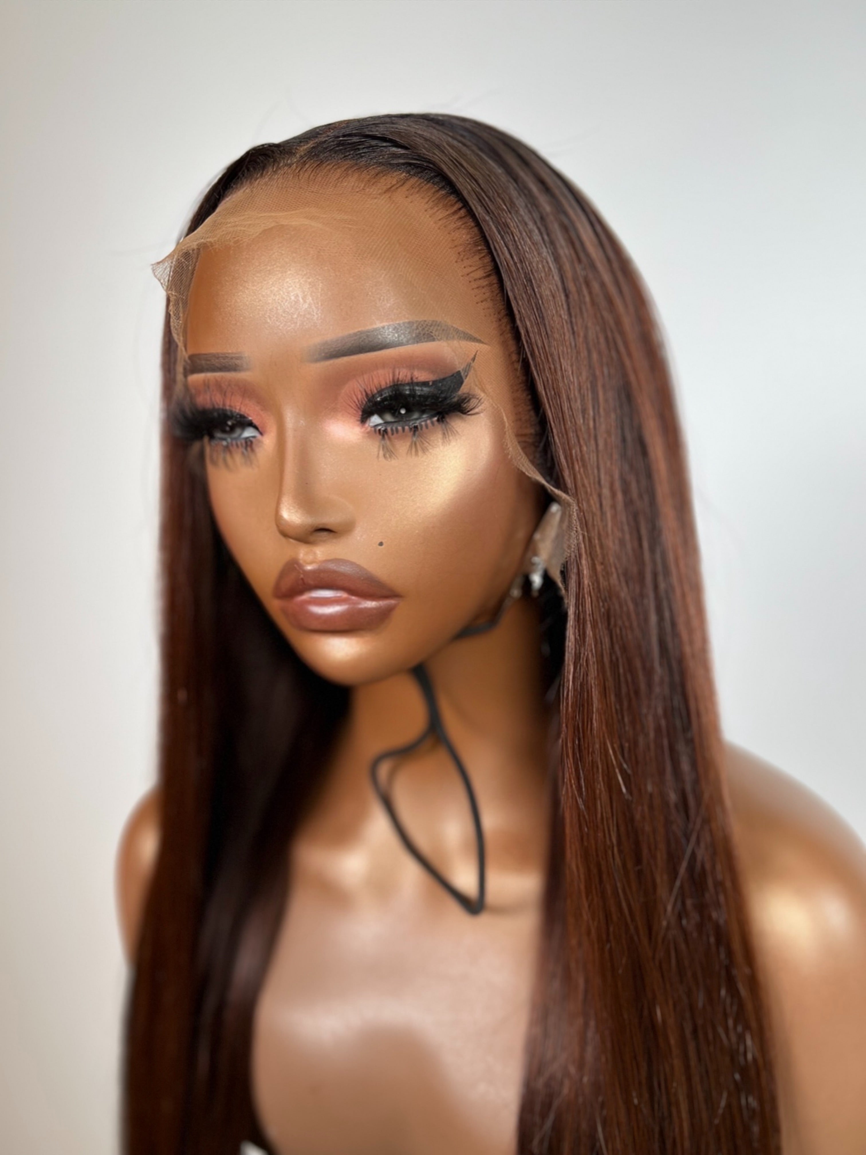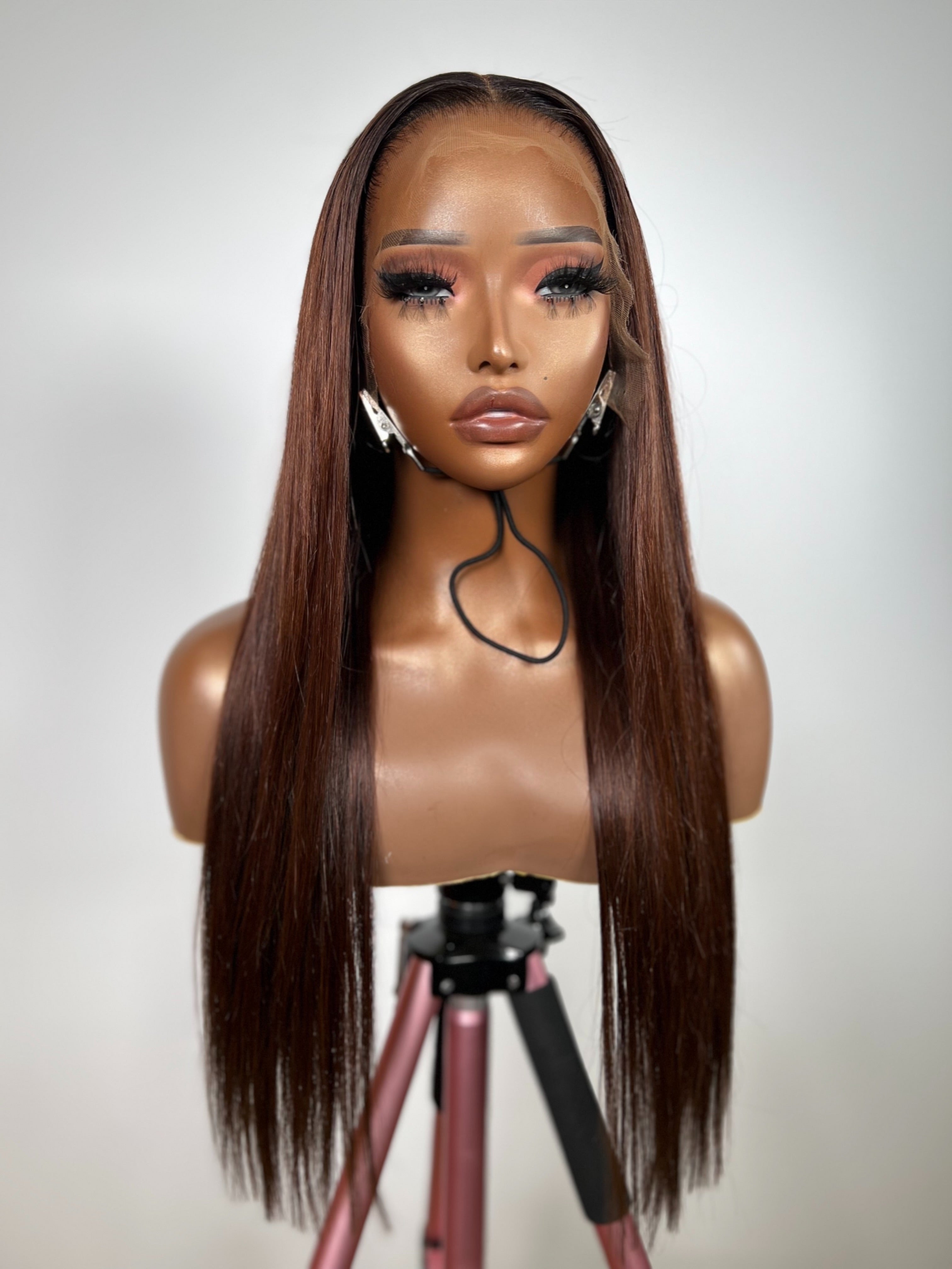 A silky, straight look crafted in a warm chestnut brown with subtle cocoa undertones. The color reflects softly under the light, enhancing the skin with a natural radiance. This unit features a smooth, flowy finish with minimal layers for maximum sleekness. A timeless, rich brown that stays elegant in every setting.