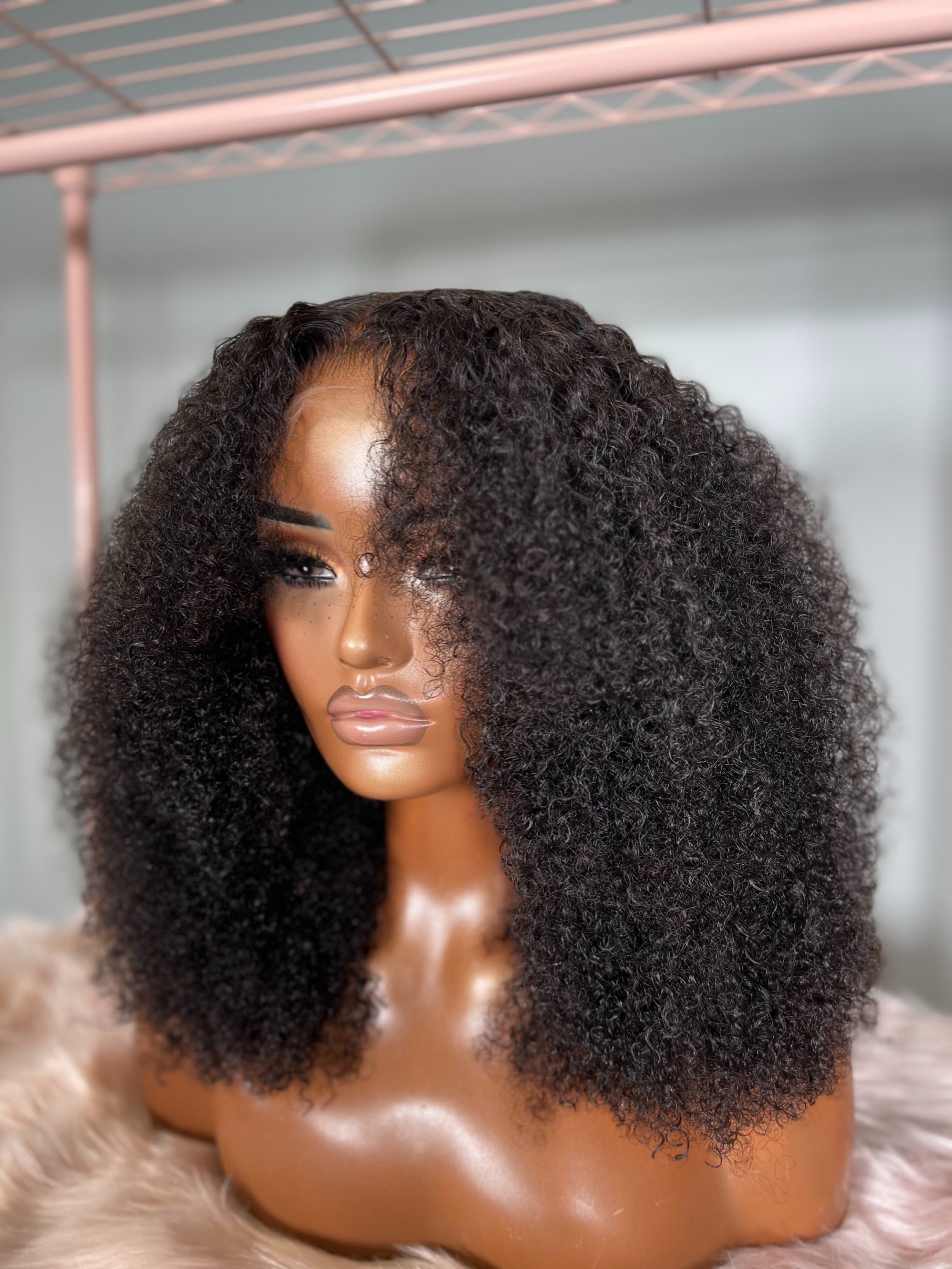 A classic, rich natural black with a tight, bouncy curl pattern that mimics freshly defined 4B/4C curls. Cut into a flattering medium-length shape that frames the face beautifully. The texture gives her a soft cloud-like volume while keeping it wearable and light.