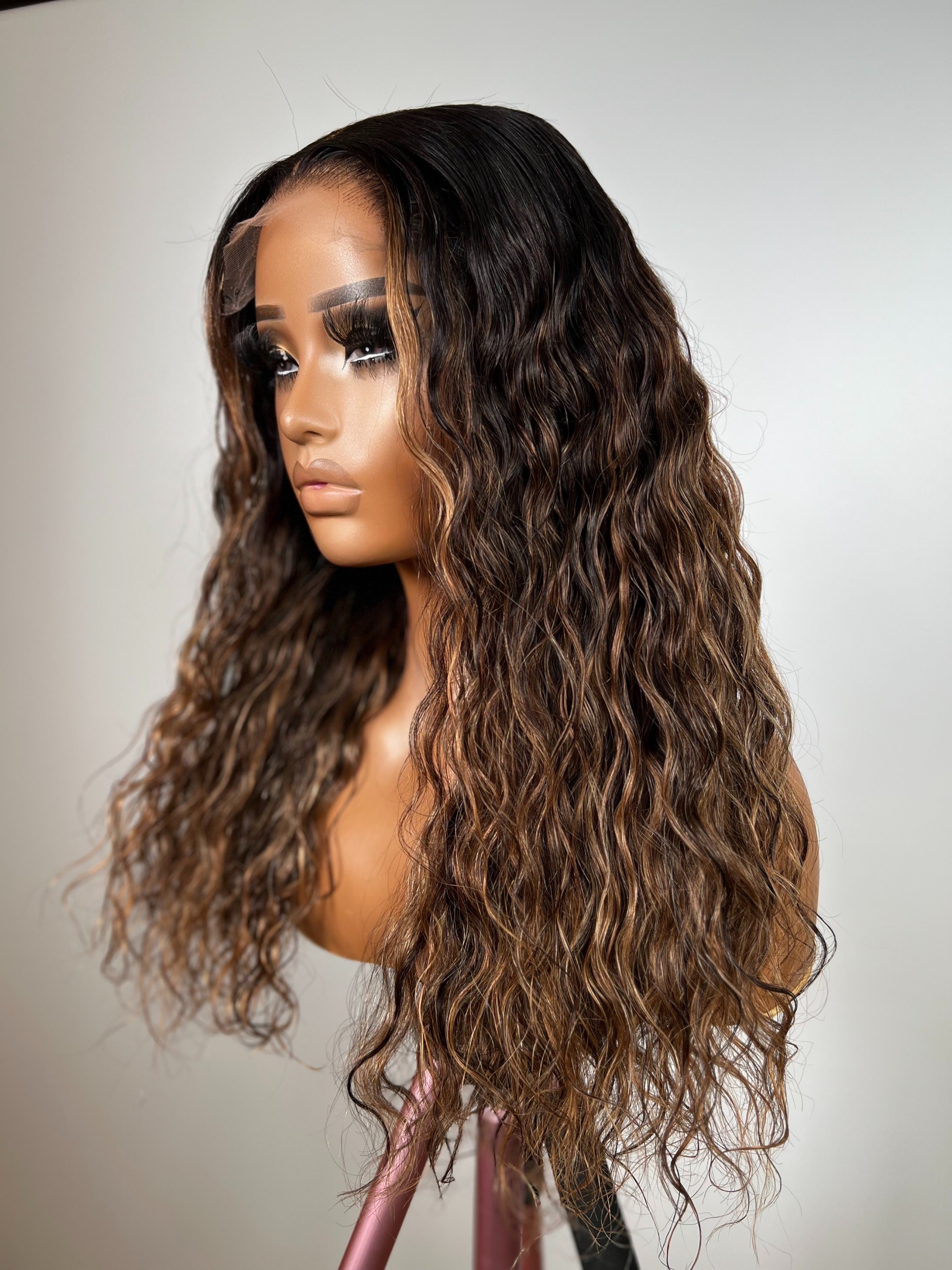 This piece features a rich dark chocolate root melting seamlessly into warm caramel and honey cinnamon ends. The soft wet-wave texture adds natural body and shape while keeping the look light and flowy. Highlights are placed to frame the face subtly, enhancing the skin with a warm, illuminated finish. A perfect balance of depth, dimension and softness.