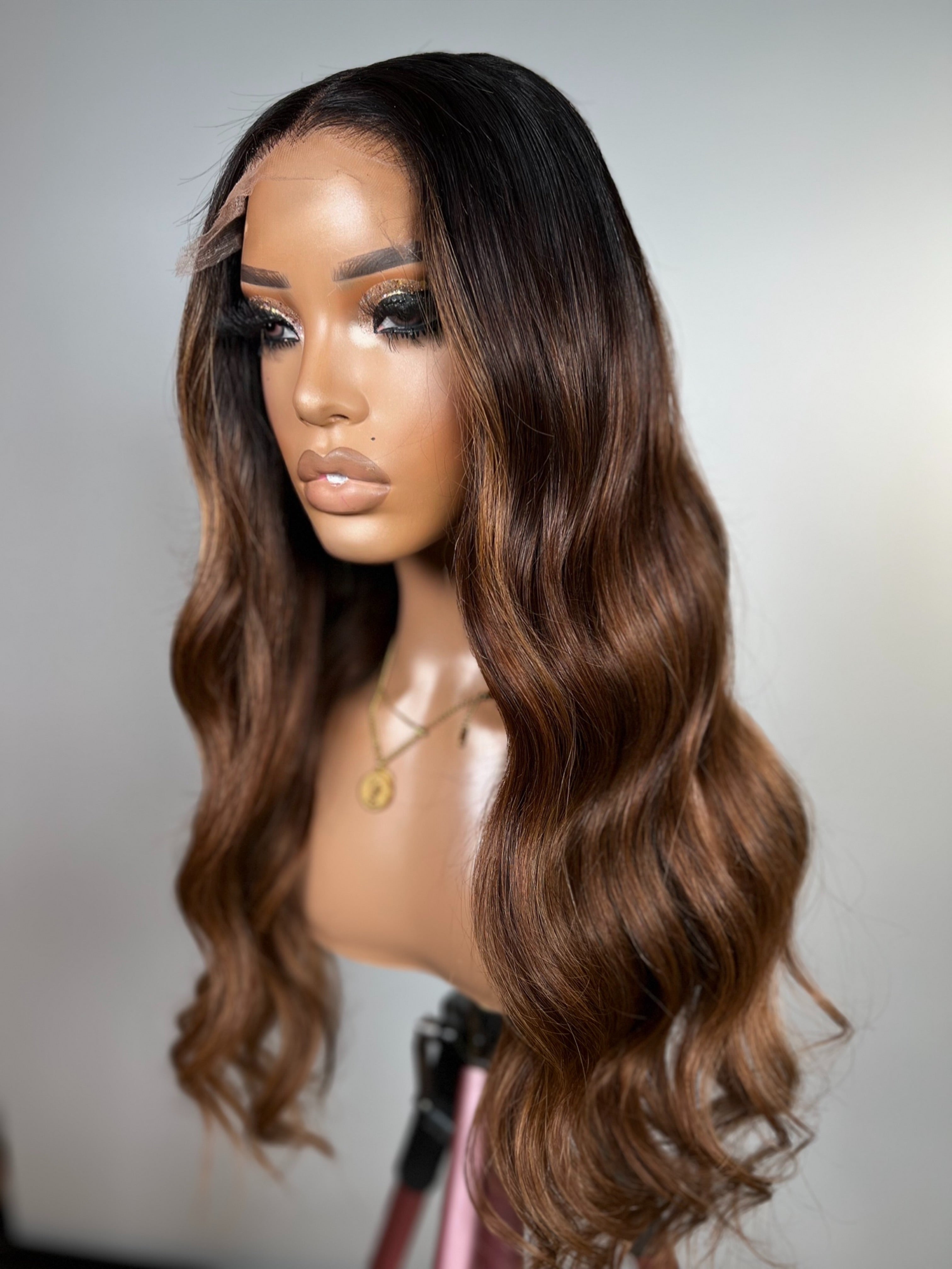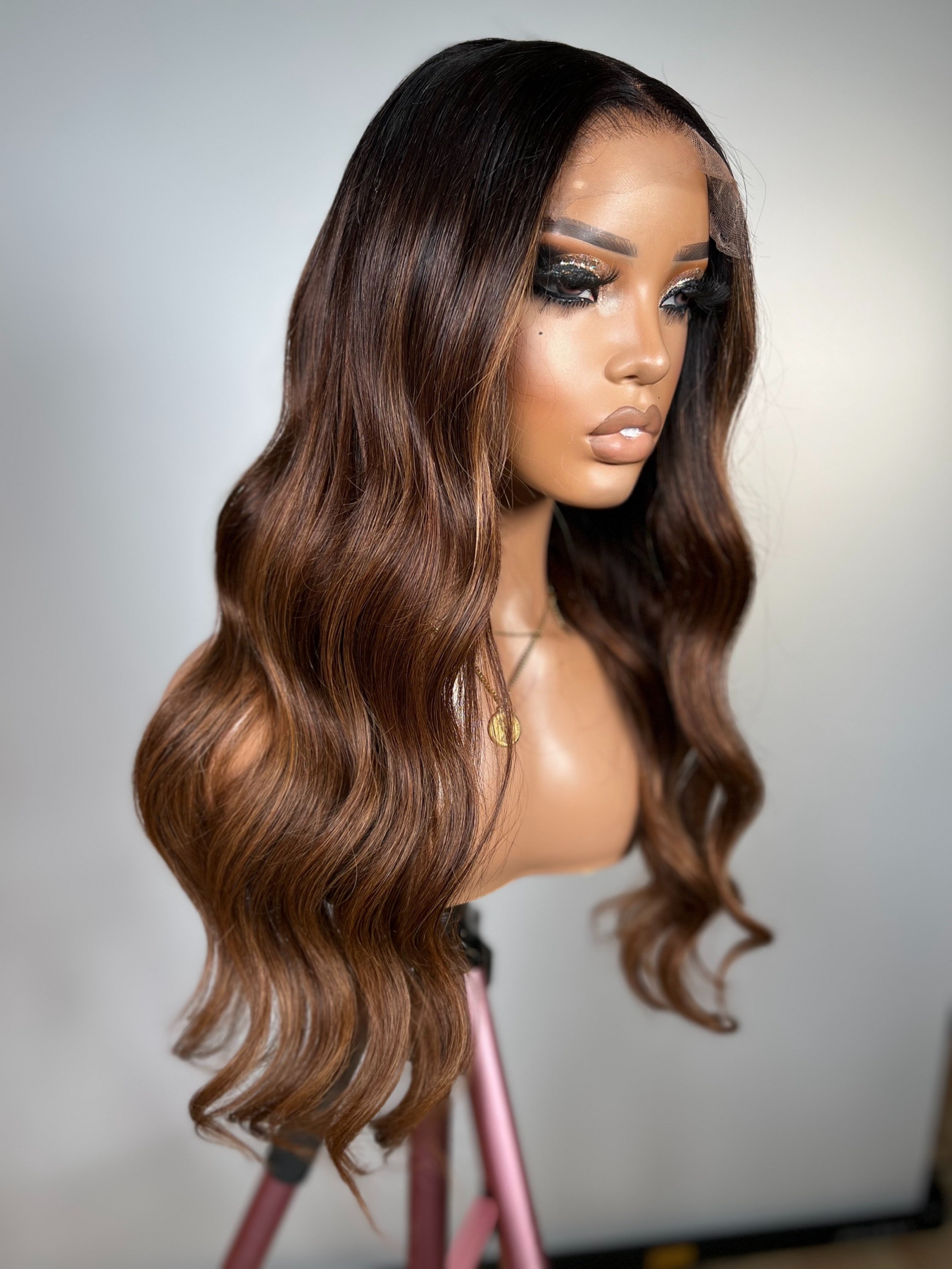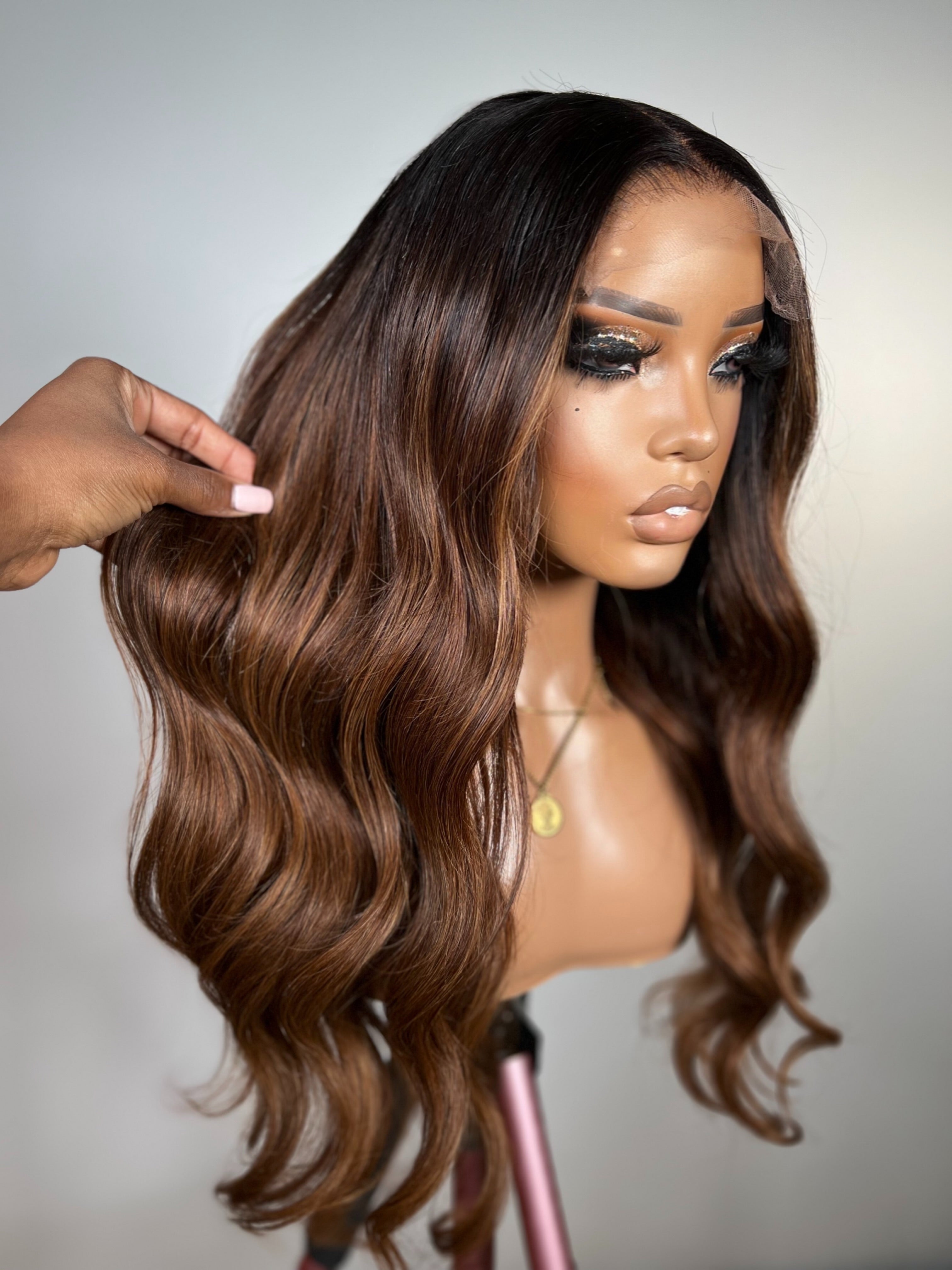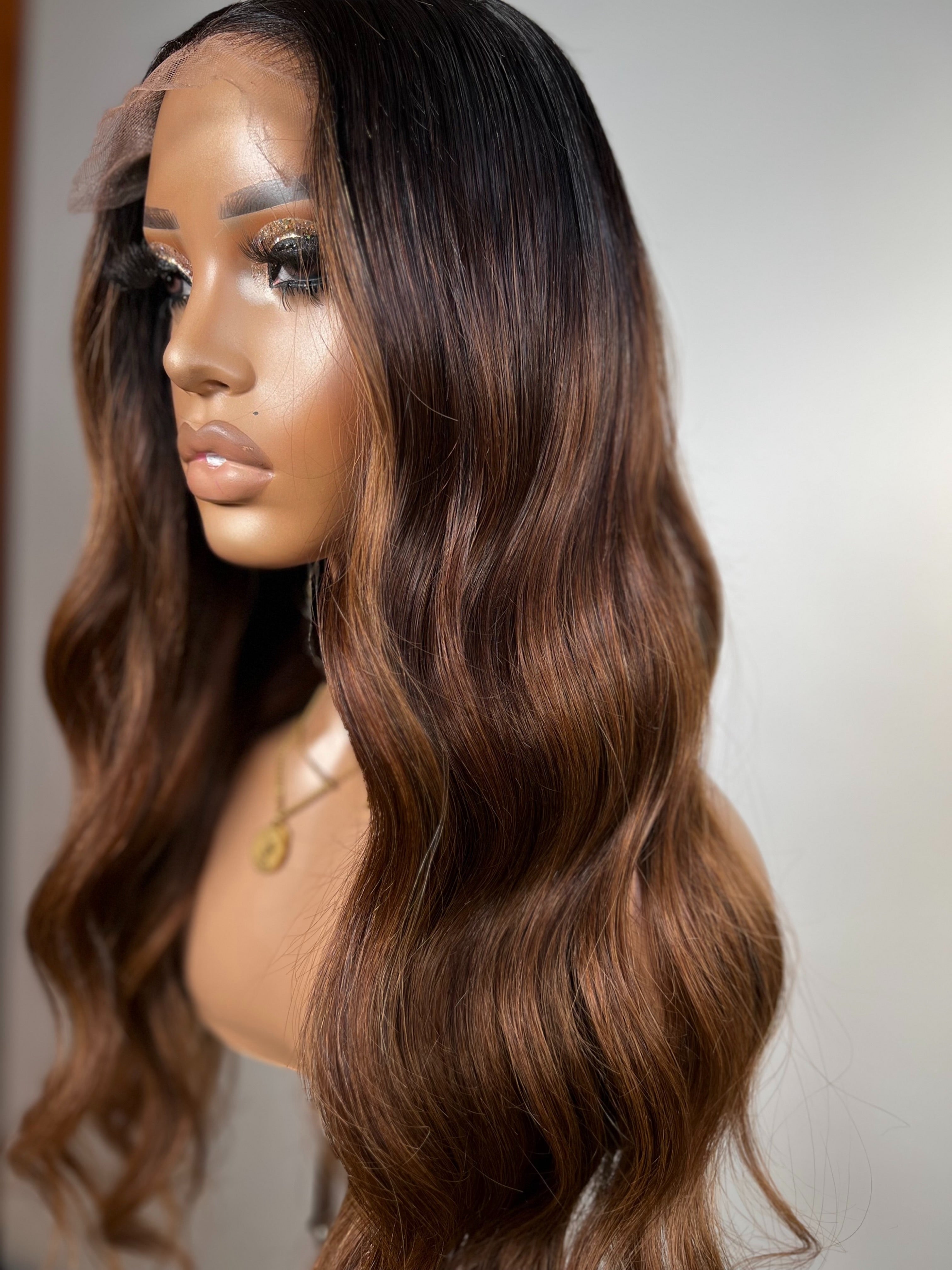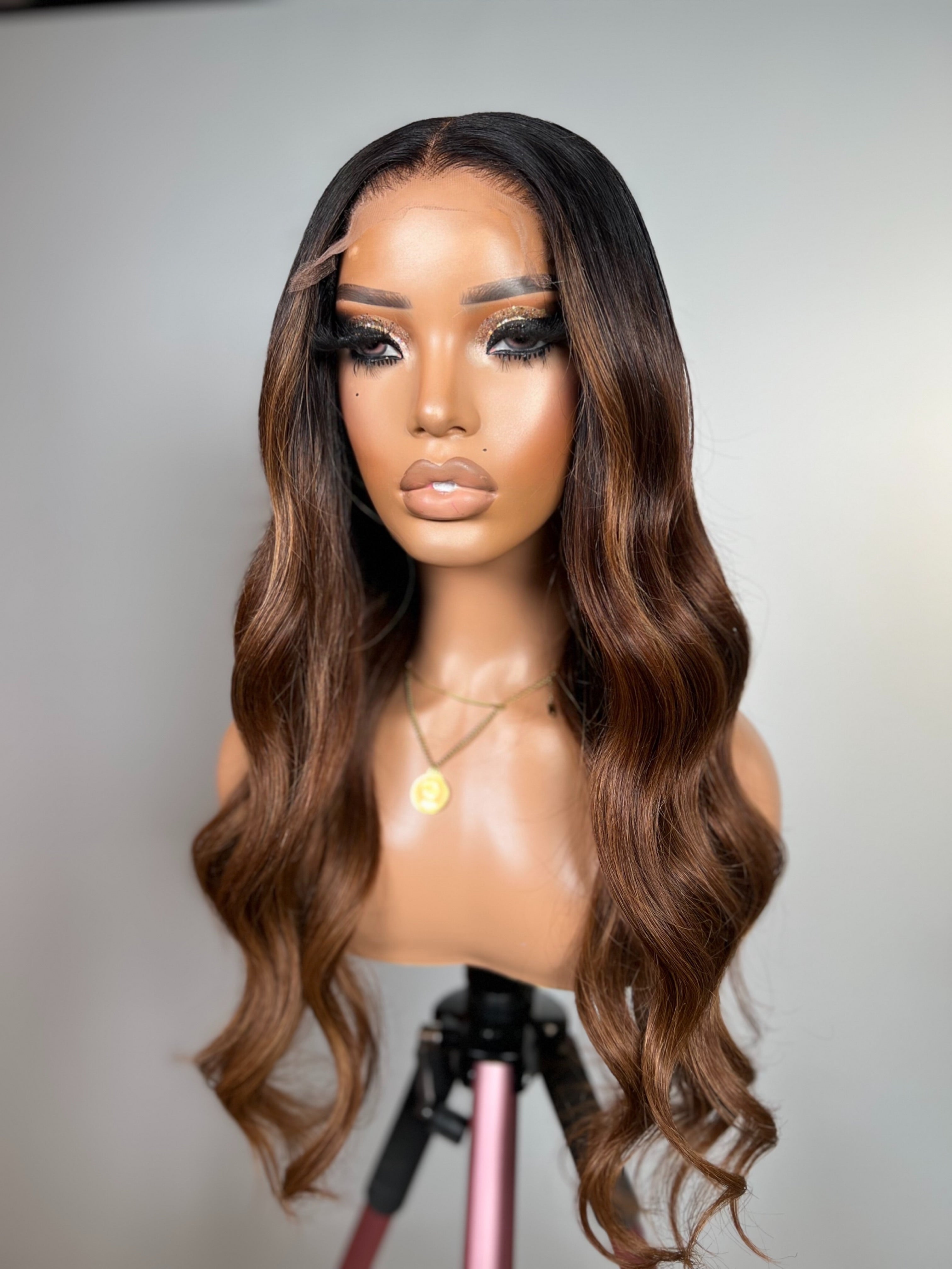 This wig features a dark chocolate base melting into subtle caramel tones, creating a natural, sun-kissed gradient. The soft waves add body and fluidity, framing the face with a gentle brightness that feels both polished and effortless. It’s a timeless brunette look with modern dimension the kind of piece that always looks put together.