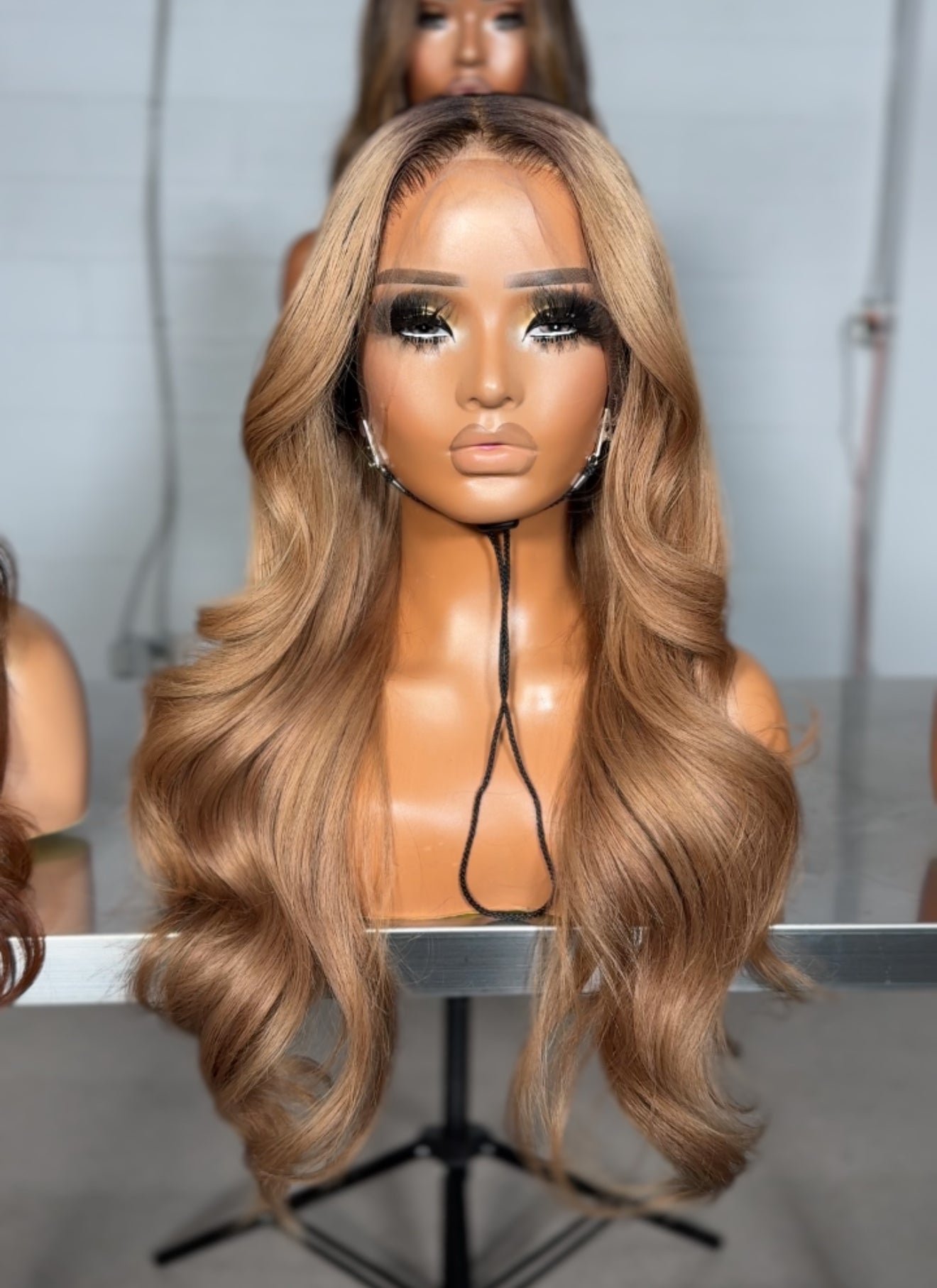 This unit features a deep espresso brown roots blended with subtle golden-bronde ribbons, creating a natural sunlit dimension. The face-framing highlights act as a gentle money piece, brightening and lifting the look without overpowering. Styled in loose waves, the layers provide movement and bounce, enhancing the glossy texture and making the overall look both wearable and striking. It’s a versatile style that transitions effortlessly from day to night.