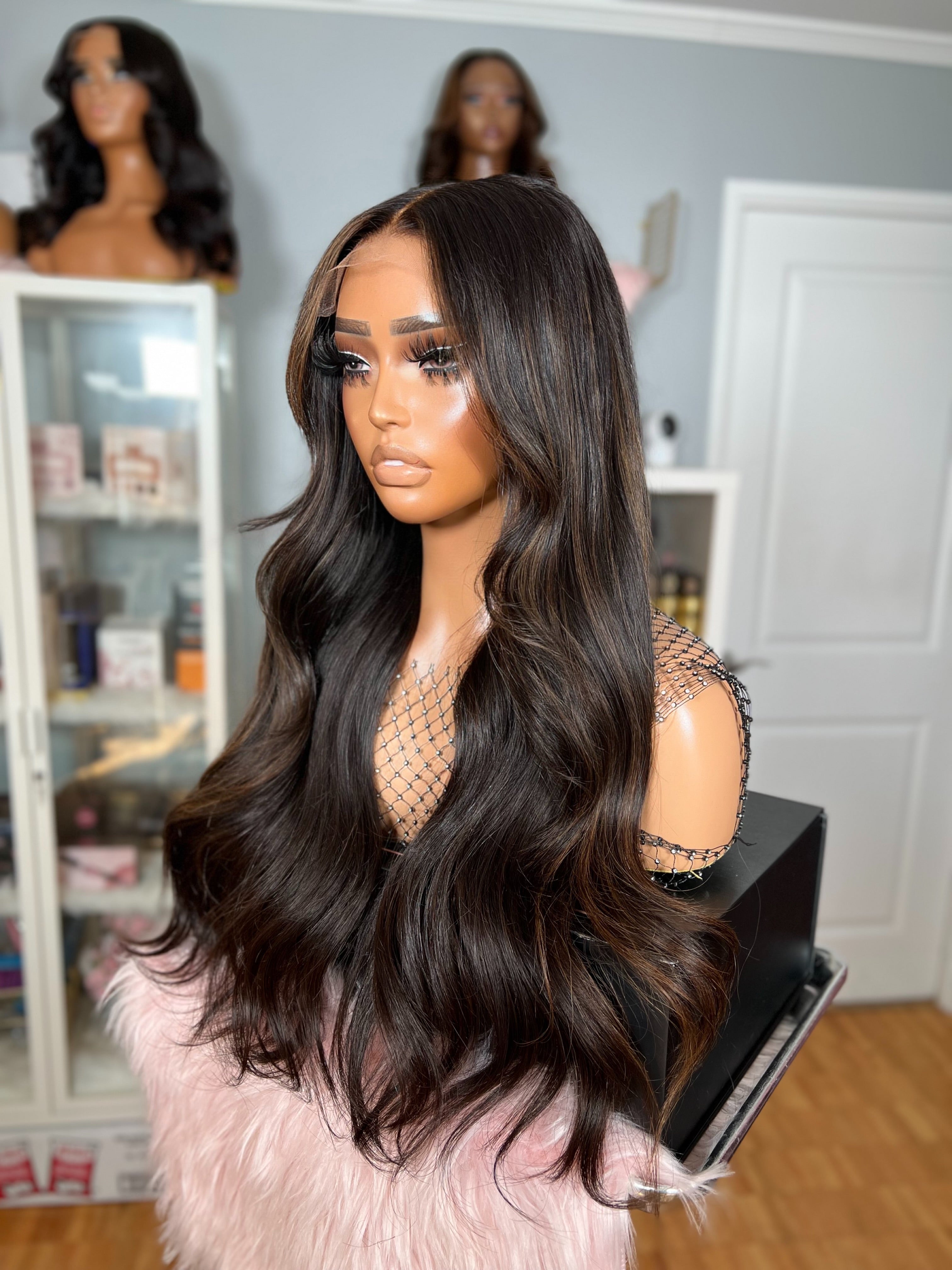 This unit features a deep espresso brown base kissed with soft, subtle caramel ribbons that catch the light beautifully. Styled in long, flowing waves, Bonnie frames the face effortlessly while maintaining a smooth, natural finish. The balanced density gives body without bulk, making it wearable every day yet striking enough for evenings out.