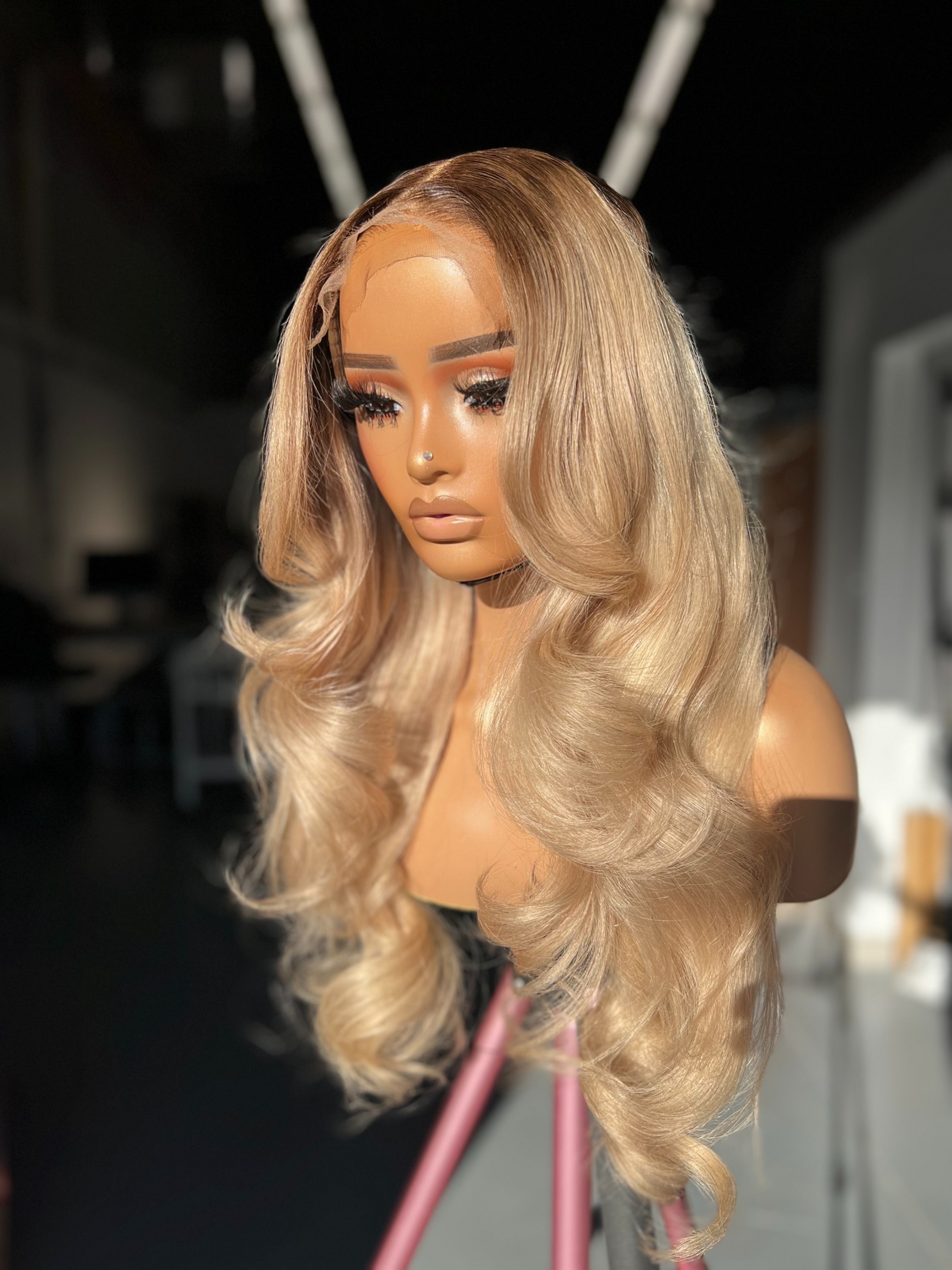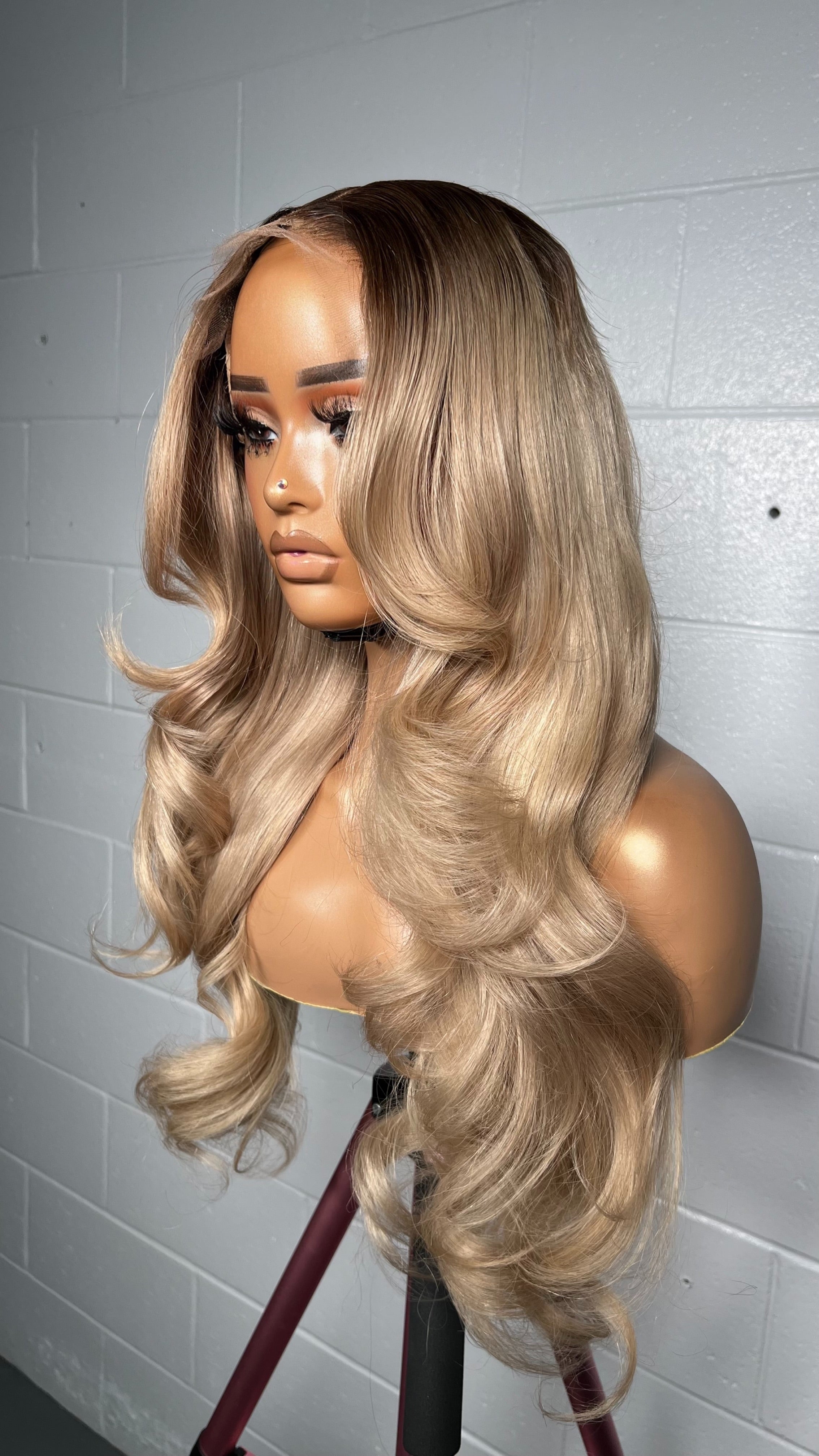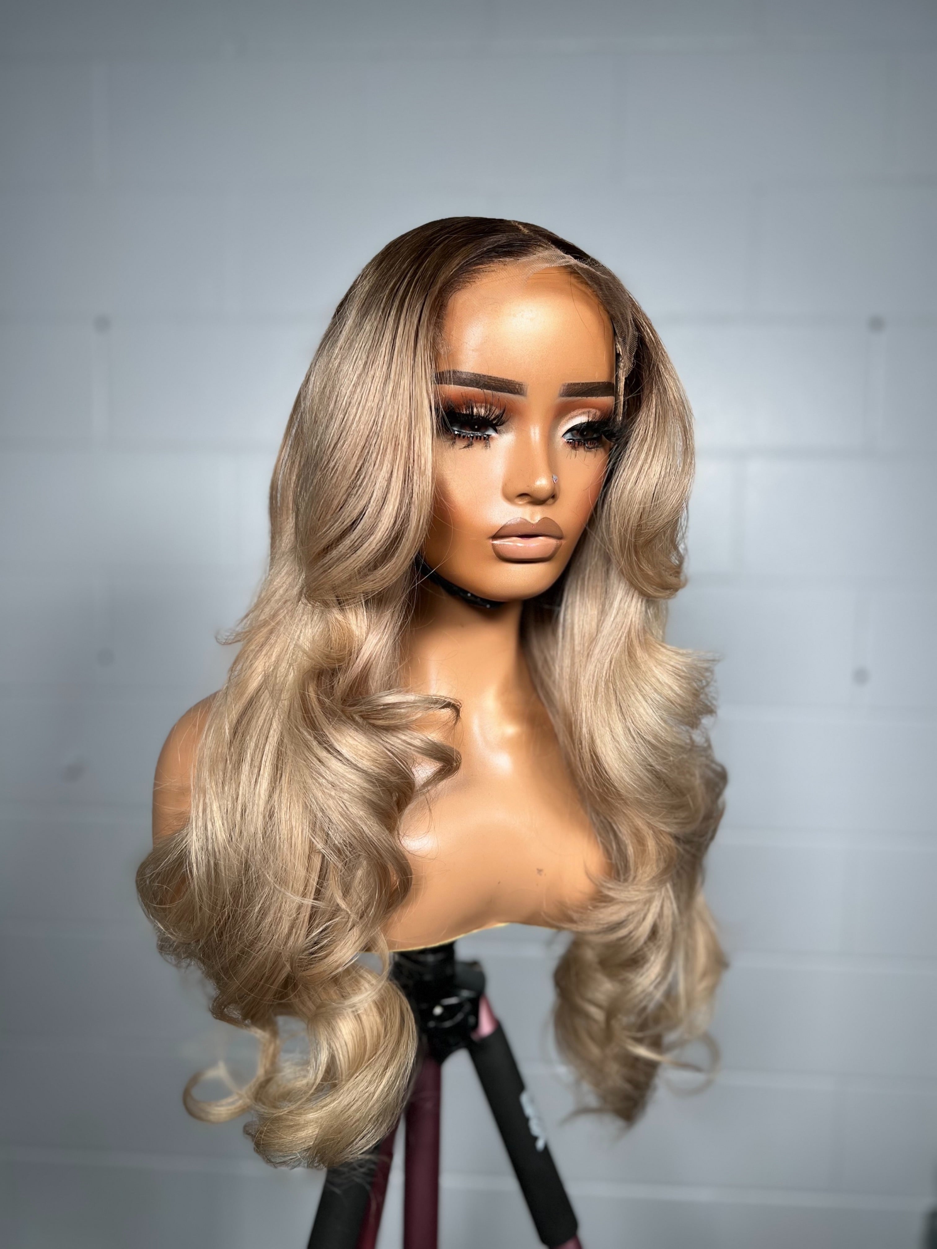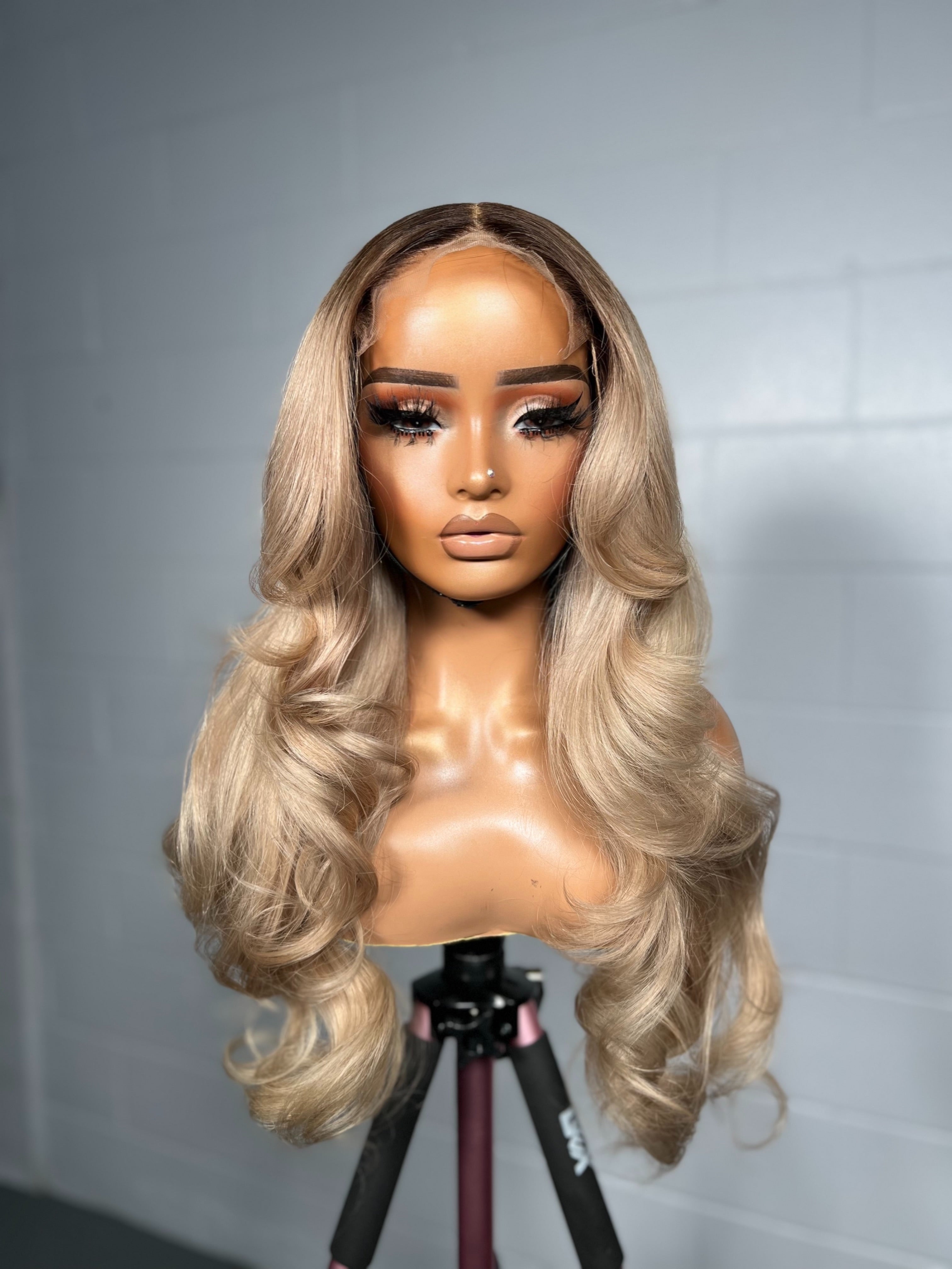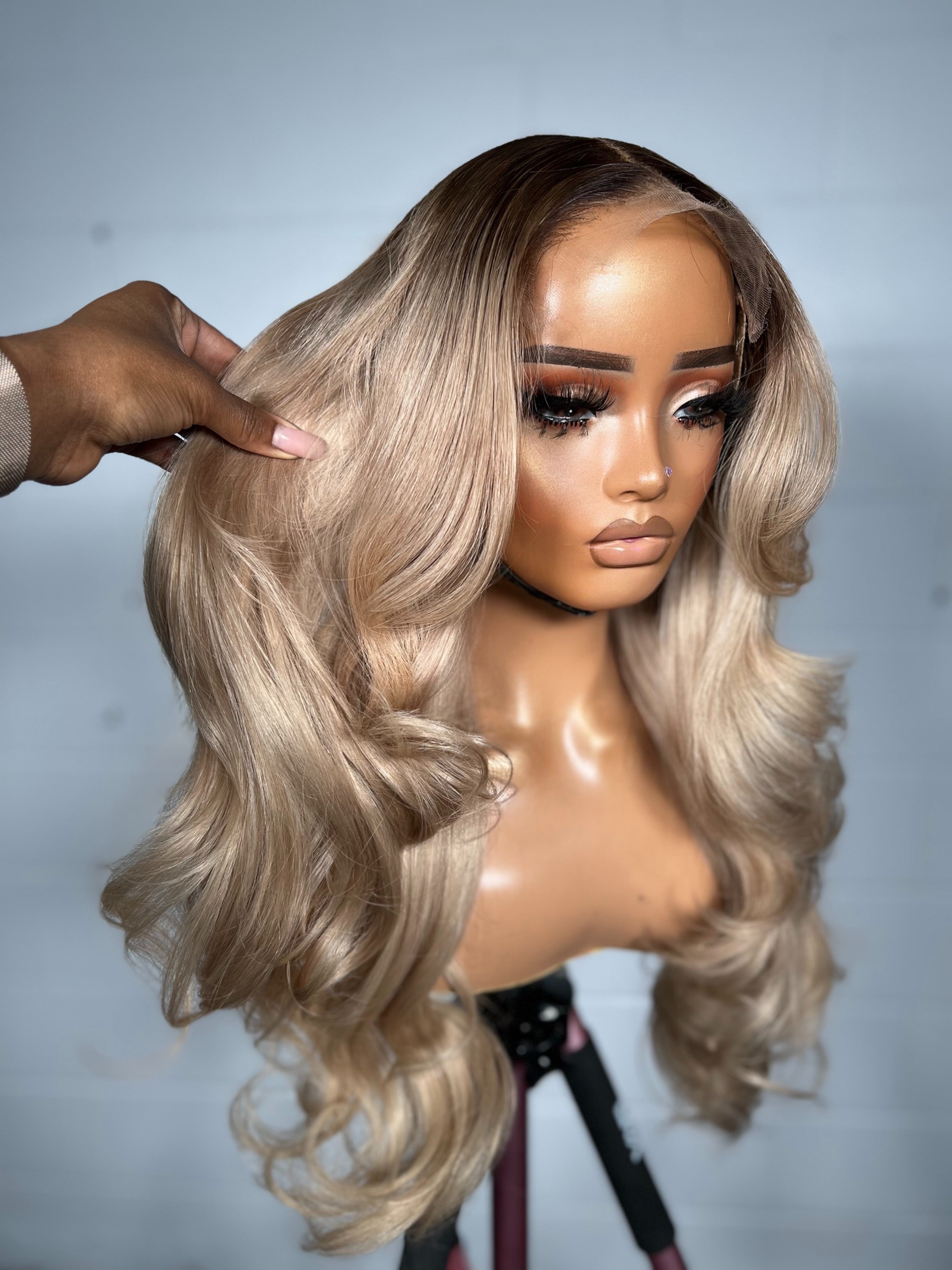 This unit features a seamless melt from a soft dark root into a luminous blend of honey blonde and beige tones. The layered curls create bounce and movement, giving the hair natural fullness without feeling heavy. The warm undertones brighten the complexion, while the face-framing pieces soften and flatter every angle. A look that balances sophistication with radiant freshness always camera-ready, always timeless.