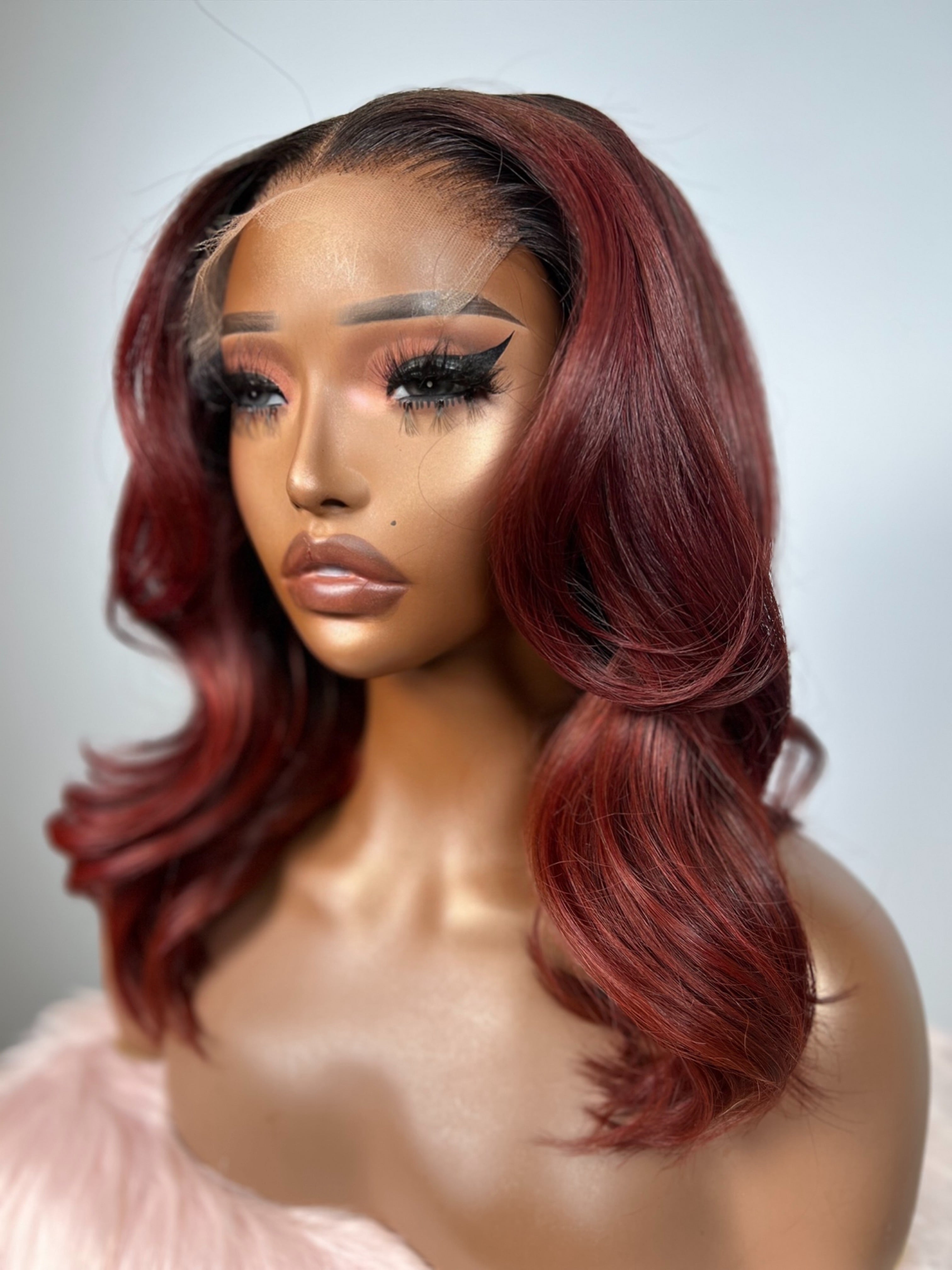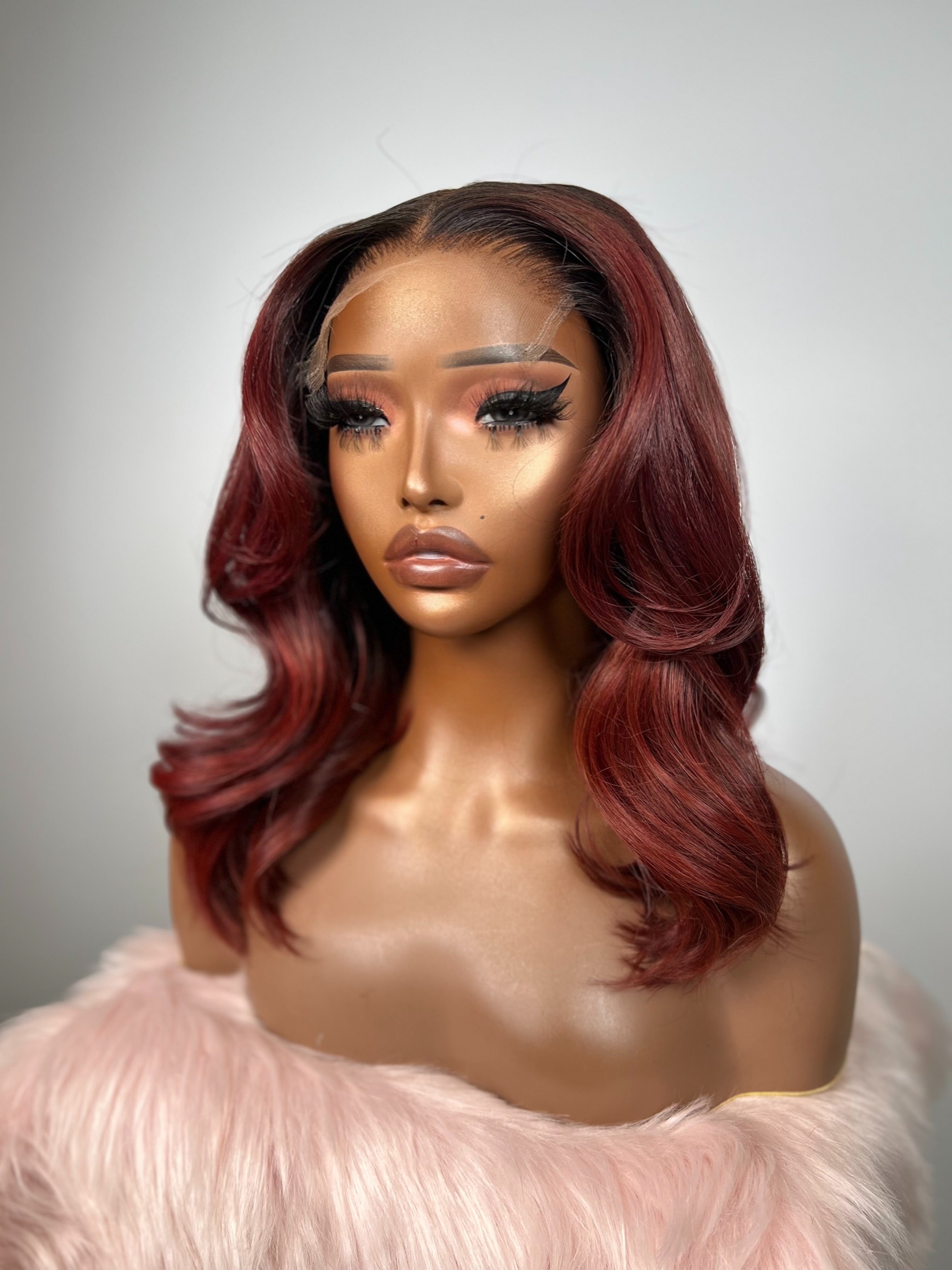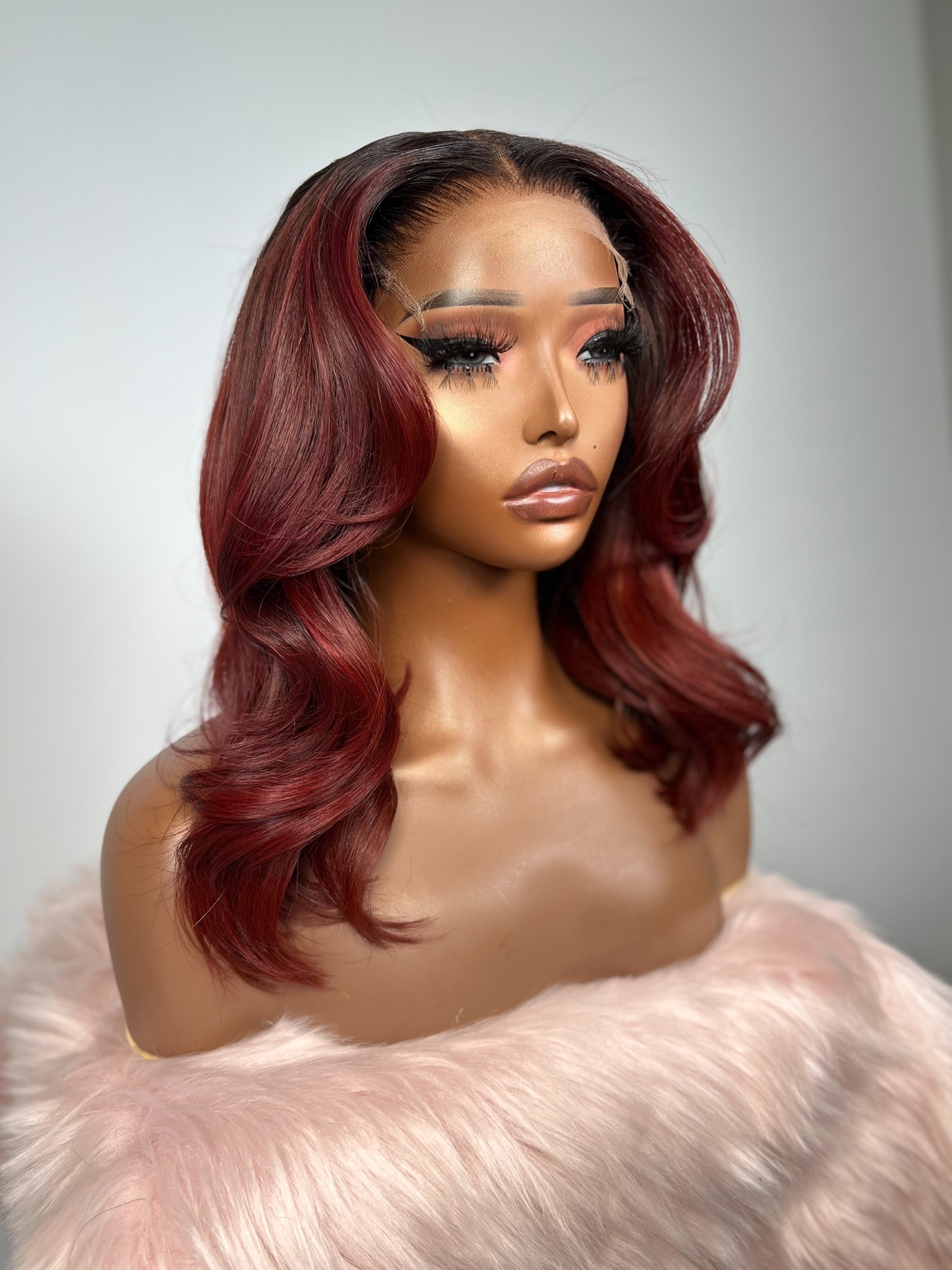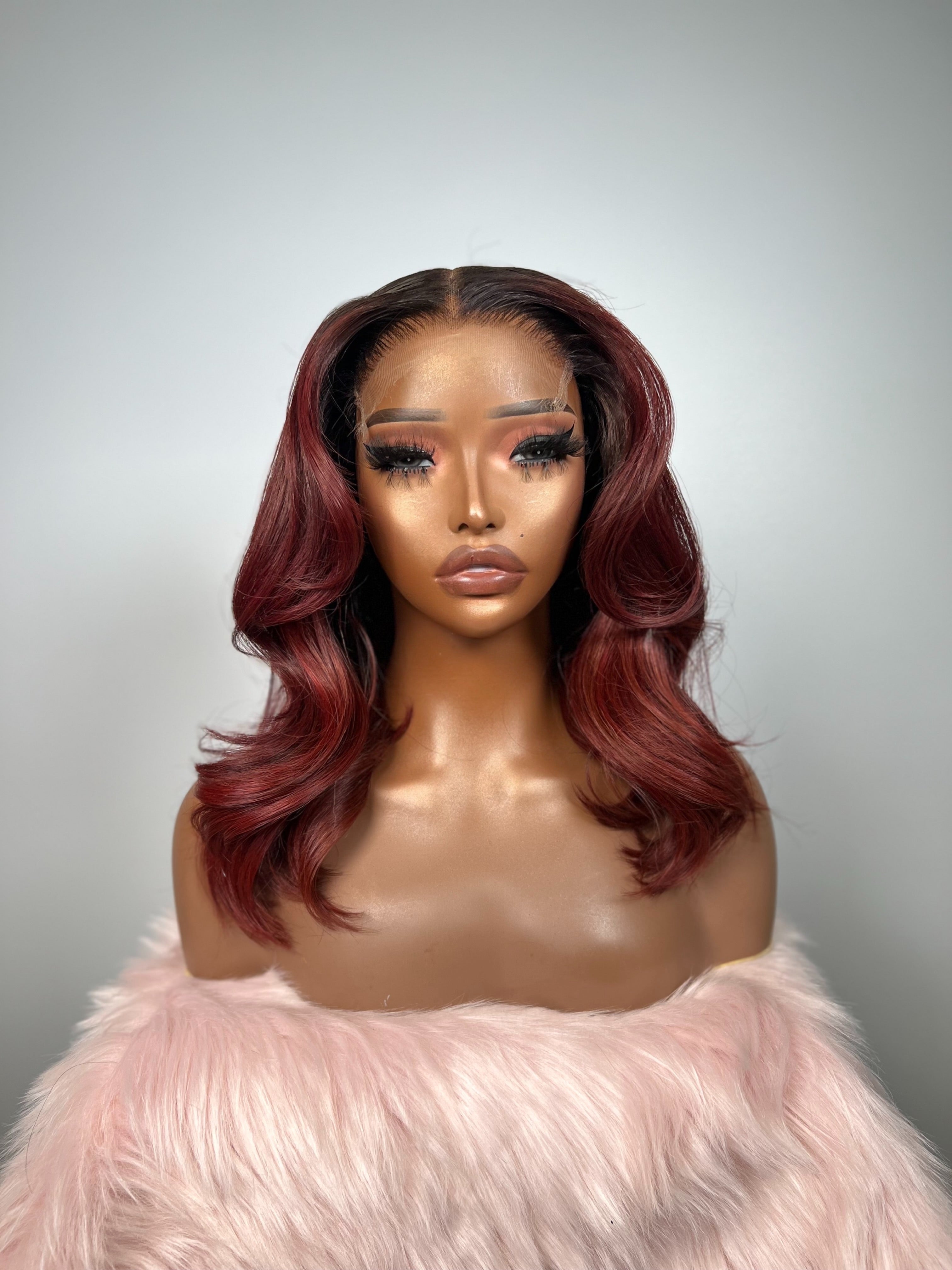 This unit features a deeper cinnamon-red base that melts into bright ruby tones, giving a warm, radiant finish. The color is vibrant but still elegant, with a soft transition that keeps everything wearable. Styled in medium-length waves with natural layers, she has movement, bounce, and that salon-fresh shine. It’s the kind of red that flatters instantly and lights up the face beautifully.