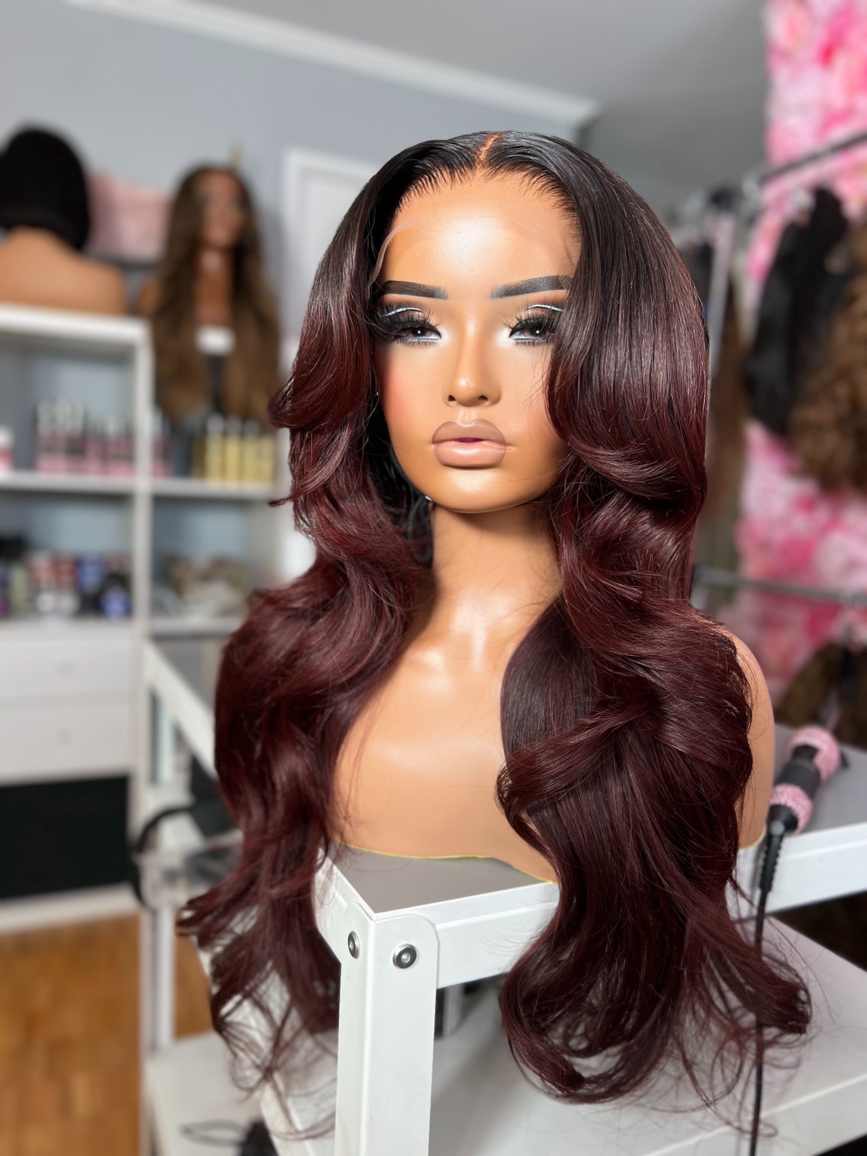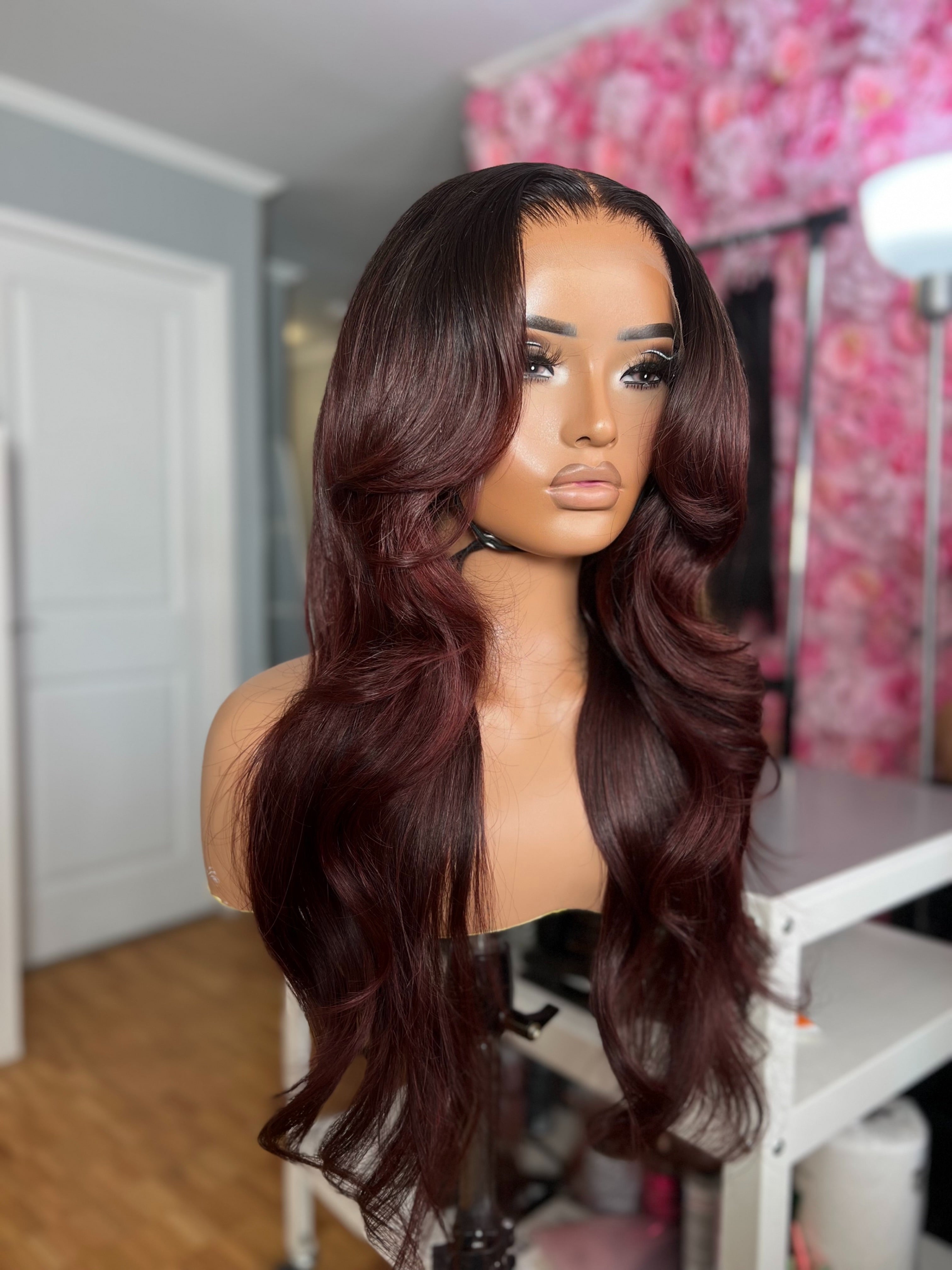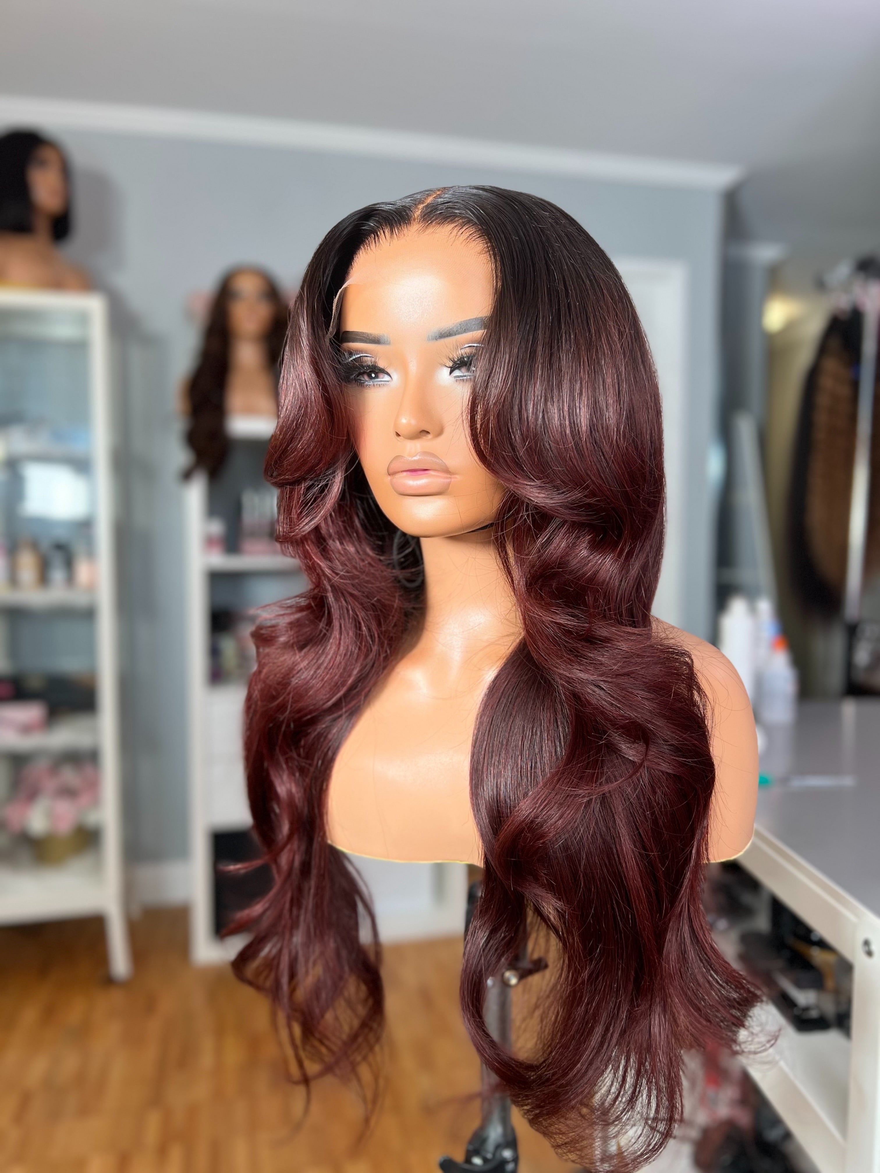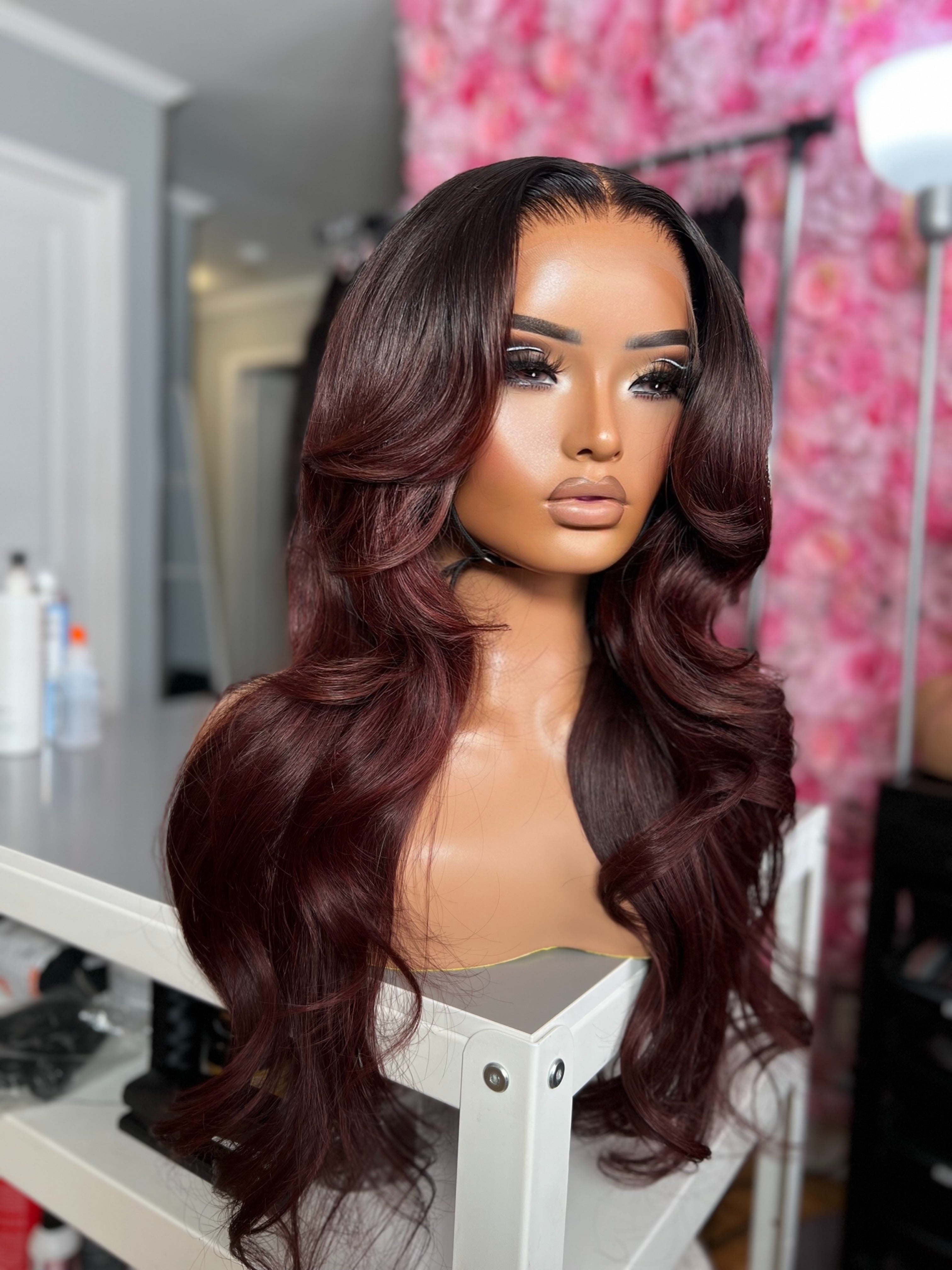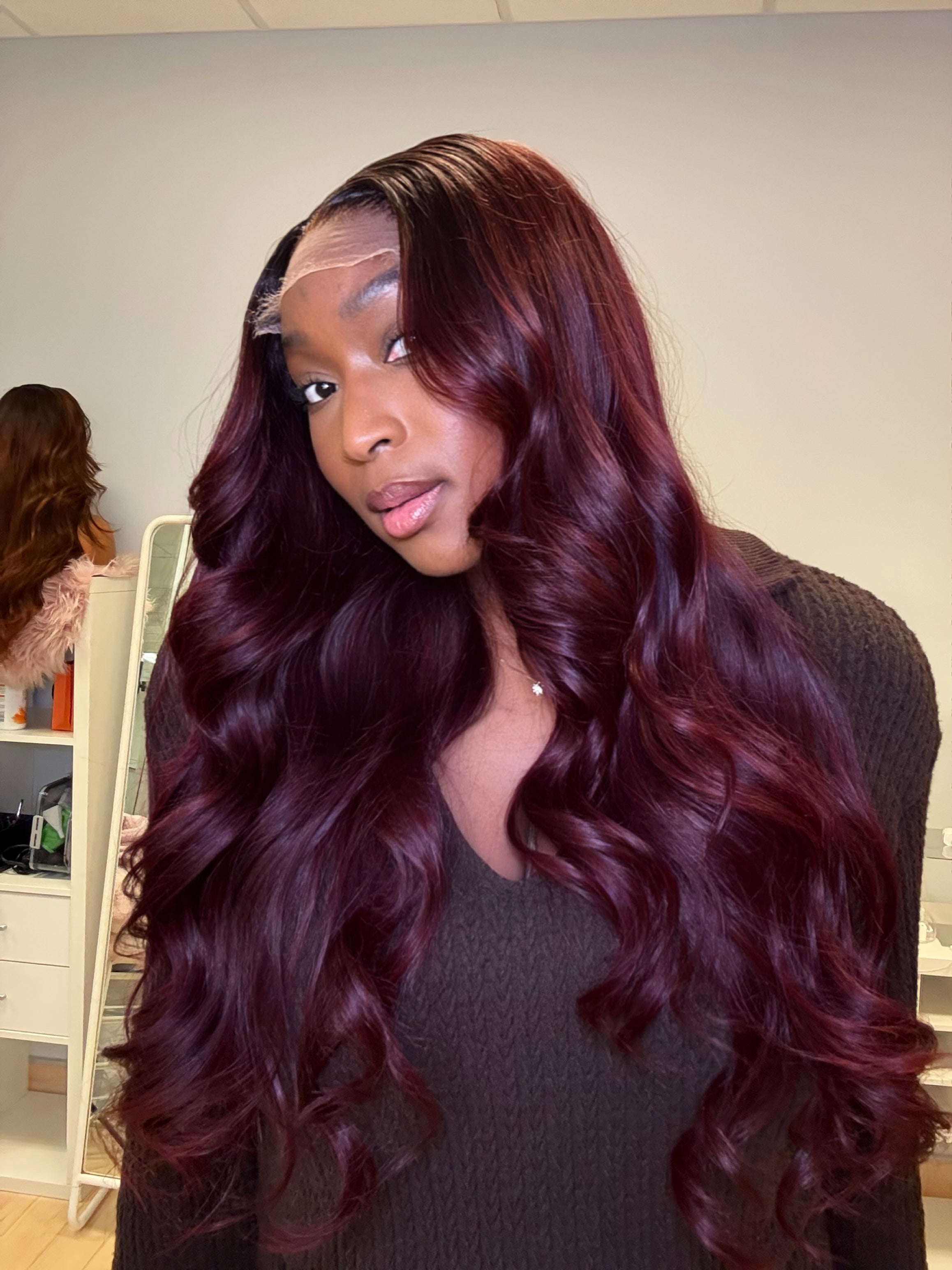 Scarlet features a deep, sultry burgundy base that glows with rich wine-red undertones. Styled in soft voluminous waves, the hair moves effortlessly, giving body and bounce while still looking polished. The warm depth of the color highlights every curve of the waves, creating a radiant, multidimensional look that feels timeless and unforgettable.