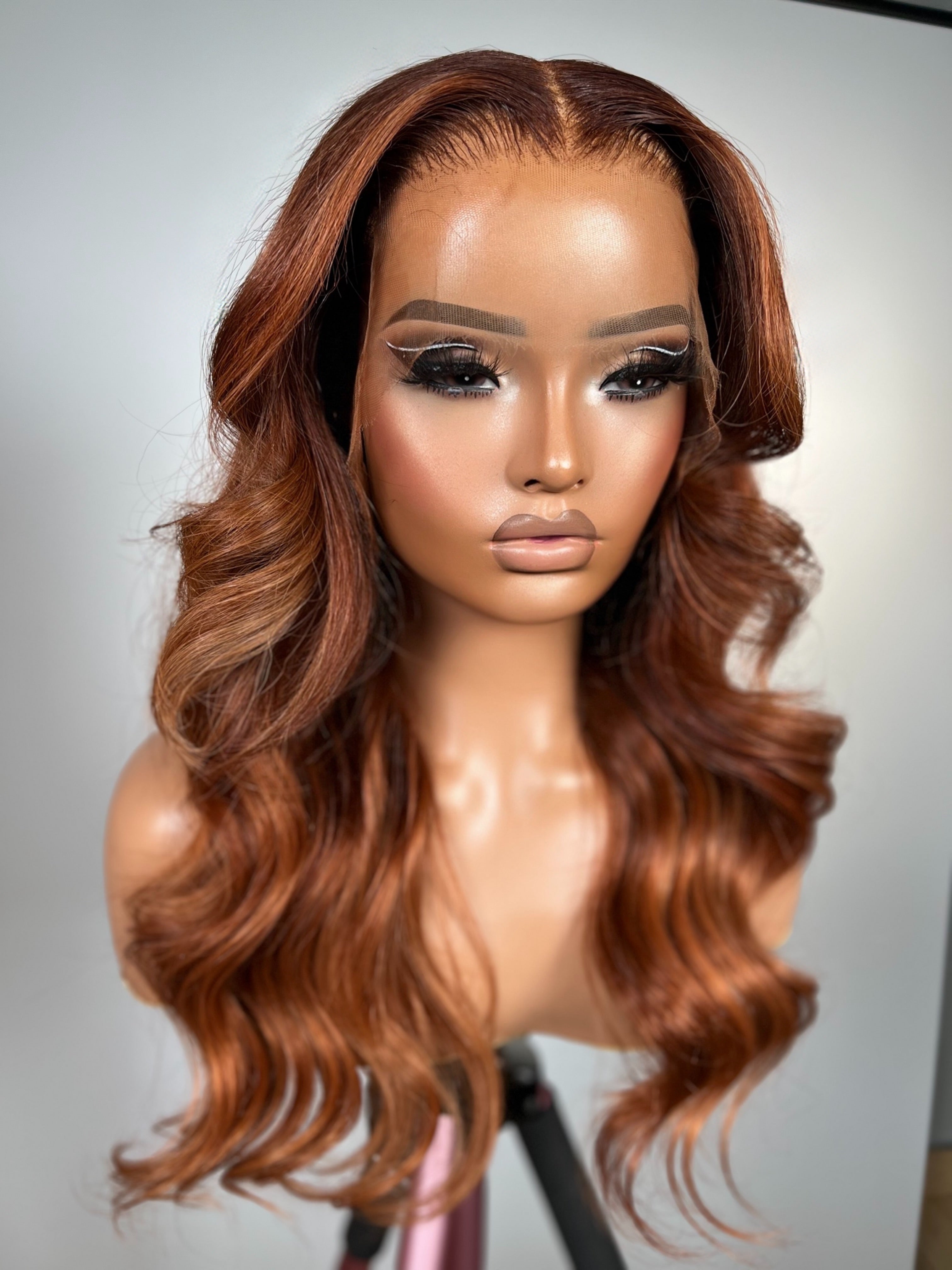This unit features a deep copper base infused with warm amber undertones, creating a radiant, sunlit effect that enhances every complexion. Styled in loose cascading waves, it offers bounce and dimension while maintaining softness and flow. The center part and sleek finish add a refined edge effortless yet striking.