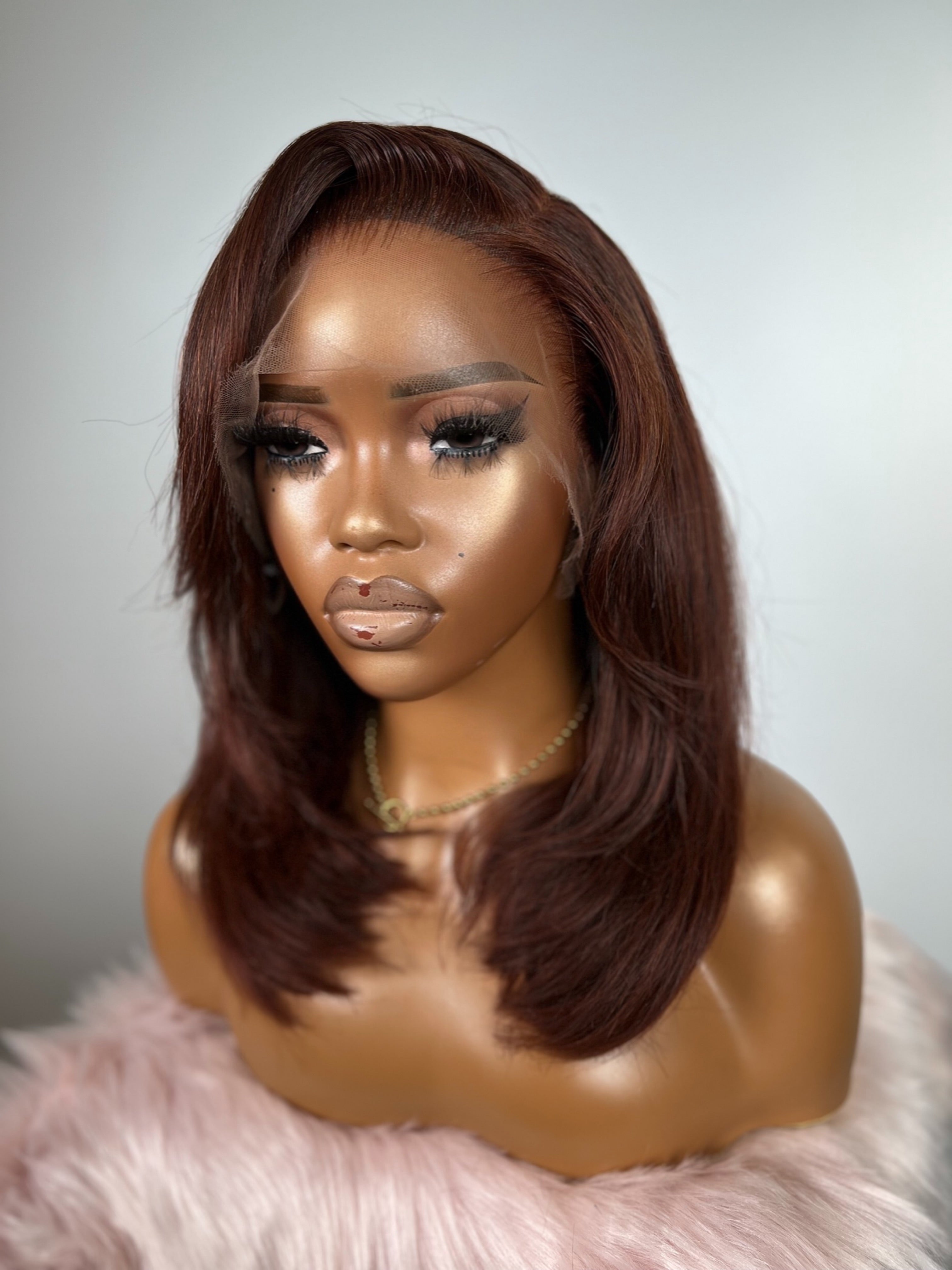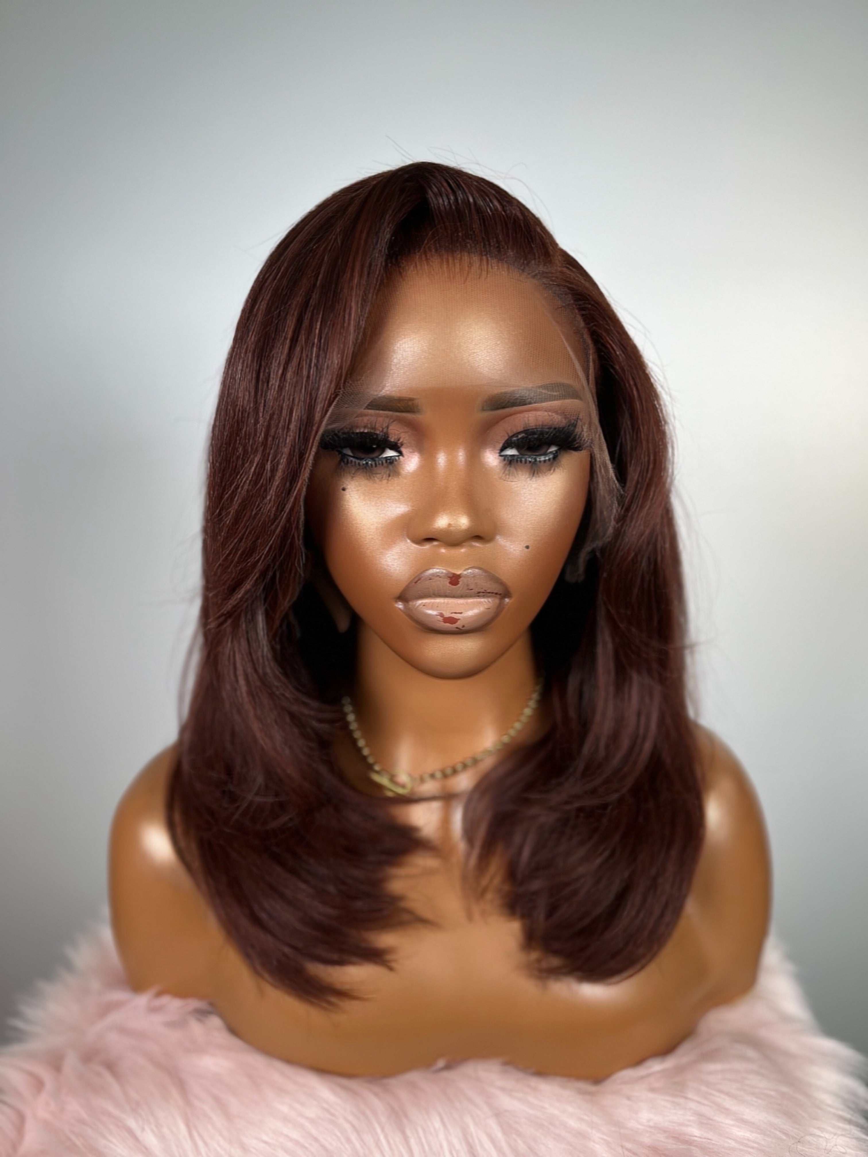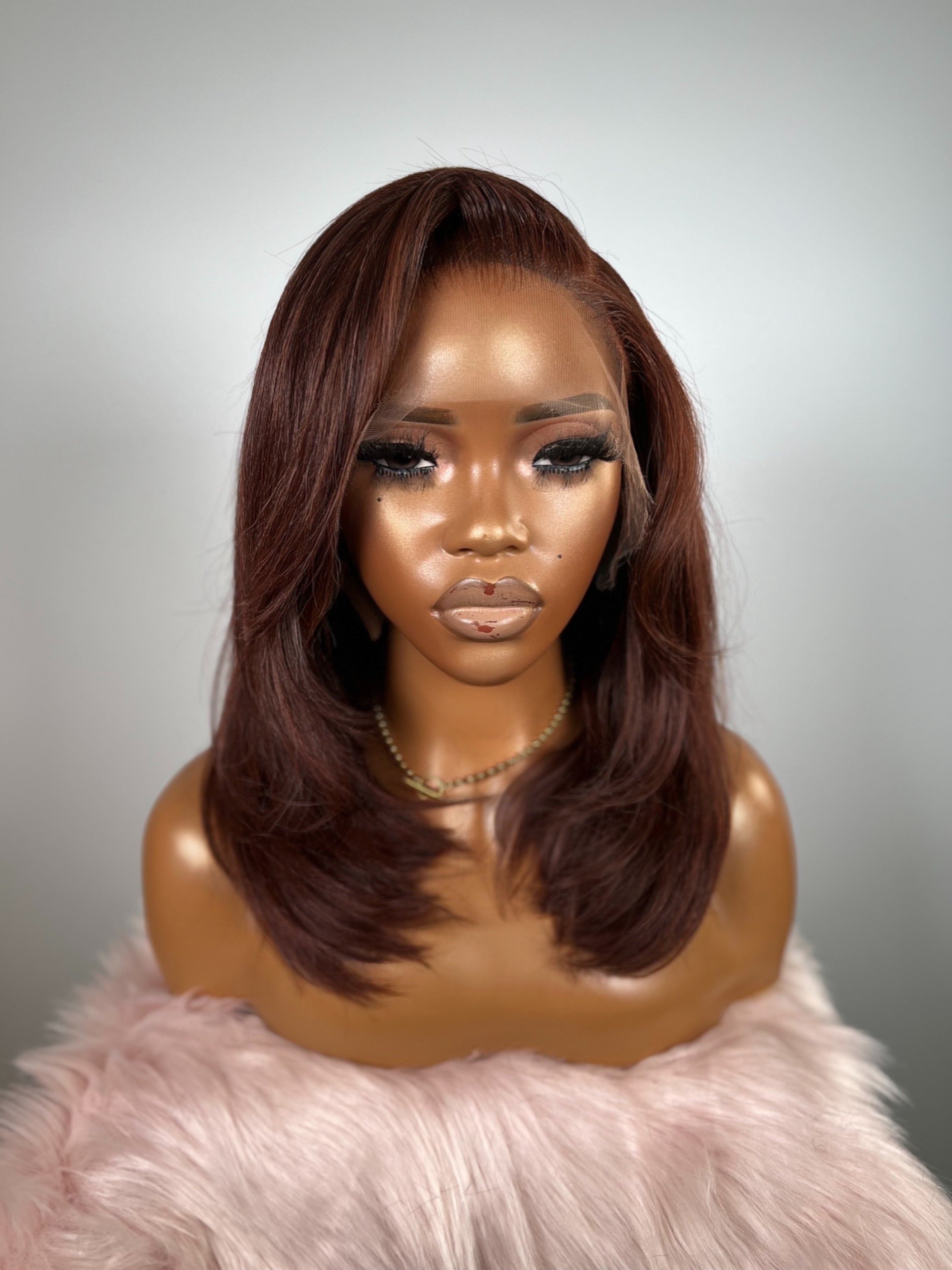 This wig features a rich chestnut auburn blend, deeper at the roots and melting into warm cinnamon tones through the mid-lengths. The colour catches the light softly, giving dimension and a healthy, radiant sheen.