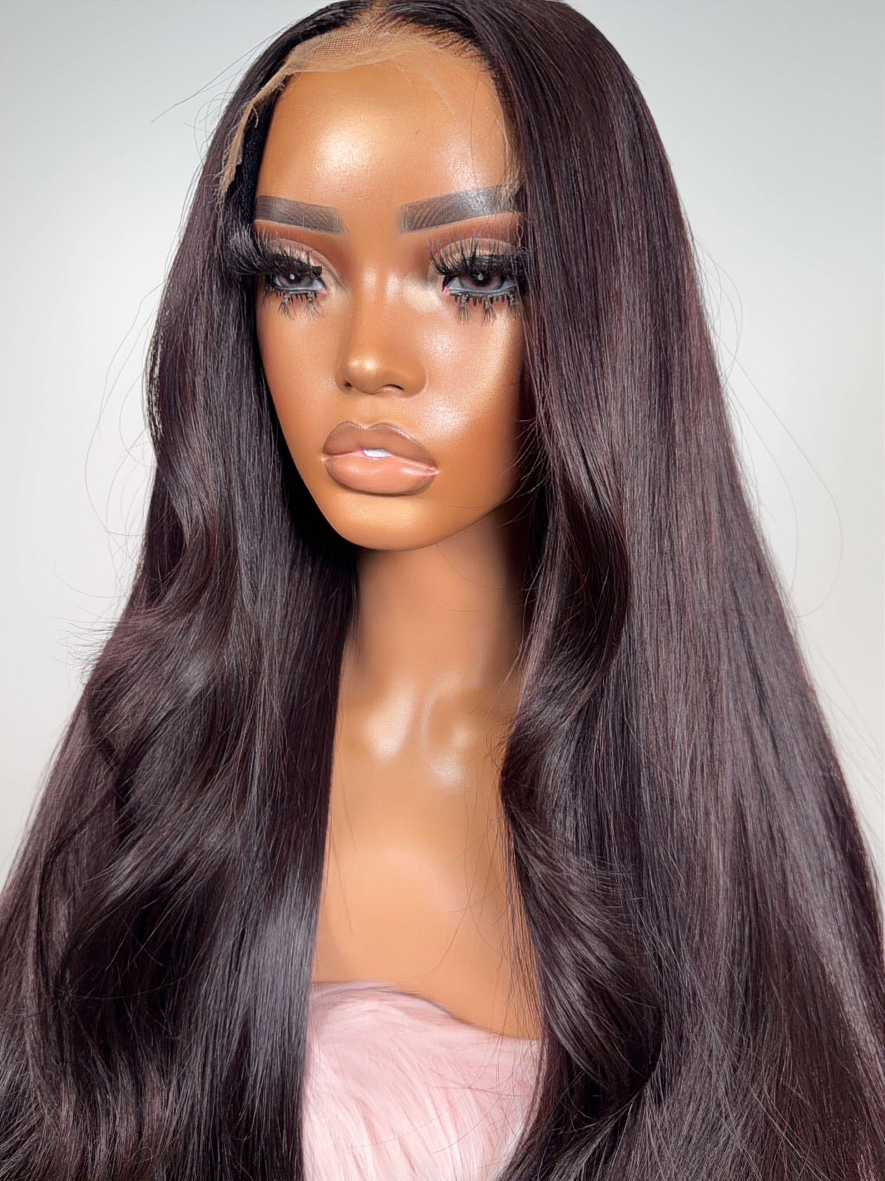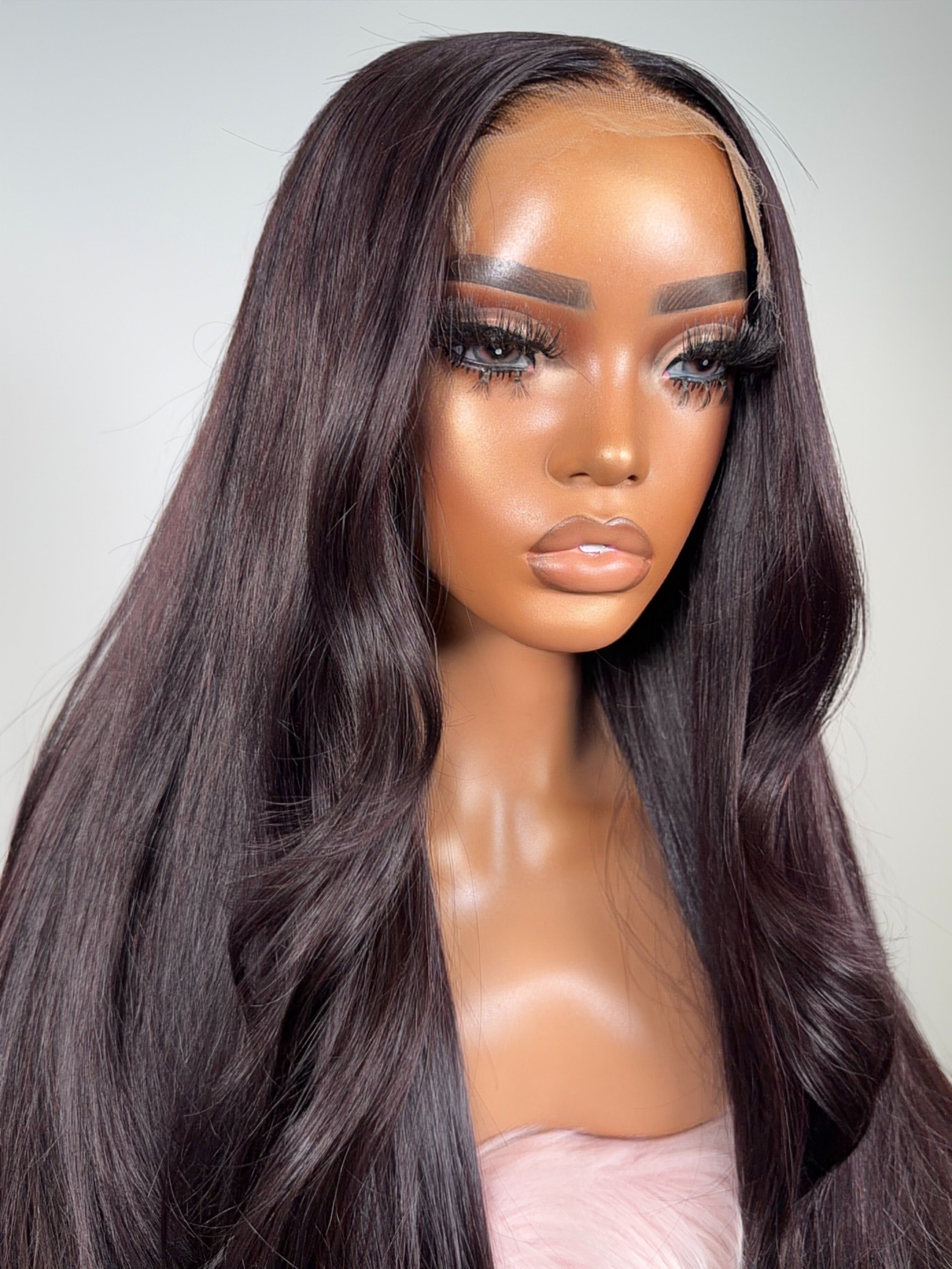 Nadine is a 5x5 HD very thin transparent lace closure wig, Medium cap (22–23”), 28–30” straight cut, made with 3.5 bundles (24” bundles used for the pictured style).
