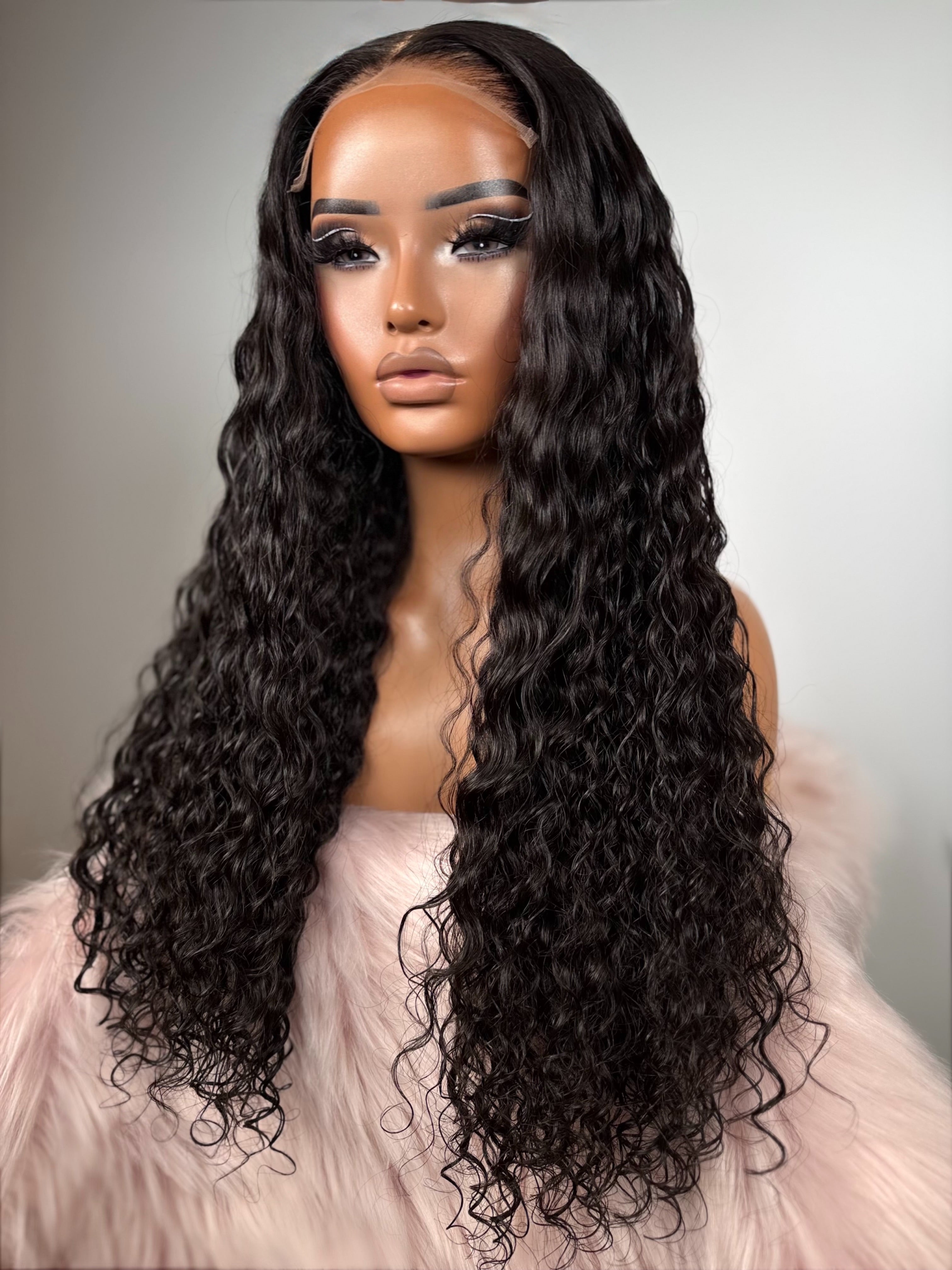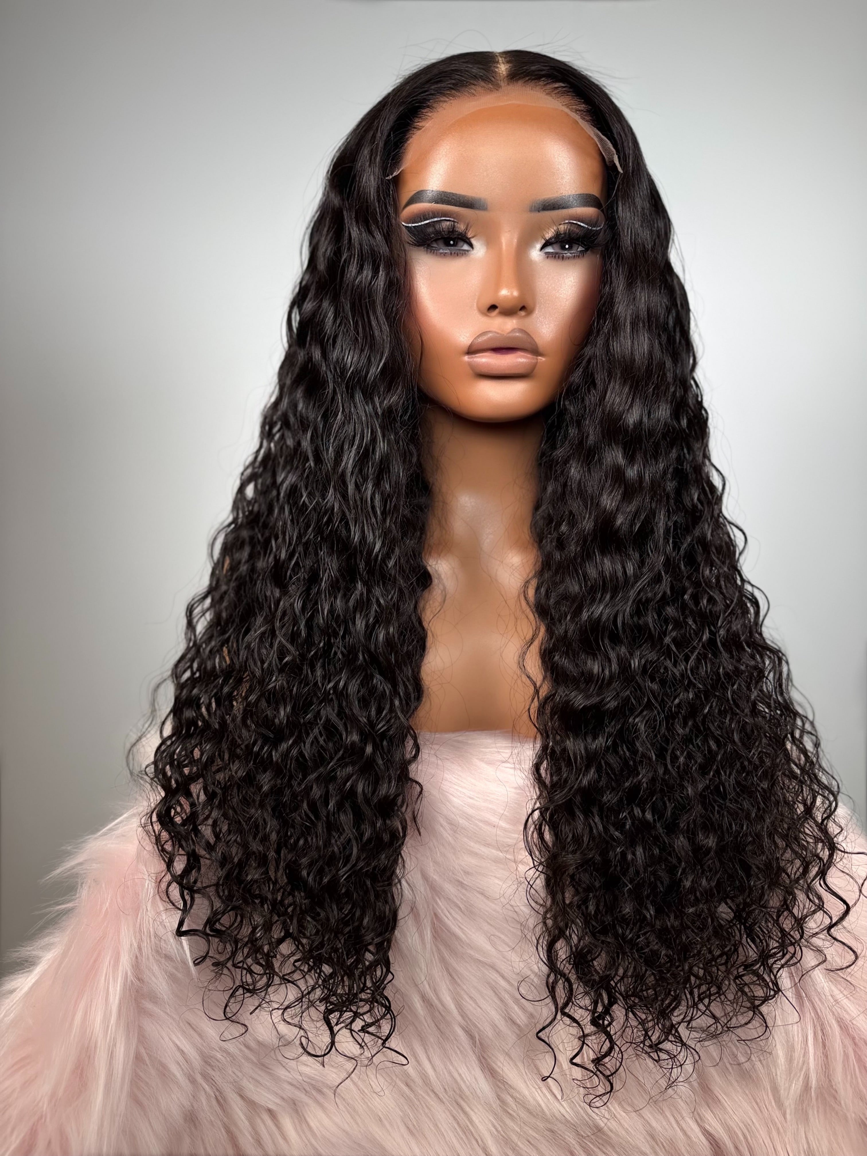 This unit features a deep natural black shade with a healthy, glossy finish that makes the curls look full and vibrant. Styled in long, defined water-wave curls, it delivers a soft, wet-look texture with beautiful movement and natural volume. The middle part keeps it clean and balanced, while the length gives that dramatic, luxurious effect that instantly elevates your entire look.