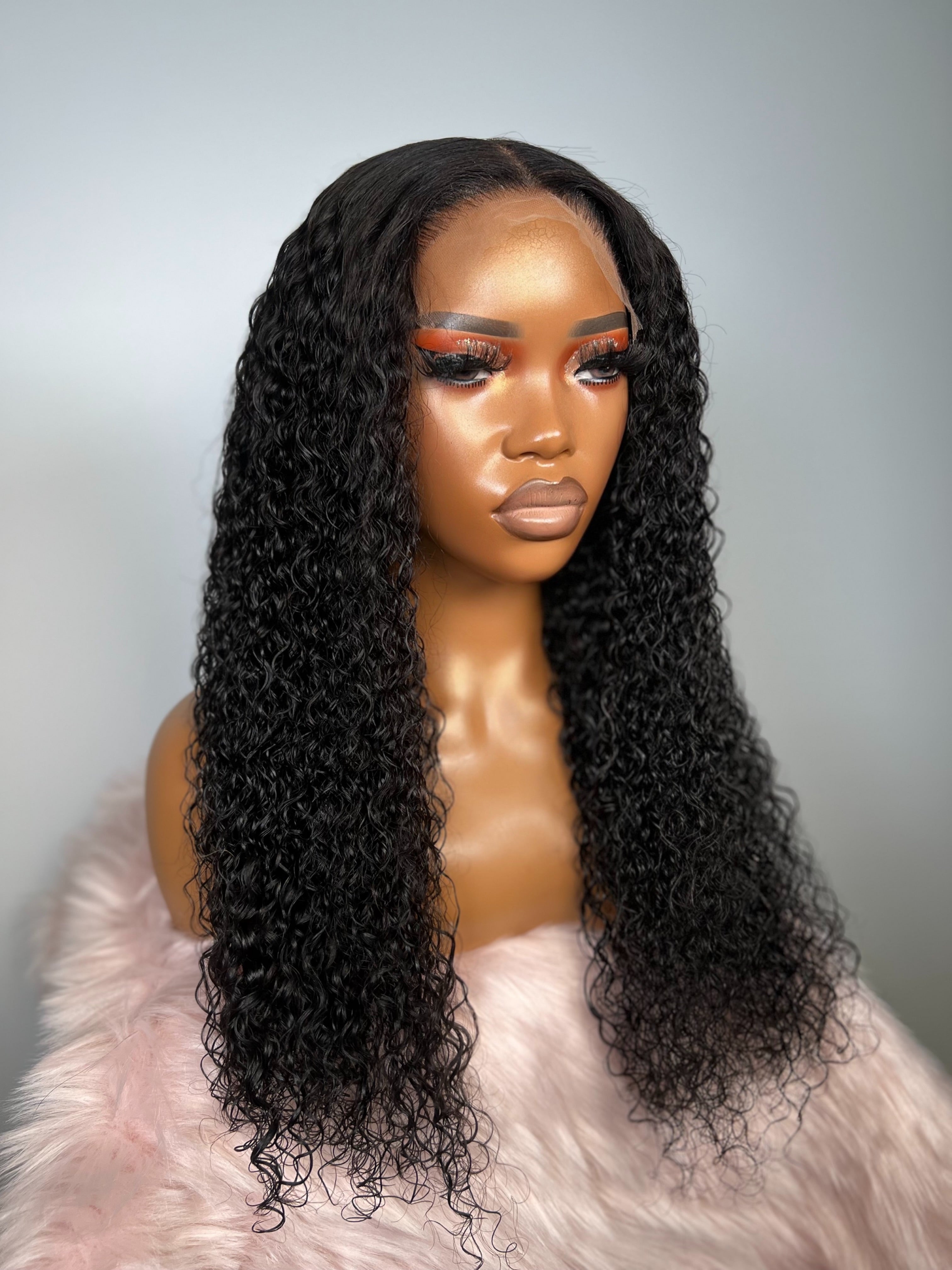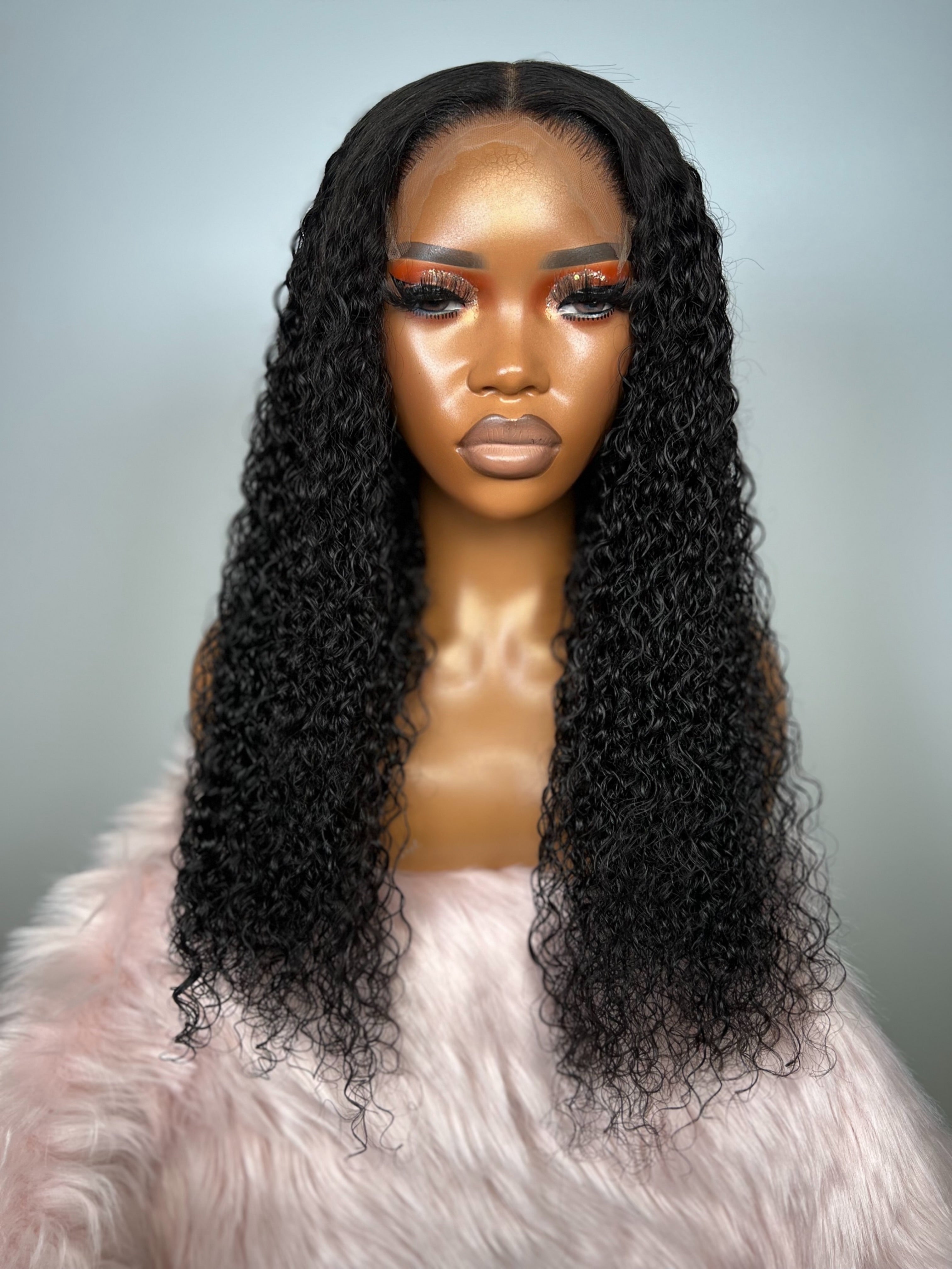 This wig features a rich natural black shade with a healthy, defined curl pattern from root to ends. The curls are tight, springy, and full of movement, offering volume without heaviness. Its center part keeps the look clean and timeless while the texture adds softness and dimension.