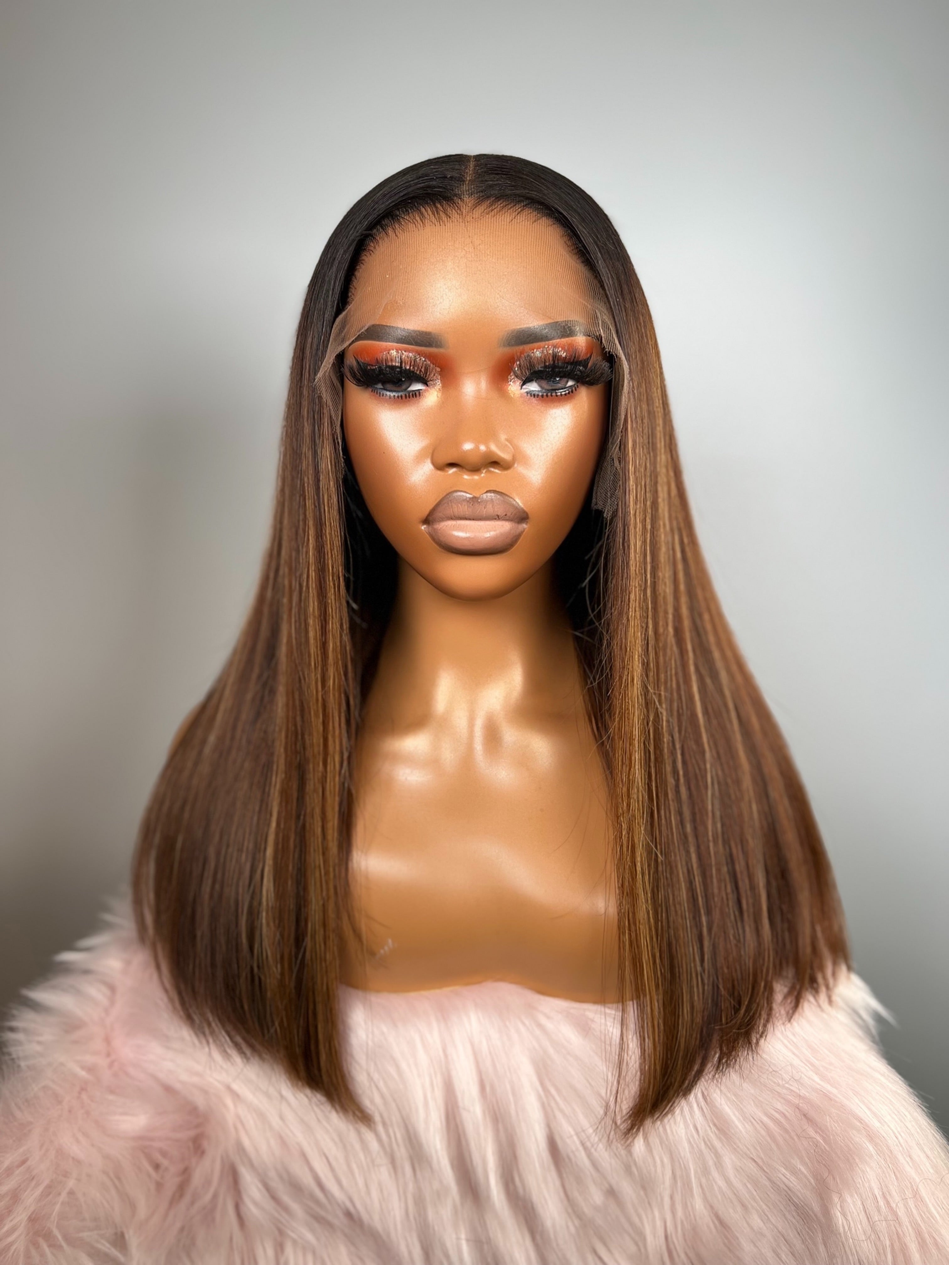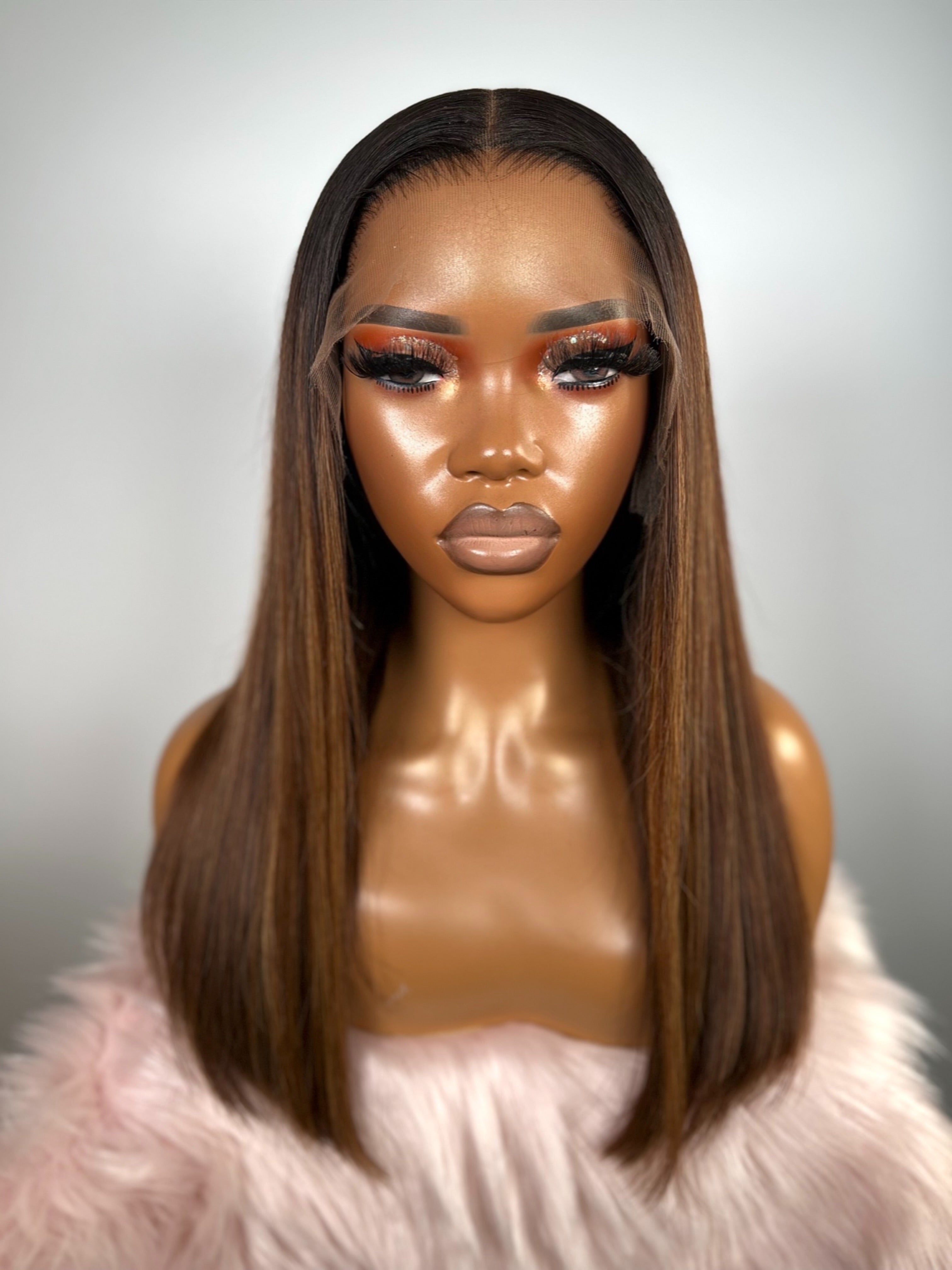 Aurora features a rich espresso brown base that melts seamlessly into warm caramel ribbons strategically placed to brighten and contour the face. The front highlights are soft yet defined, giving that “sun-touched” dimension without overpowering the look.