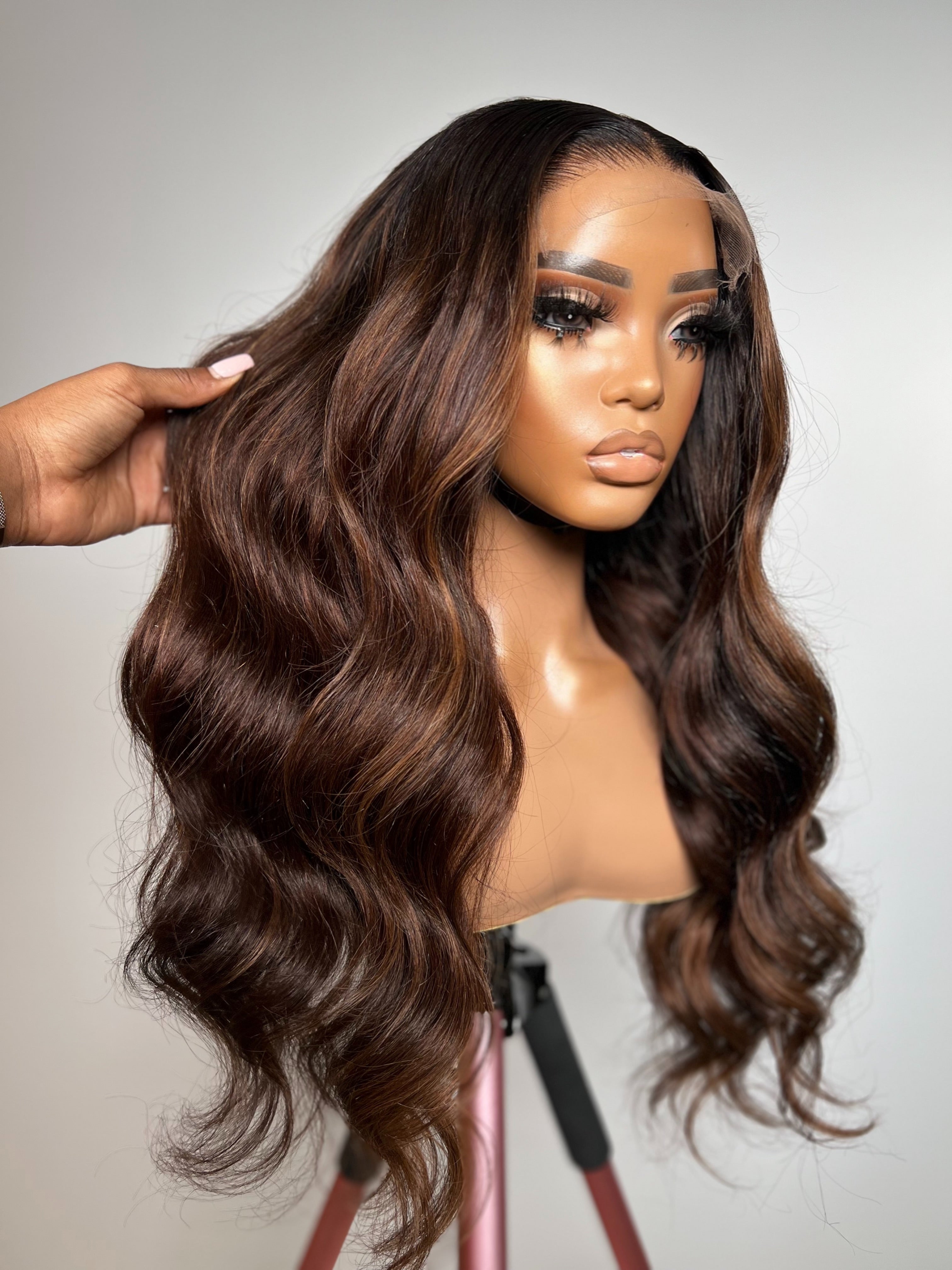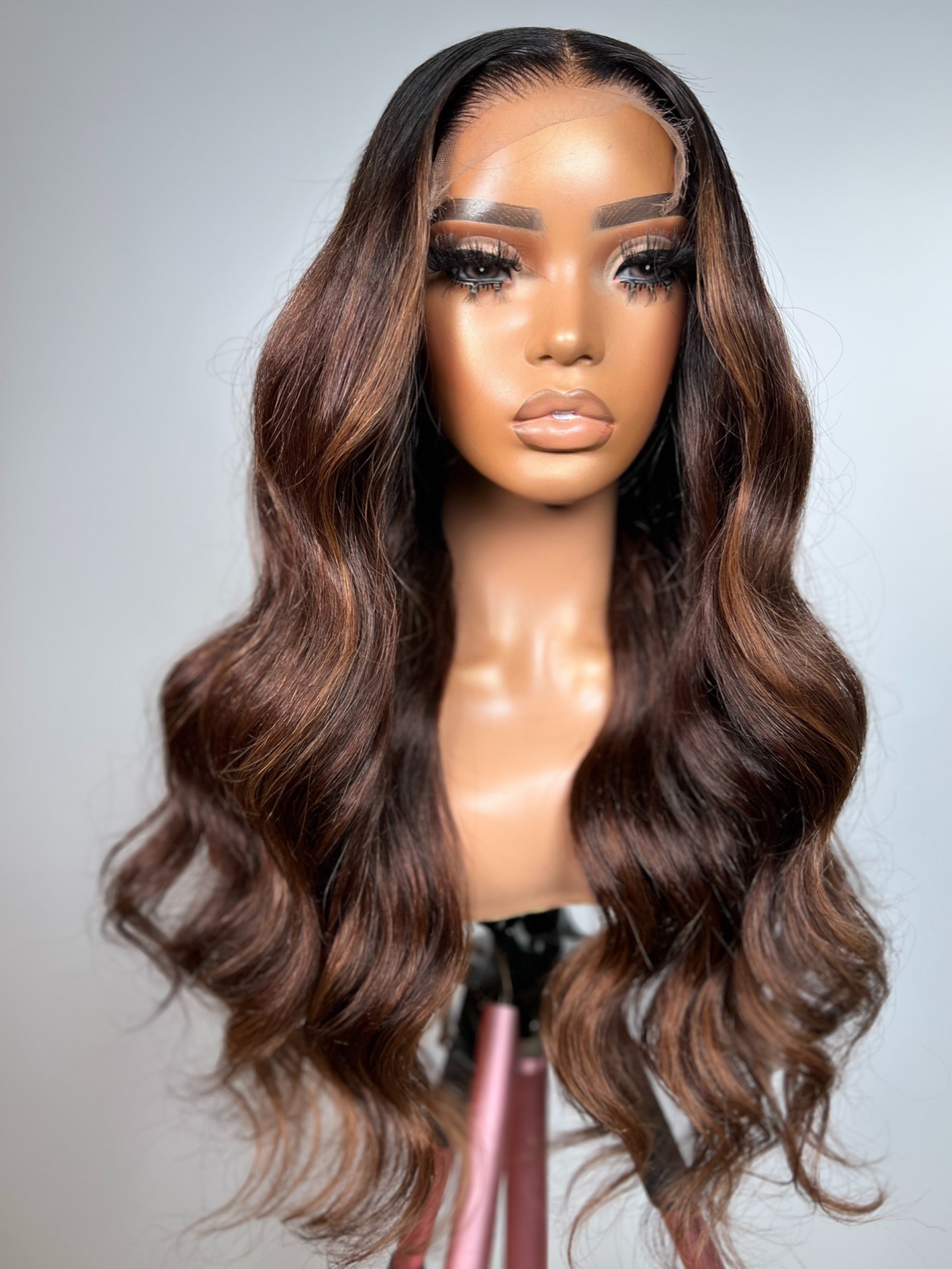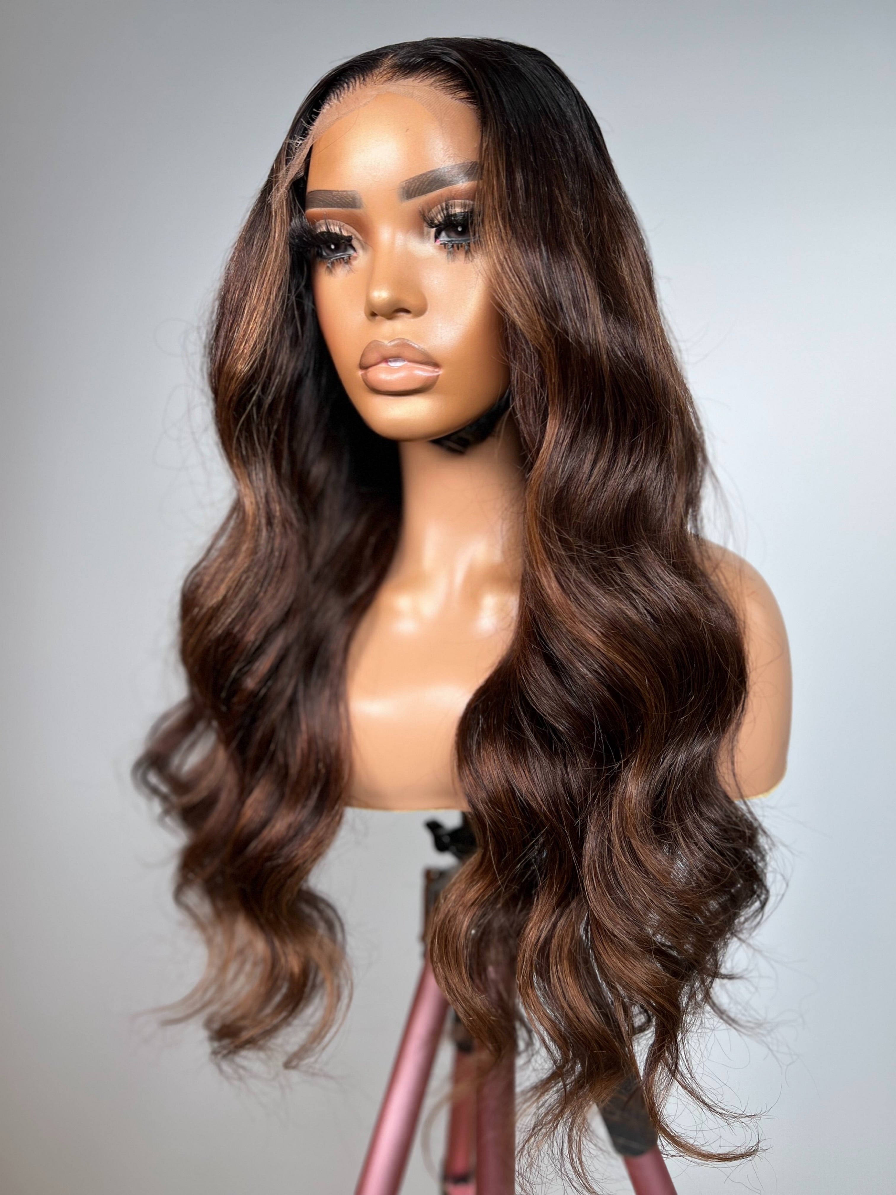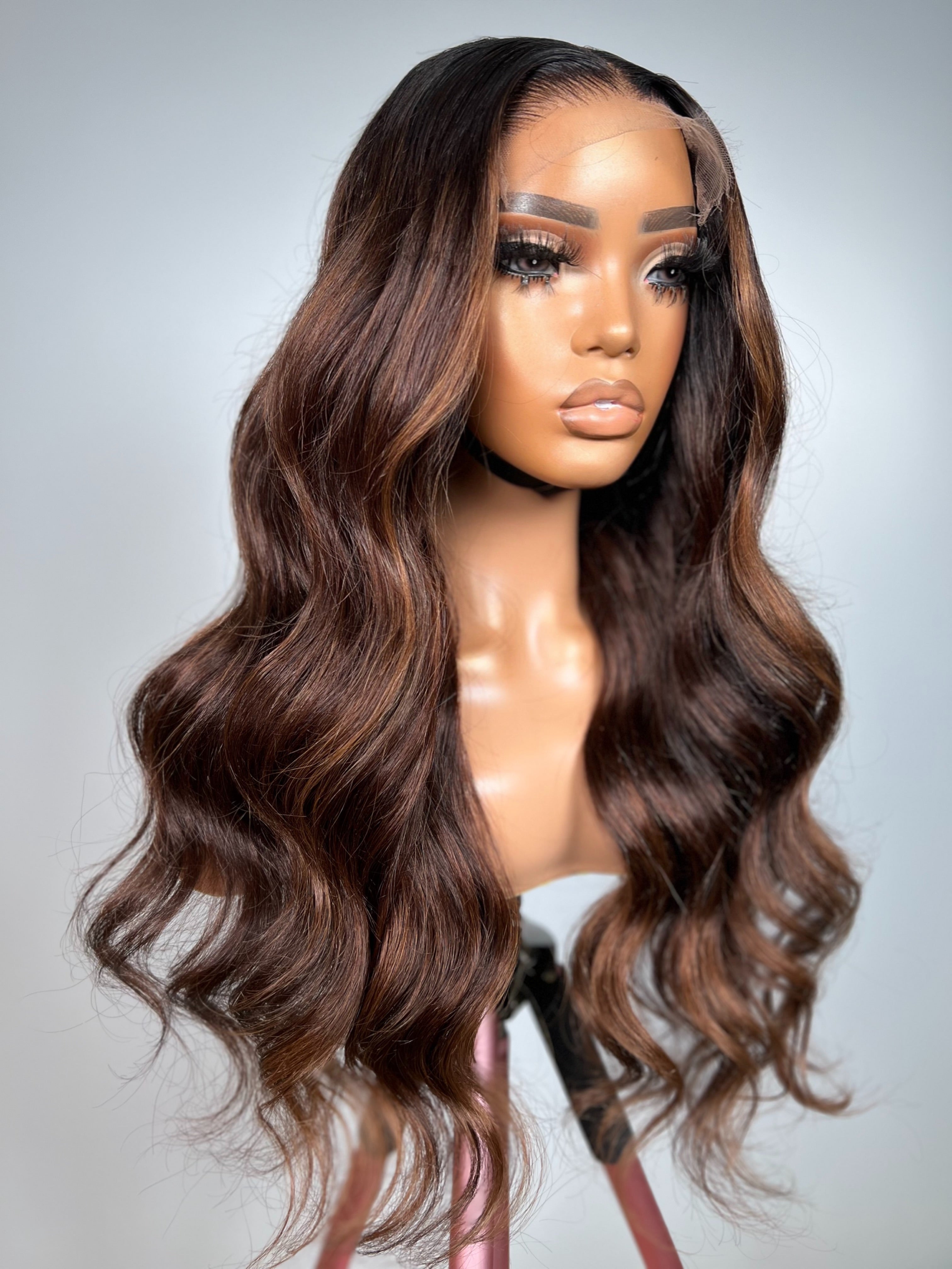This unit features a rich espresso base seamlessly blended with golden caramel highlights, adding depth and dimension throughout. Styled in soft body waves with a natural middle part, it enhances facial contours while creating graceful movement. The finish is polished but full of life a sophisticated choice for those who love warm, multi-tonal richness.
