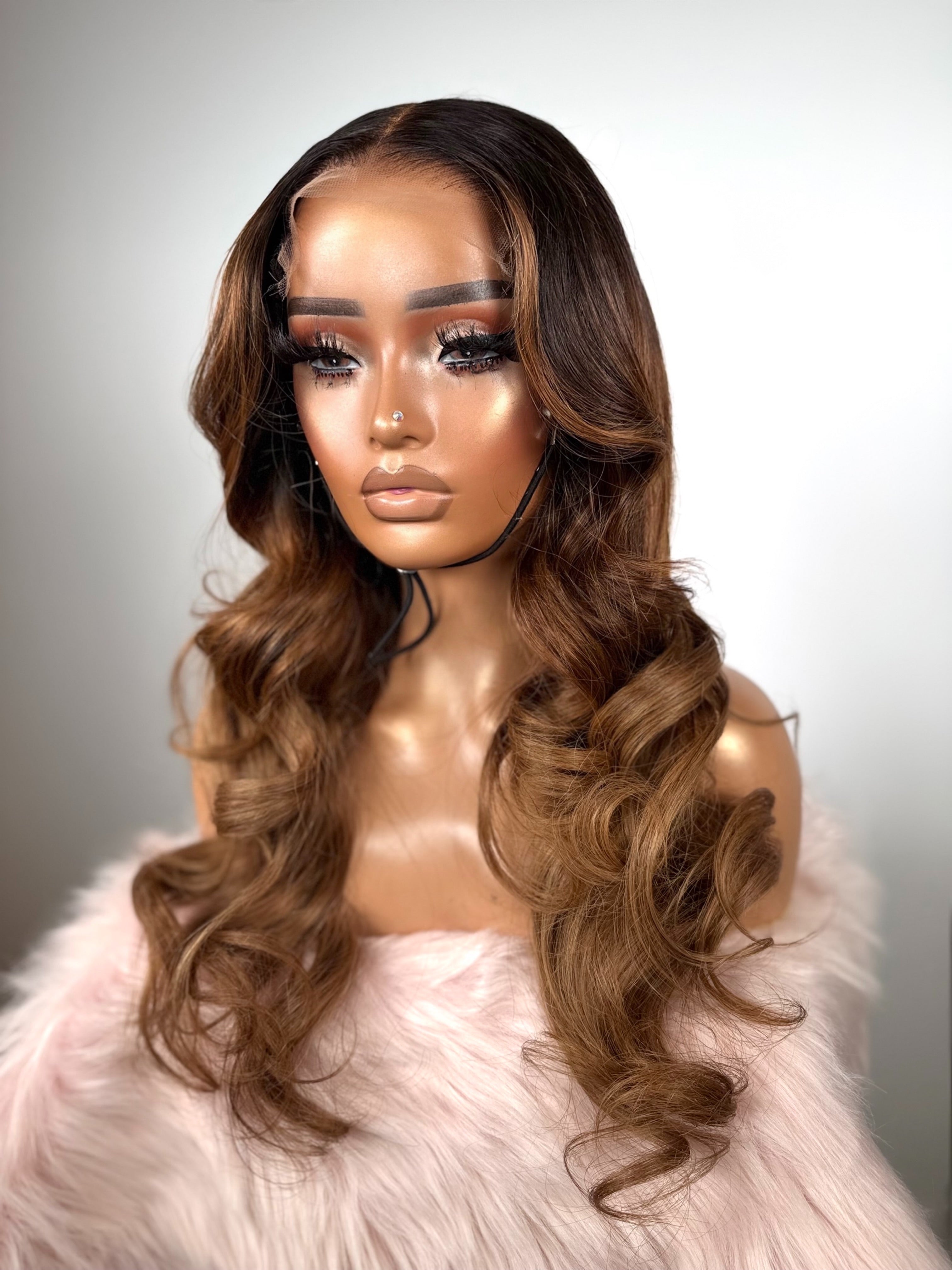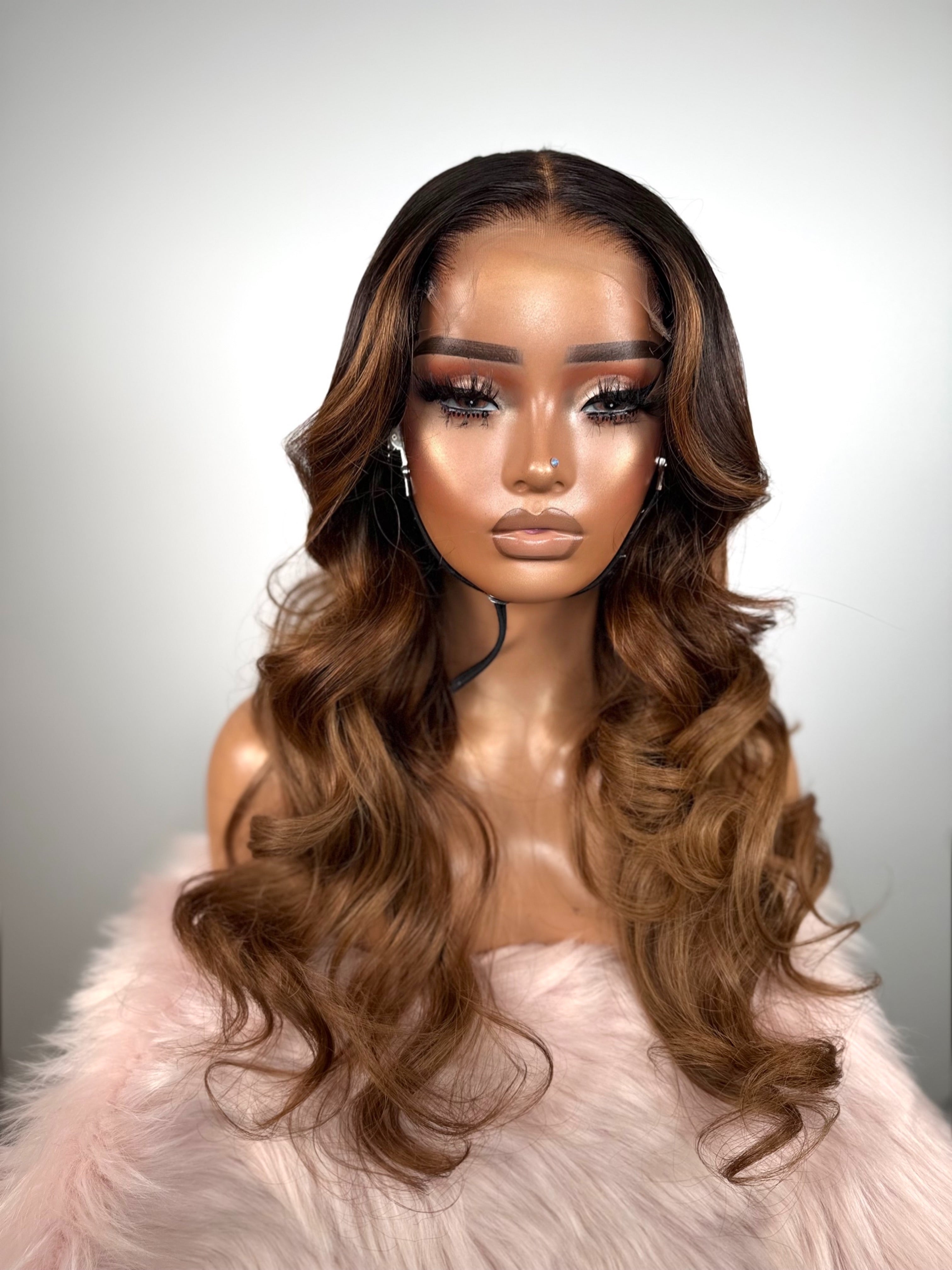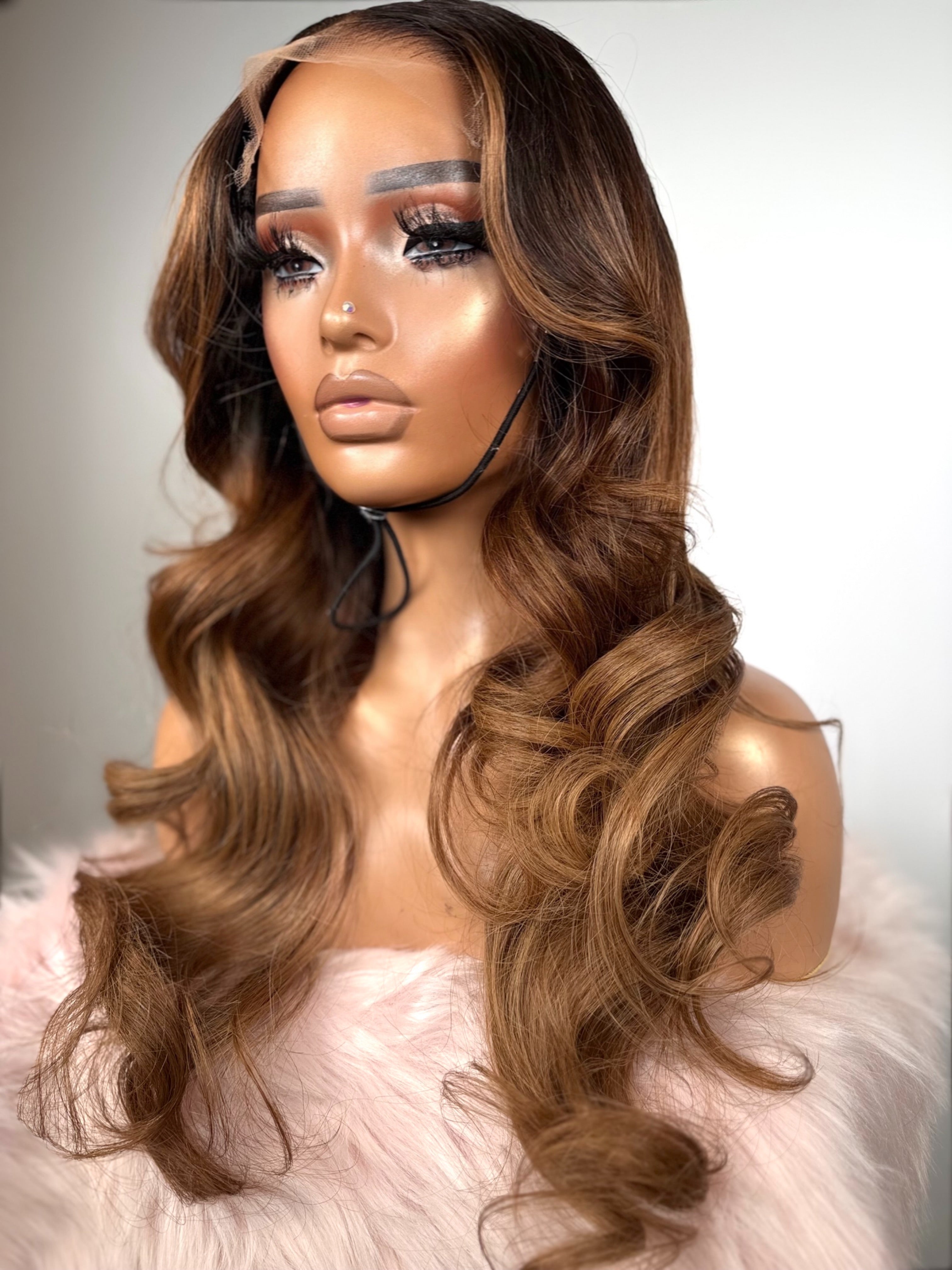 This unit features a deep brunette base blended into warm caramel and honey tones that melt through the mid-lengths and ends for a rich dimensional finish. Styled in long, bouncy Hollywood waves with a smooth side-swept face frame, it delivers volume, softness, and effortless glamour. The color reflects beautifully under light, making it a perfect statement unit that still feels elegant and wearable.