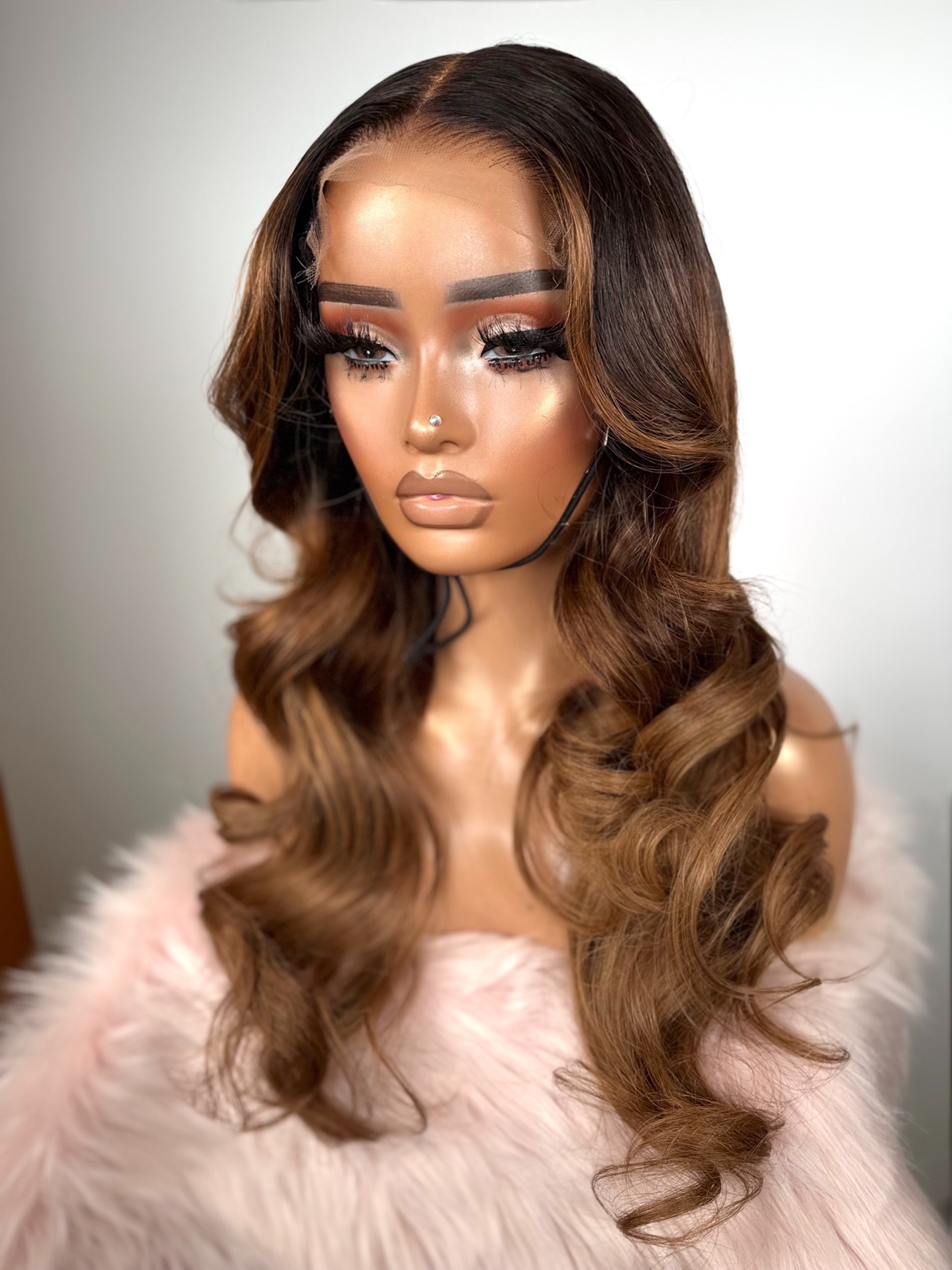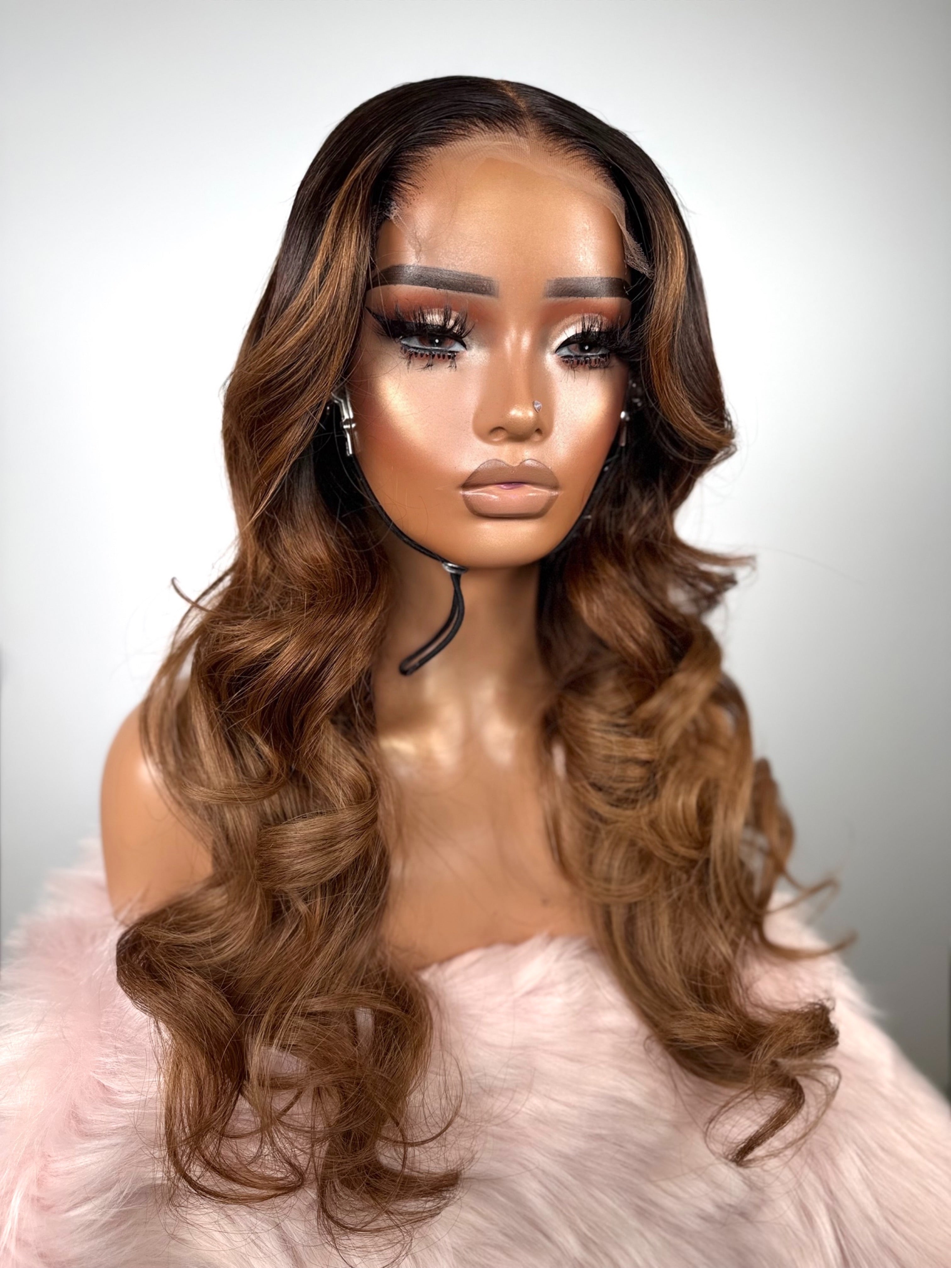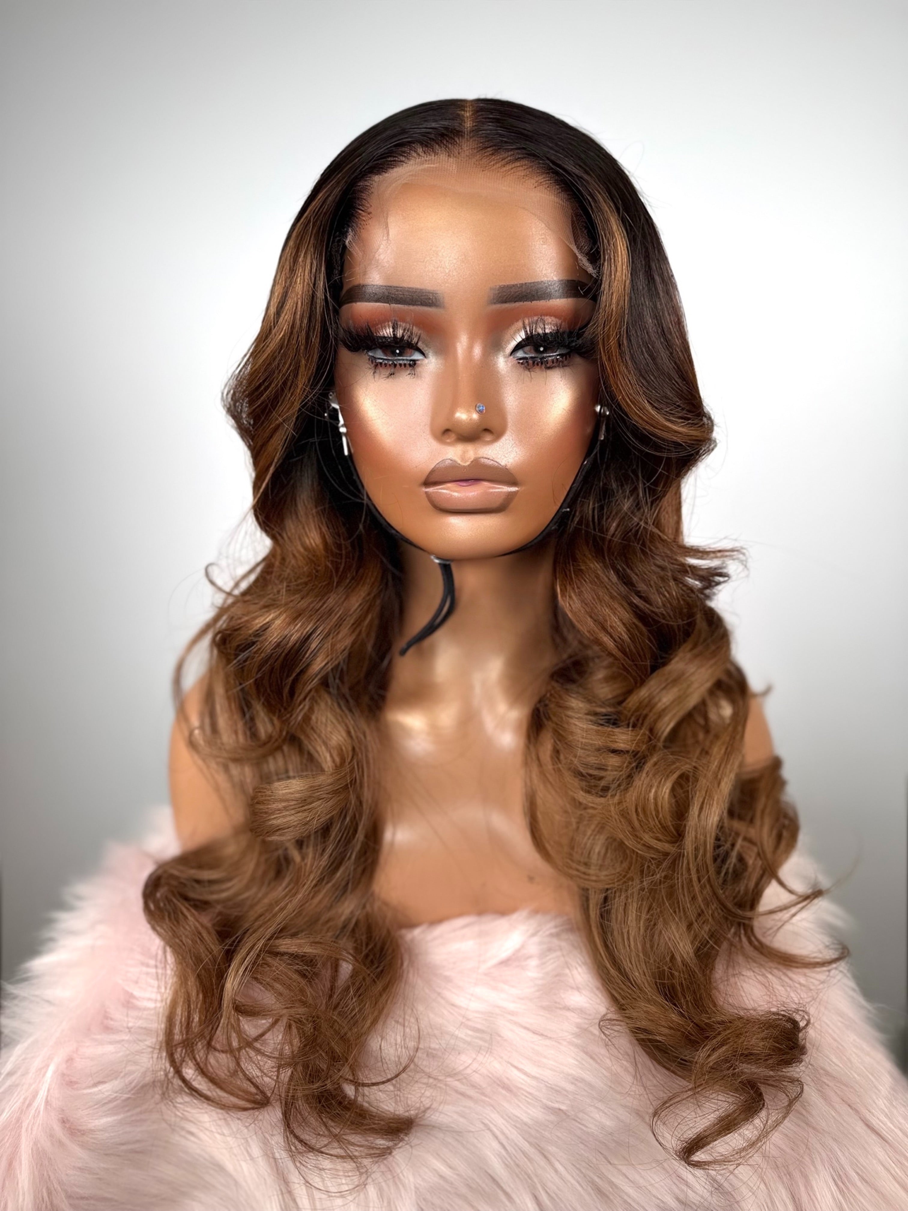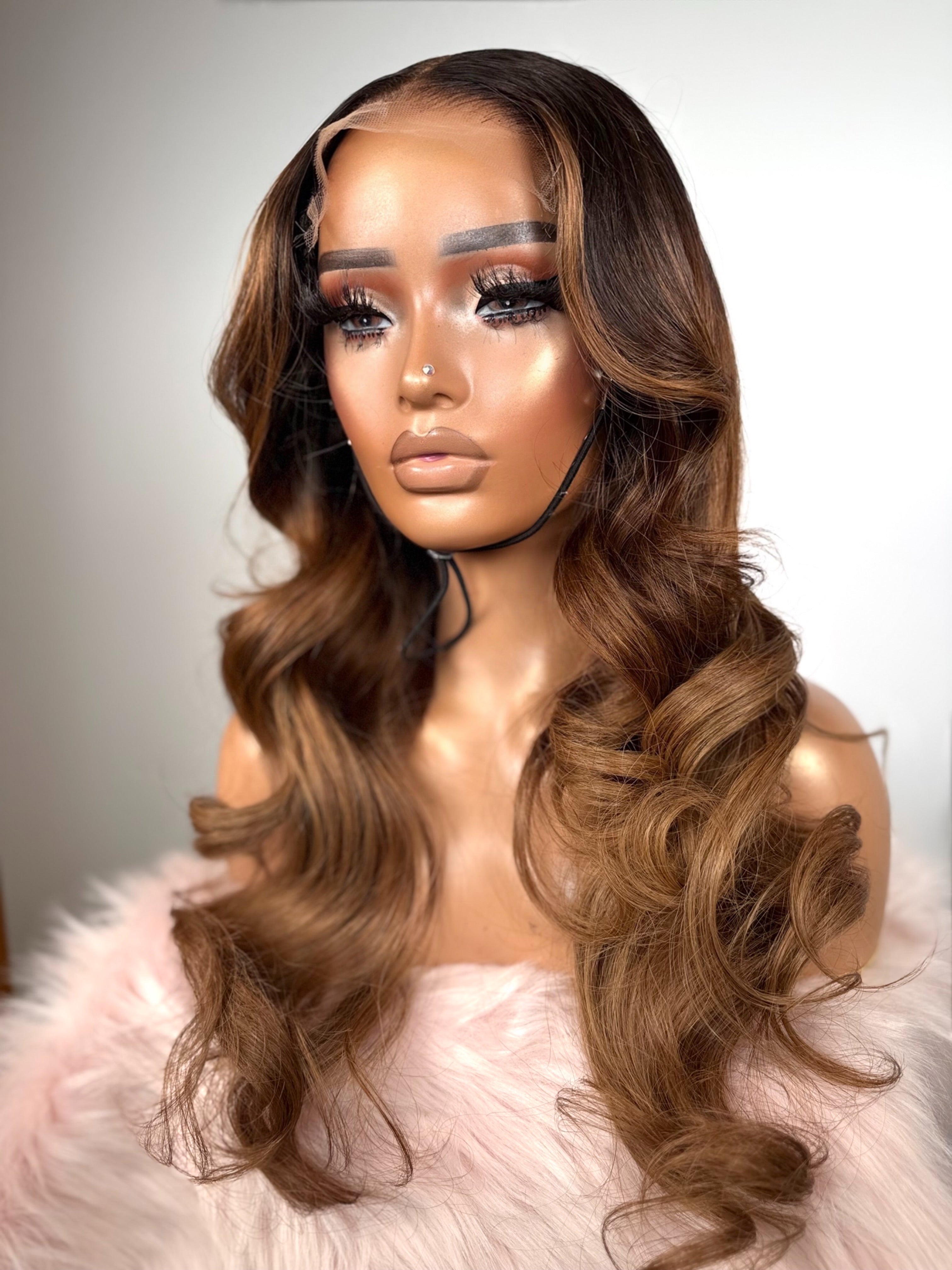 This unit features a deep brunette base blended into warm caramel and honey tones that melt through the mid-lengths and ends for a rich dimensional finish. Styled in long, bouncy Hollywood waves with a smooth side-swept face frame, it delivers volume, softness, and effortless glamour. The color reflects beautifully under light, making it a perfect statement unit that still feels elegant and wearable.