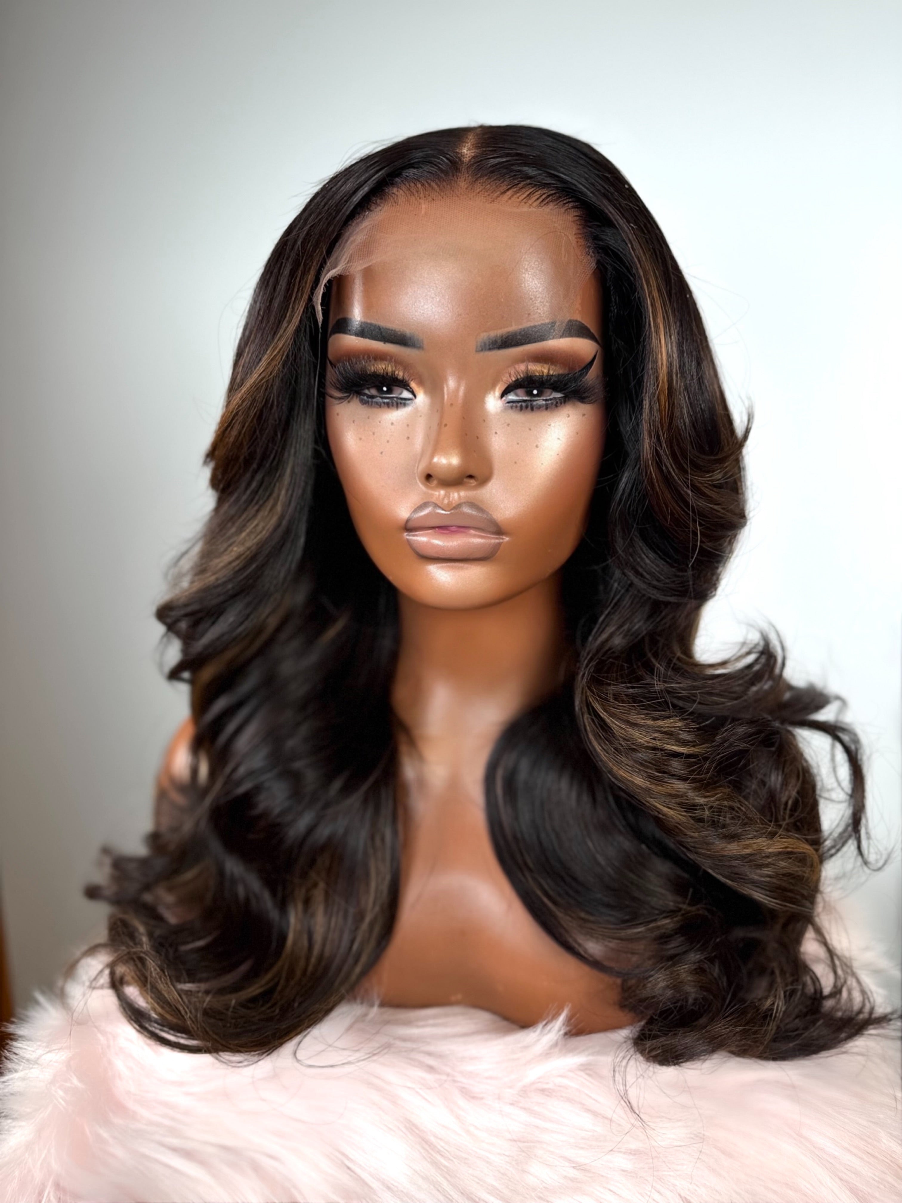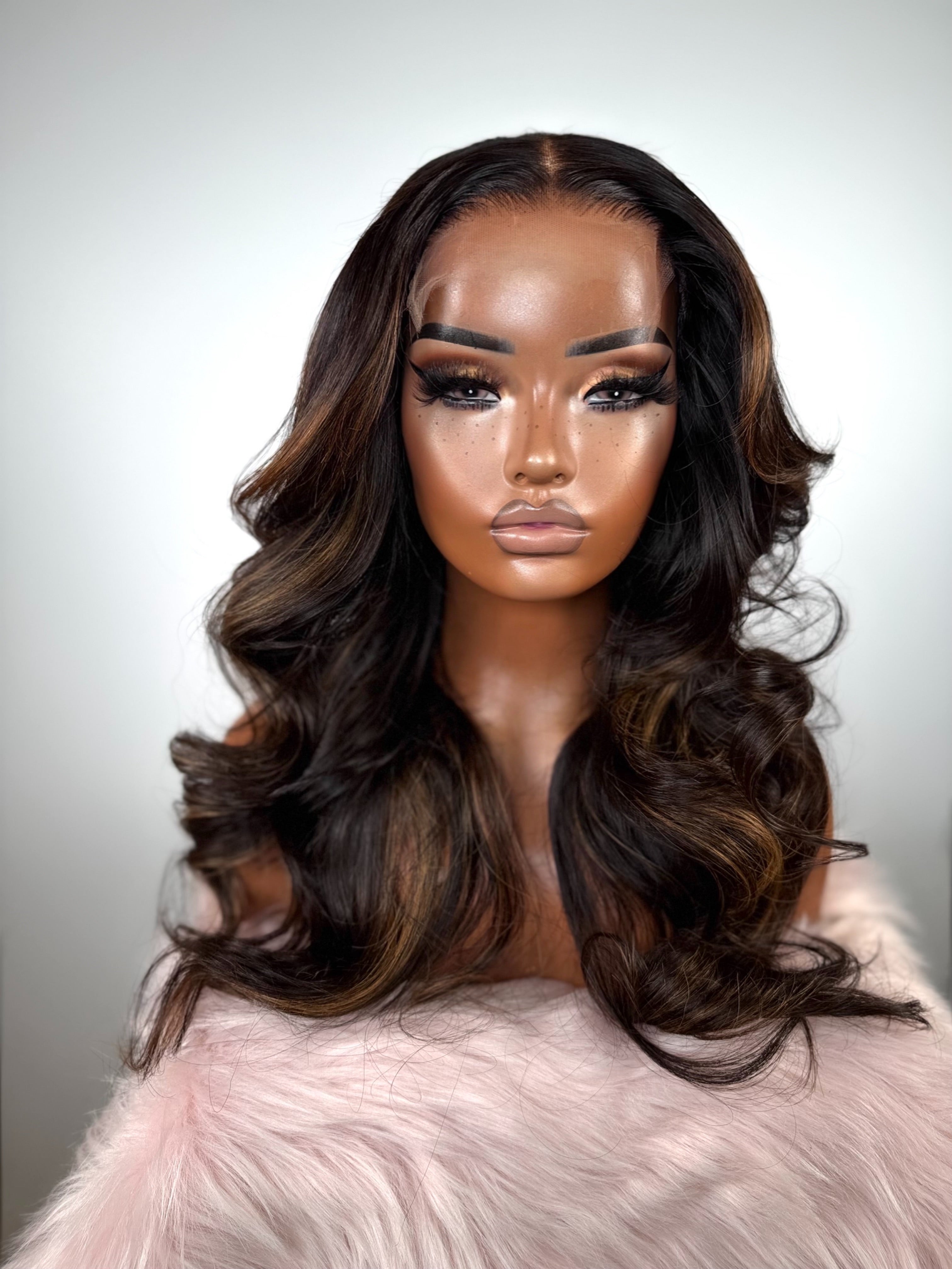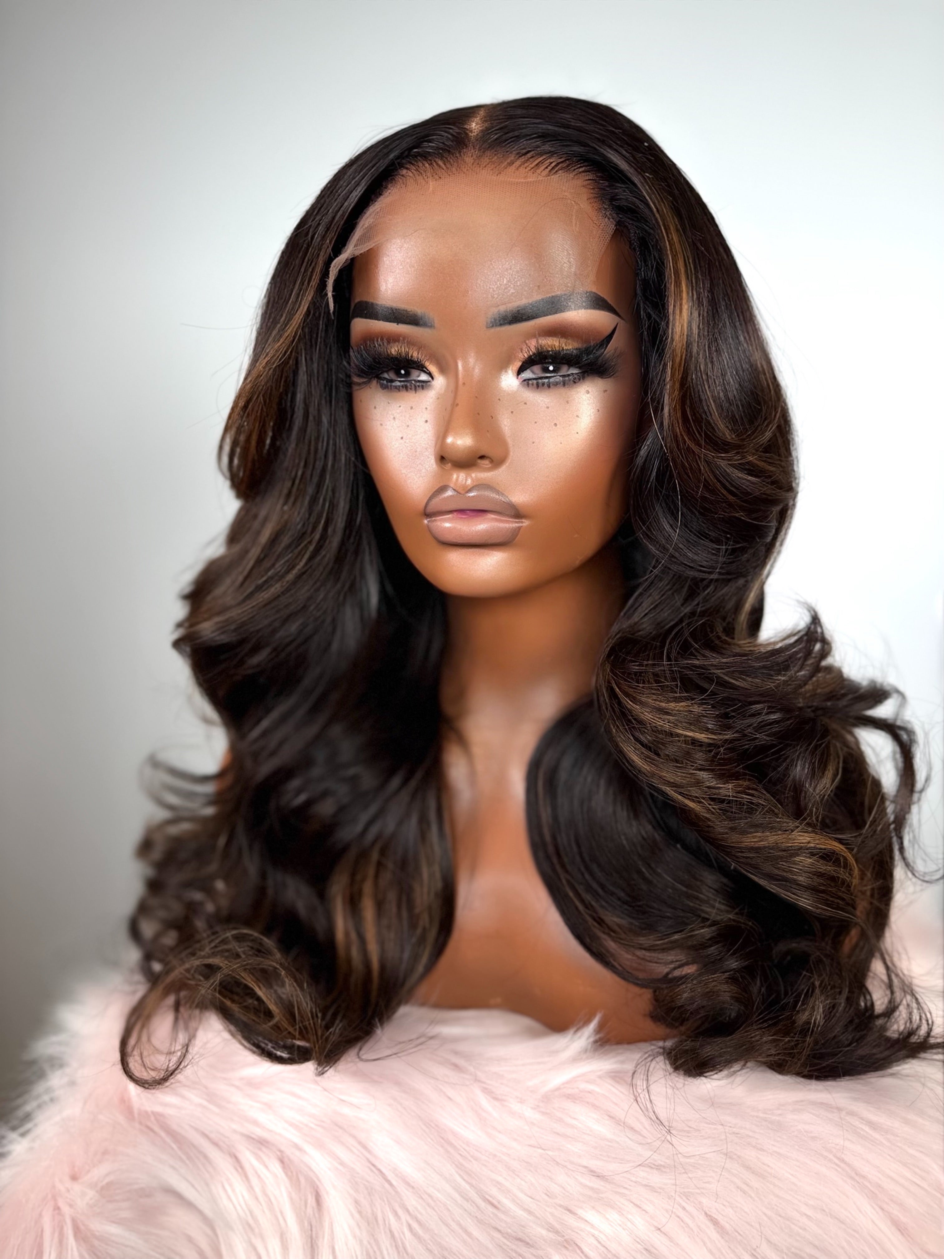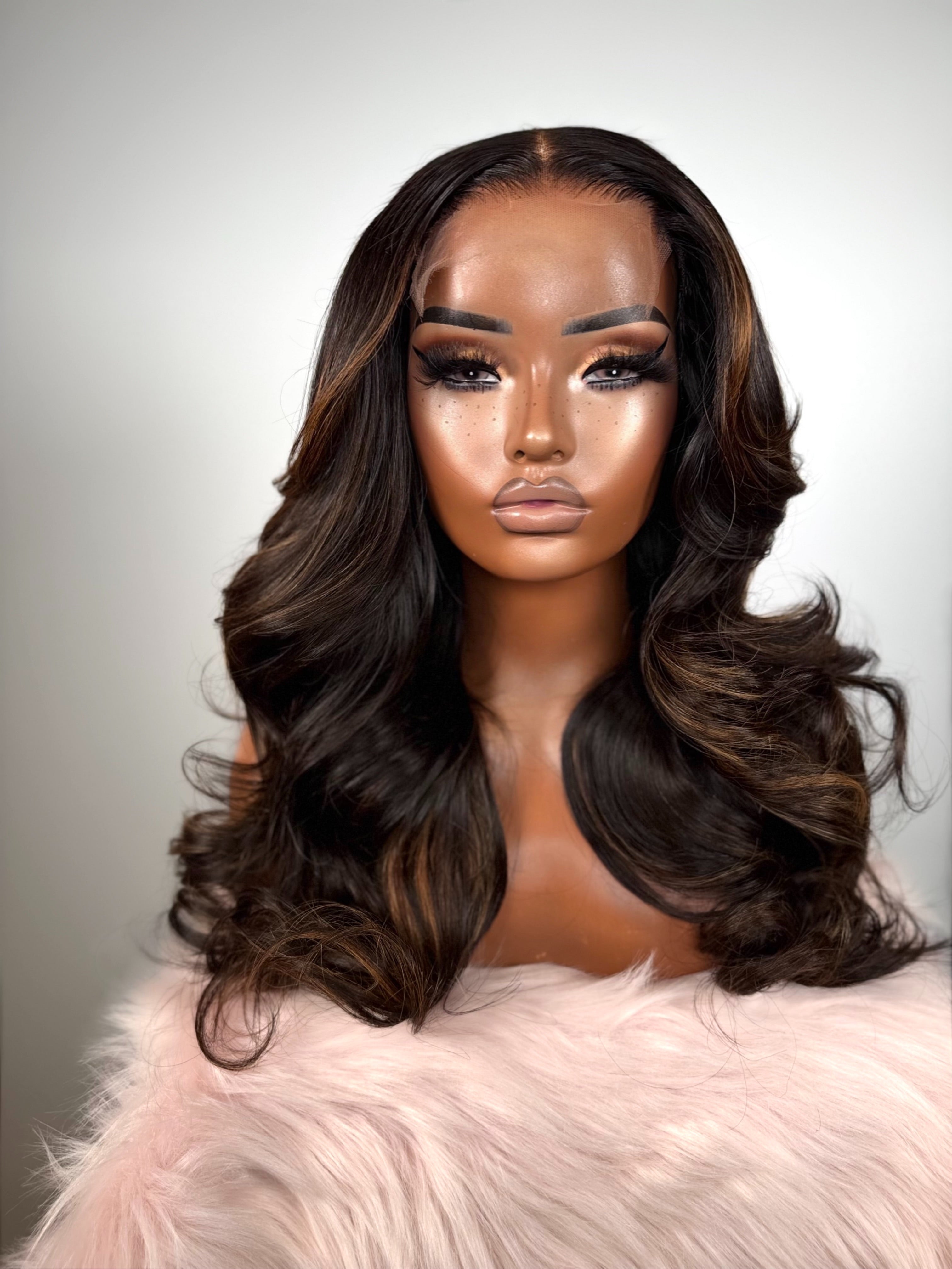 This unit features a deep espresso-brown base blended with warm caramel highlight ribbons that melt through the curls for a rich, dimensional finish. Styled in a glamorous body-wave with a side-swept part and soft volume at the crown, it gives a bombshell look while still feeling polished and wearable. The highlights hit perfectly around the face and throughout the lengths, creating a radiant, bronzed effect that elevates the entire style.