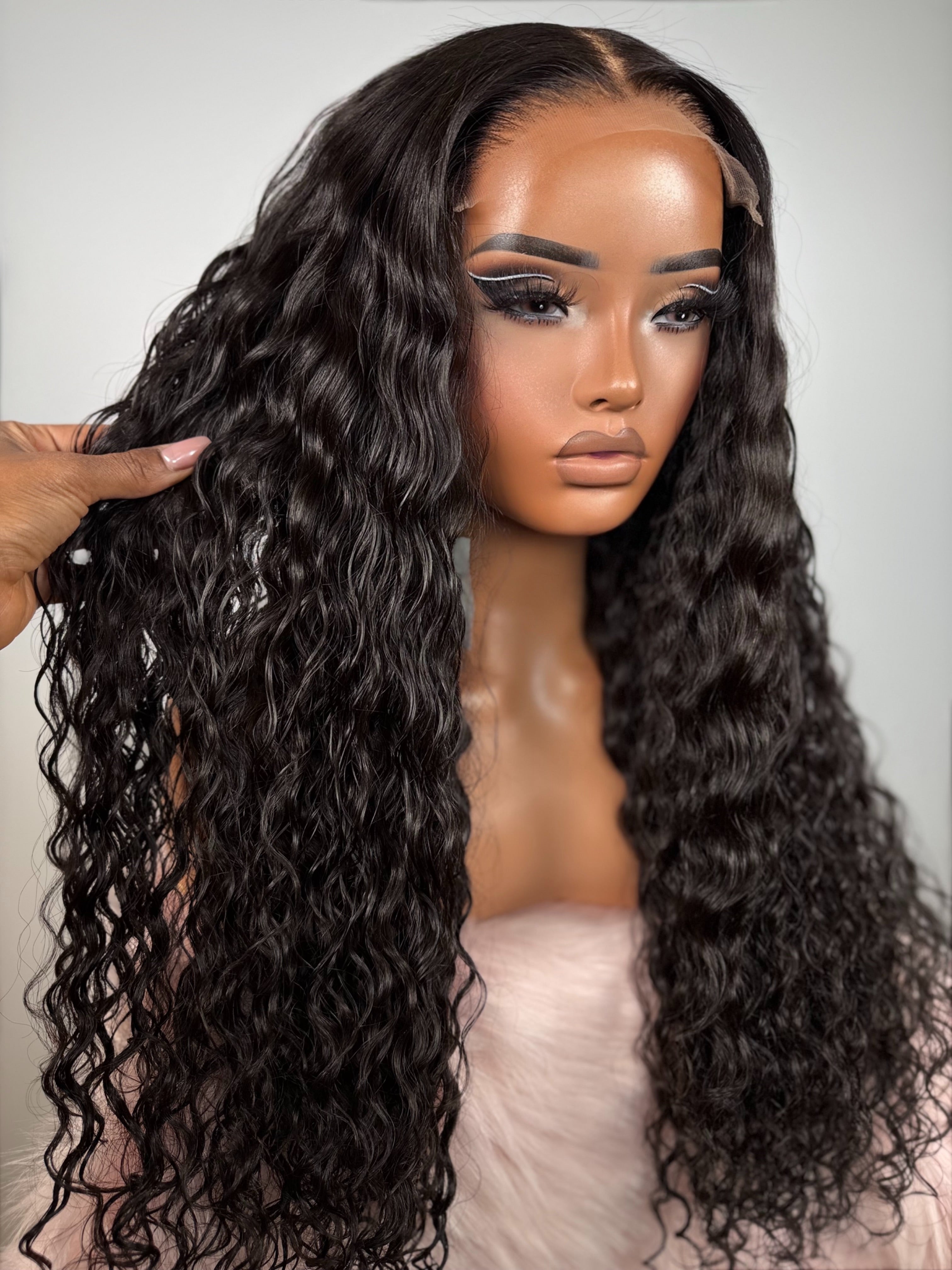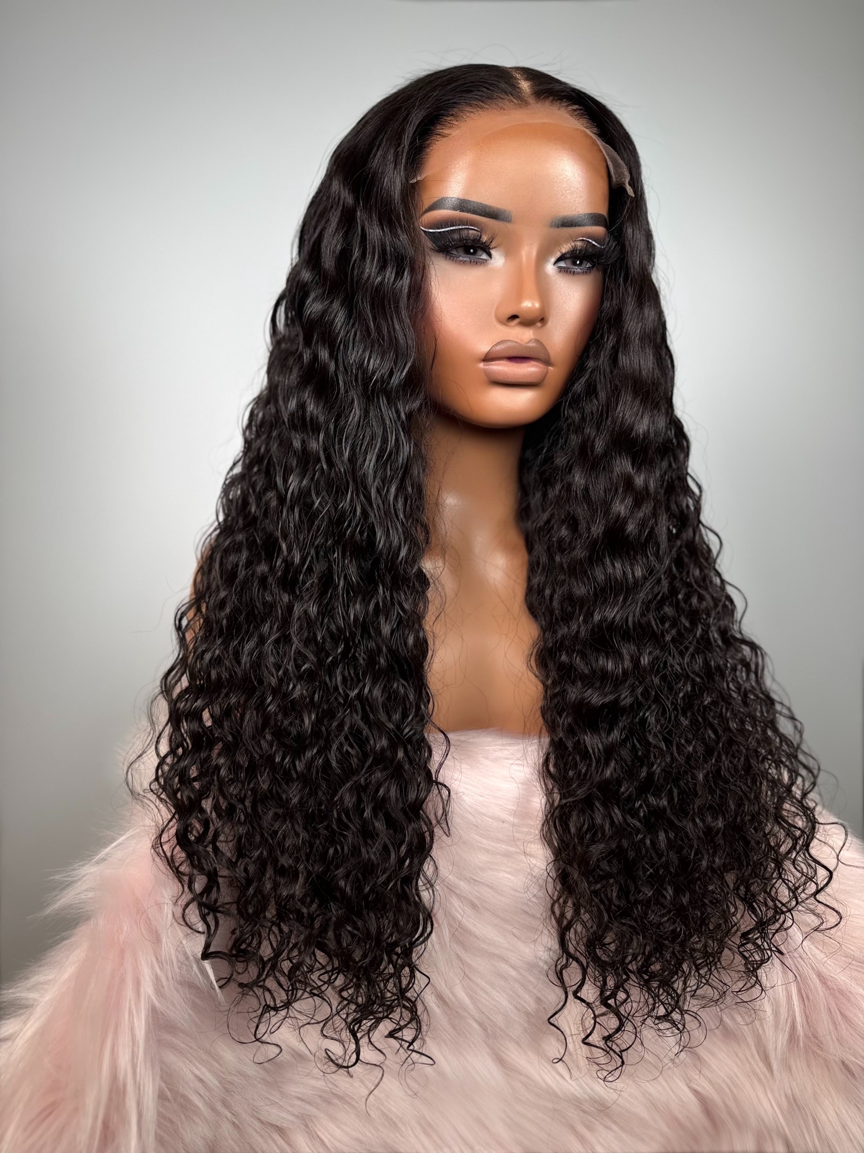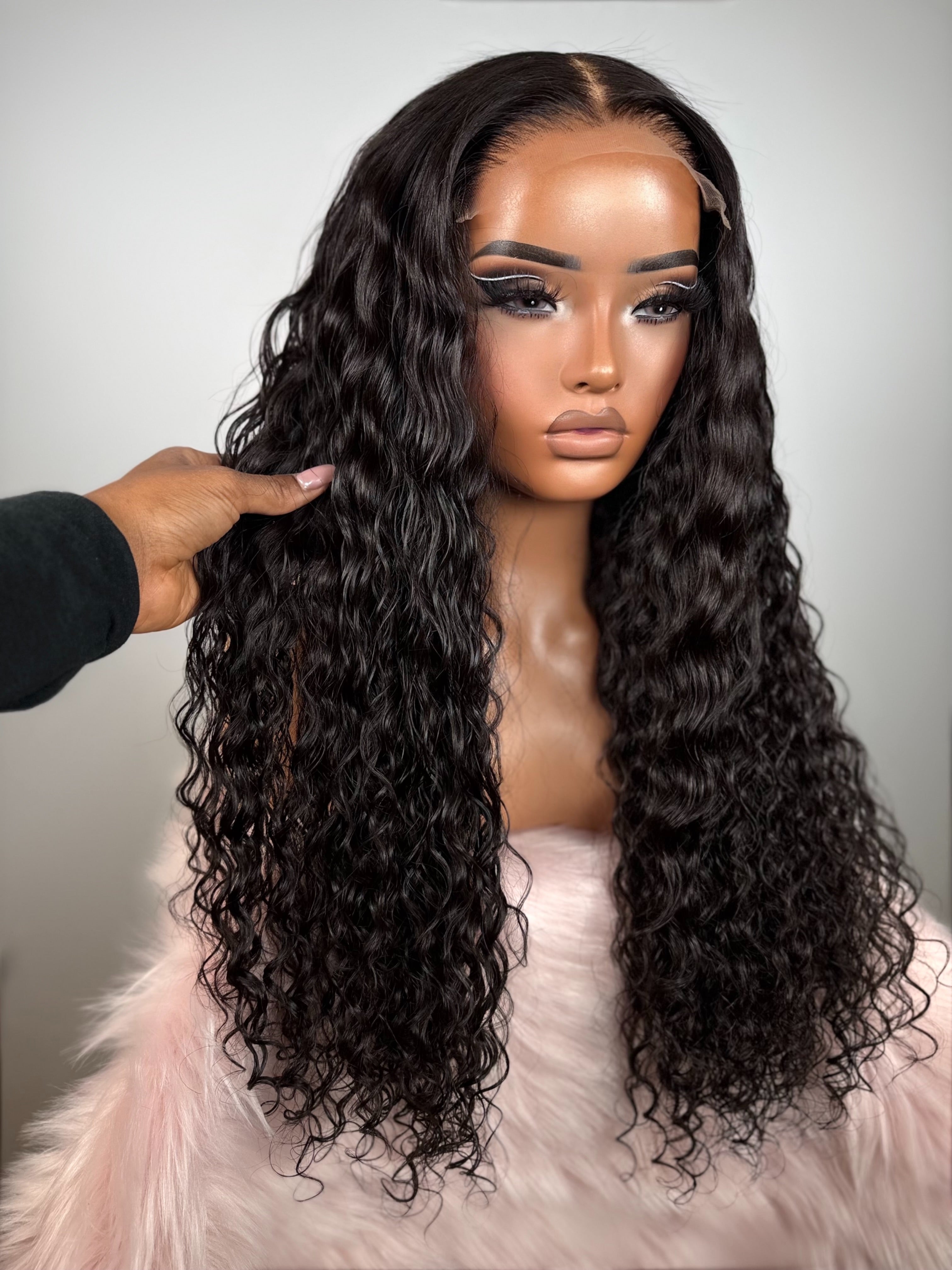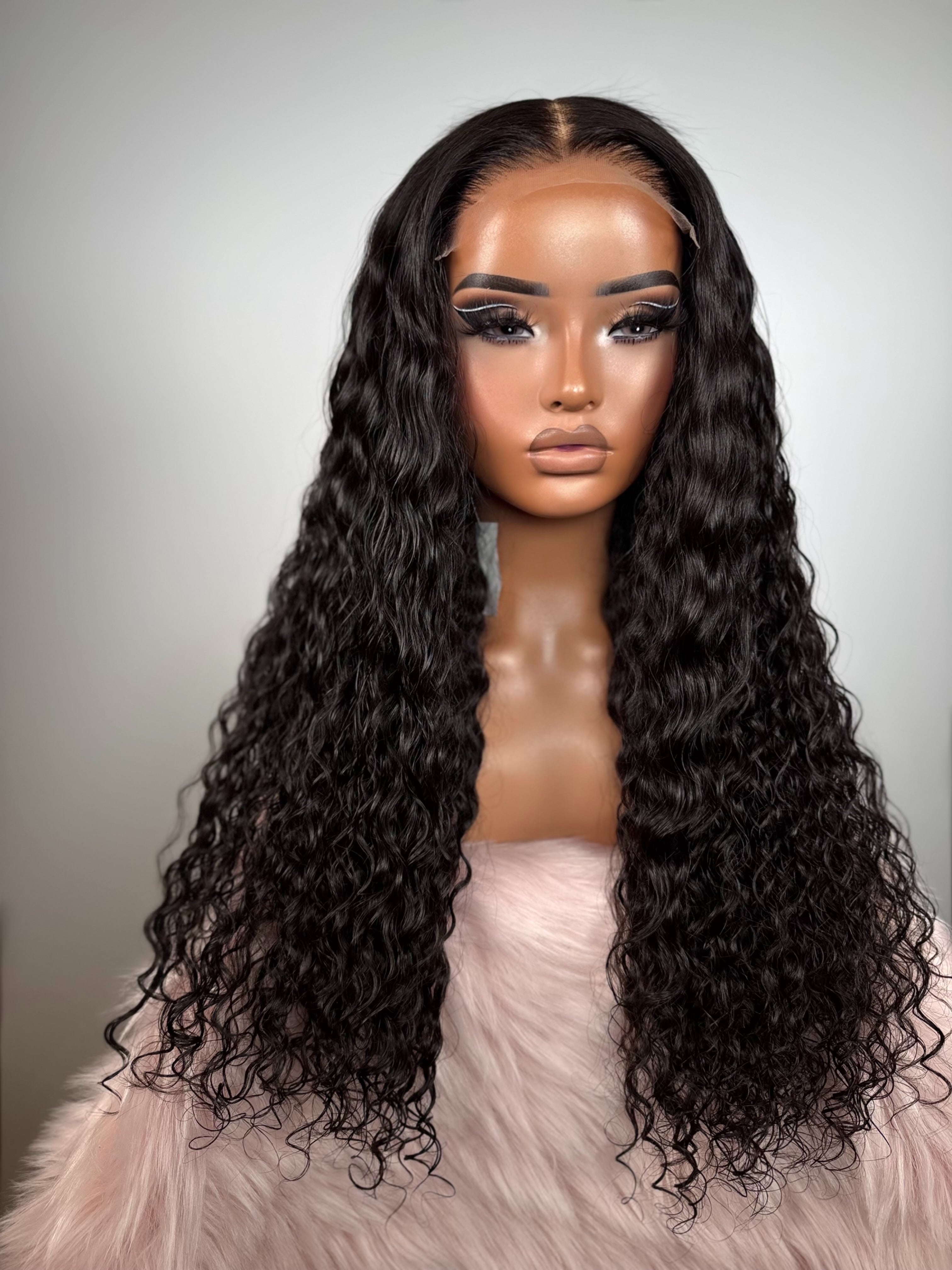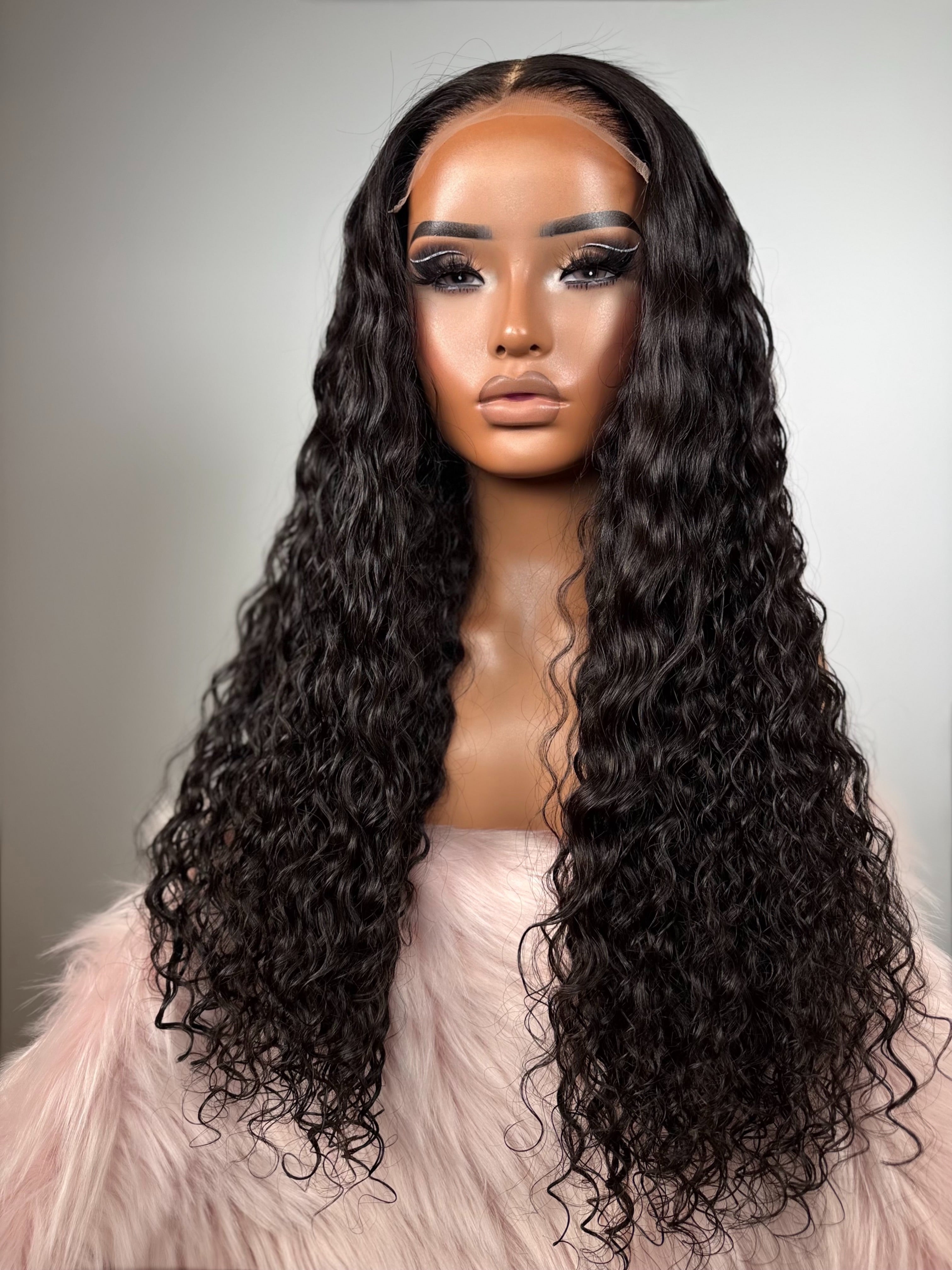 This unit features a deep natural black shade with a healthy, glossy finish that makes the curls look full and vibrant. Styled in long, defined water-wave curls, it delivers a soft, wet-look texture with beautiful movement and natural volume. The middle part keeps it clean and balanced, while the length gives that dramatic, luxurious effect that instantly elevates your entire look.