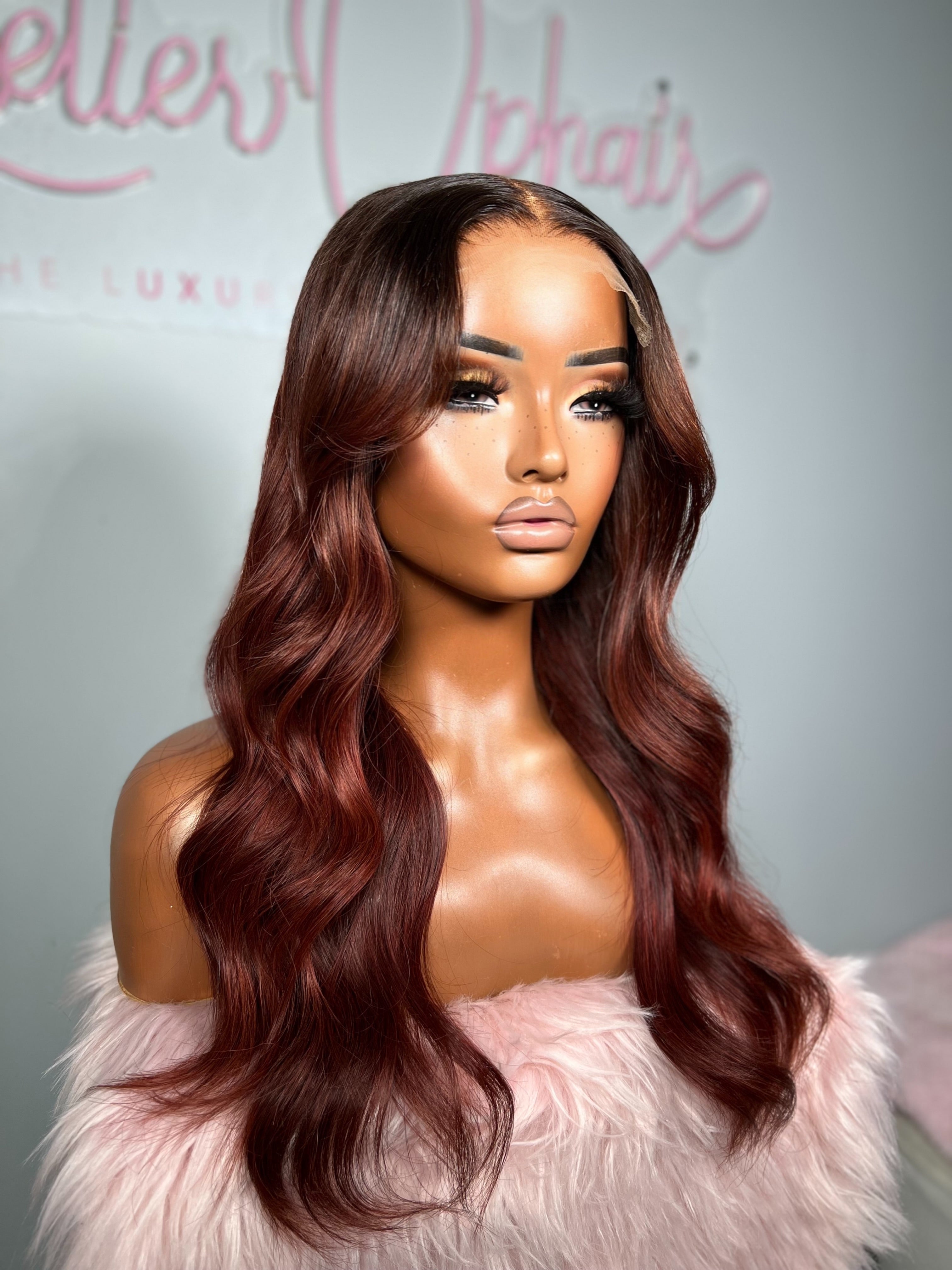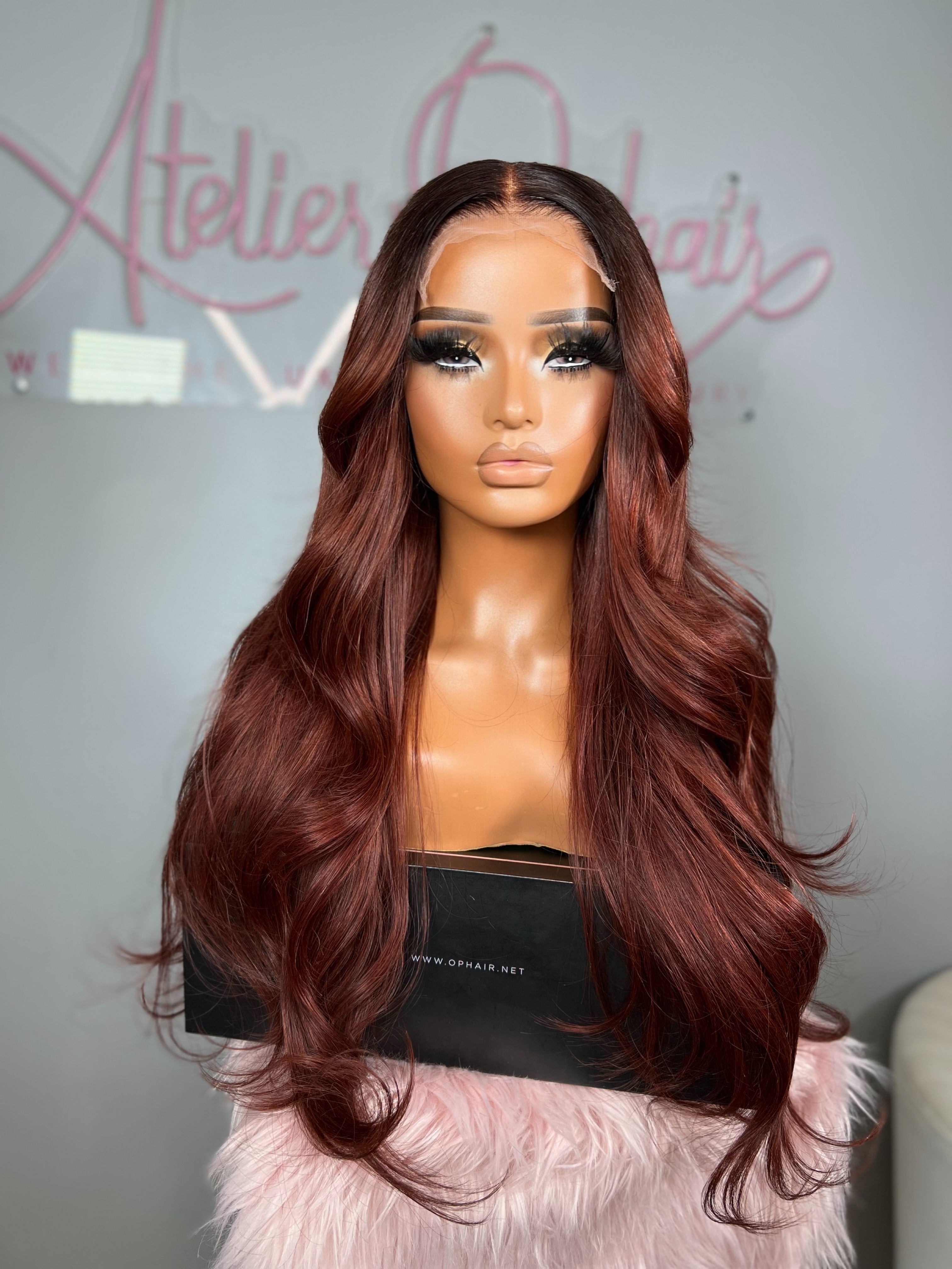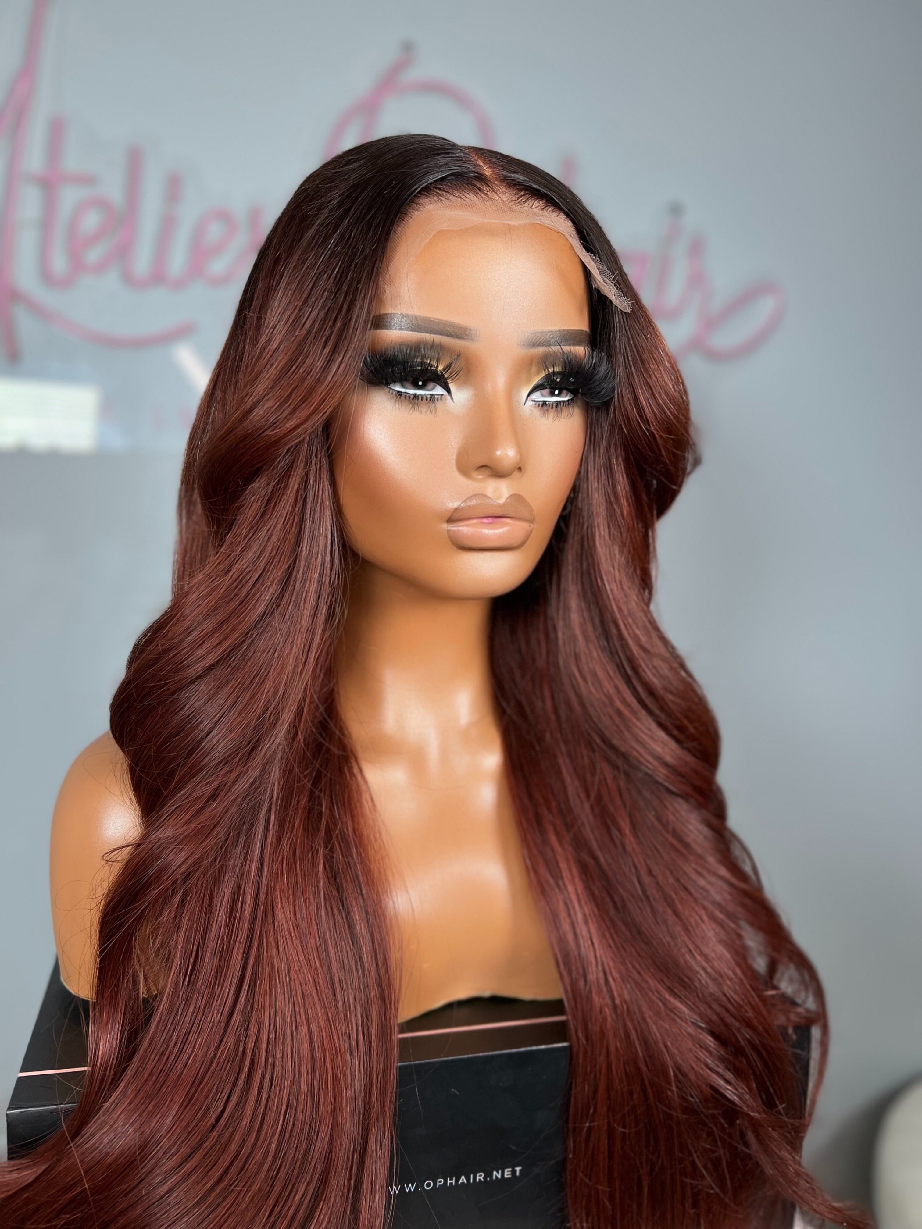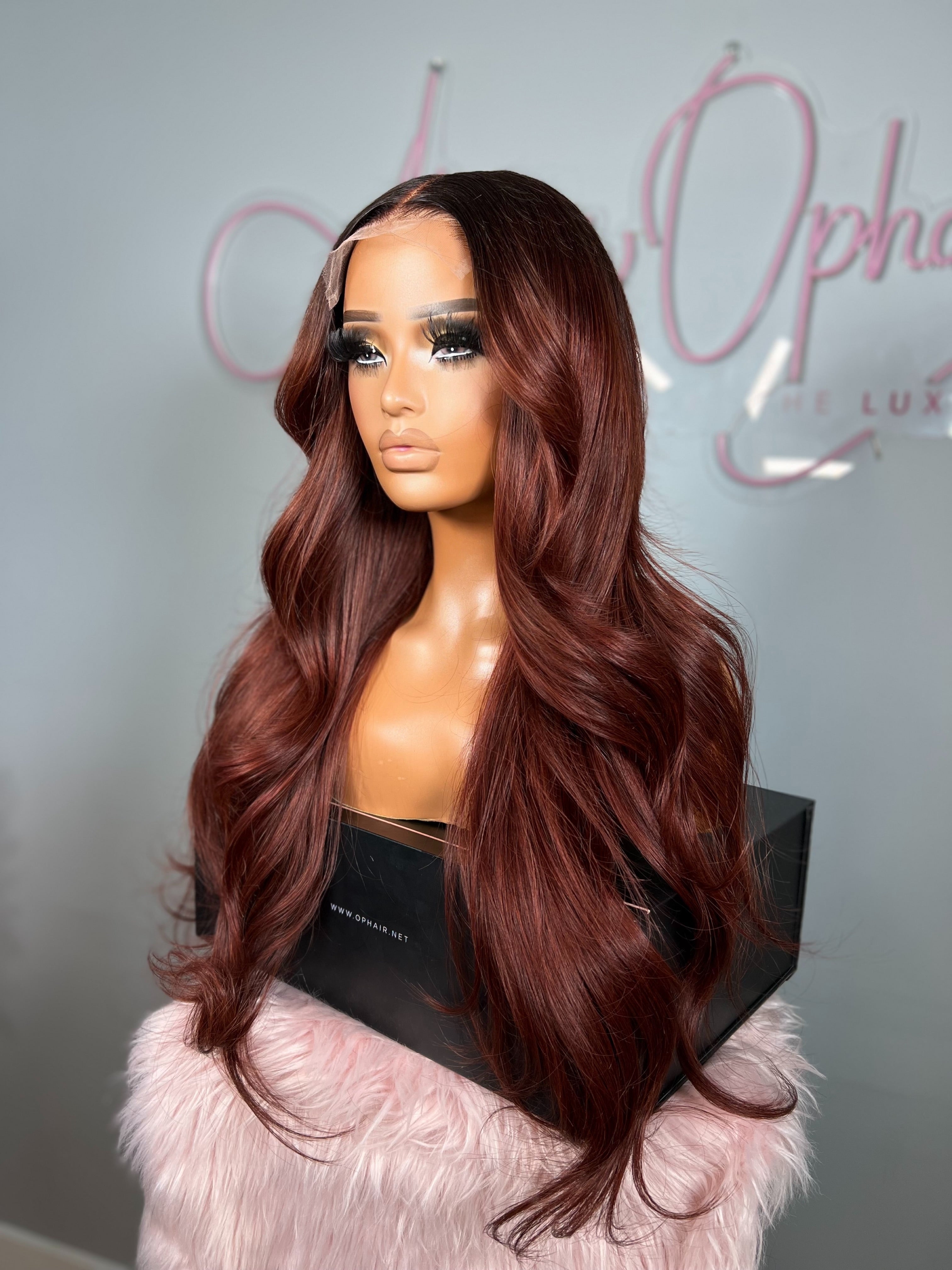 A rich deep auburn red, full of dimension and warmth, flows through soft, cascading waves. The center part frames the face elegantly, while the silky finish enhances shine and movement. This shade strikes a balance between bold and refined, adding vibrance without overpowering your look.