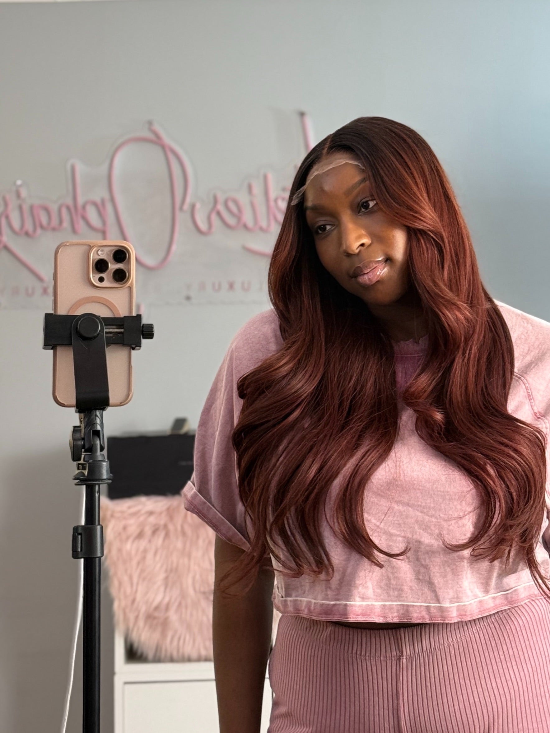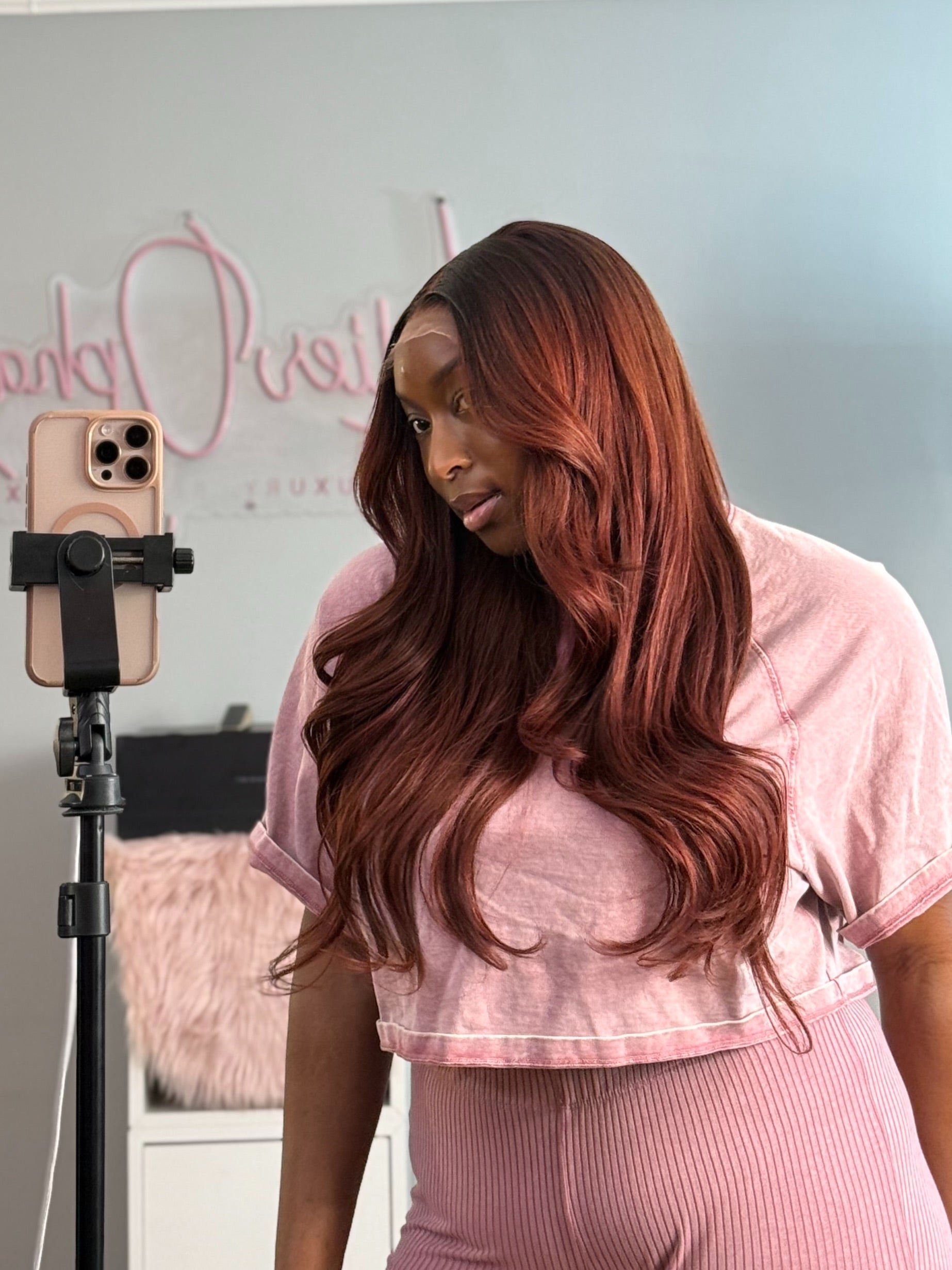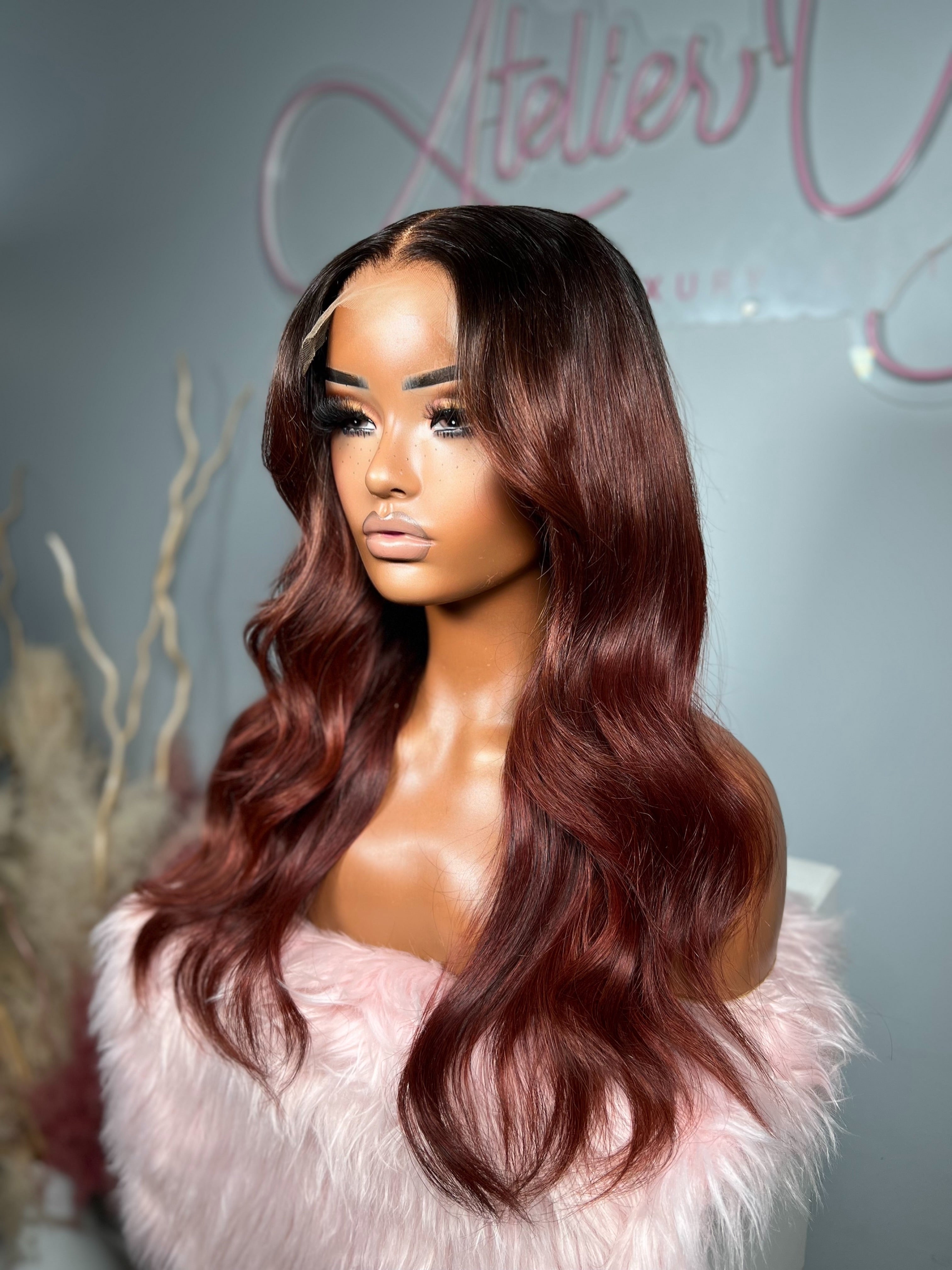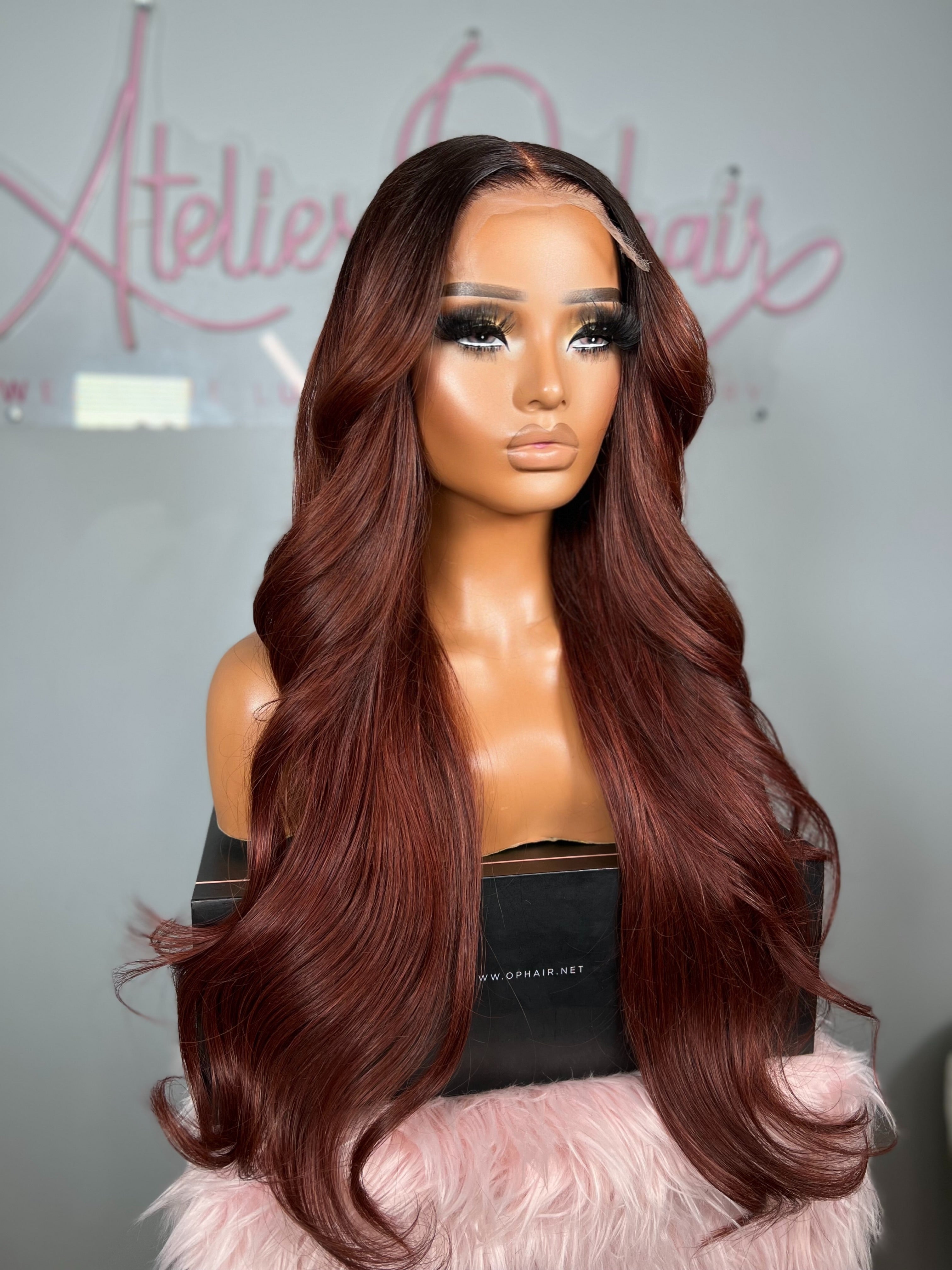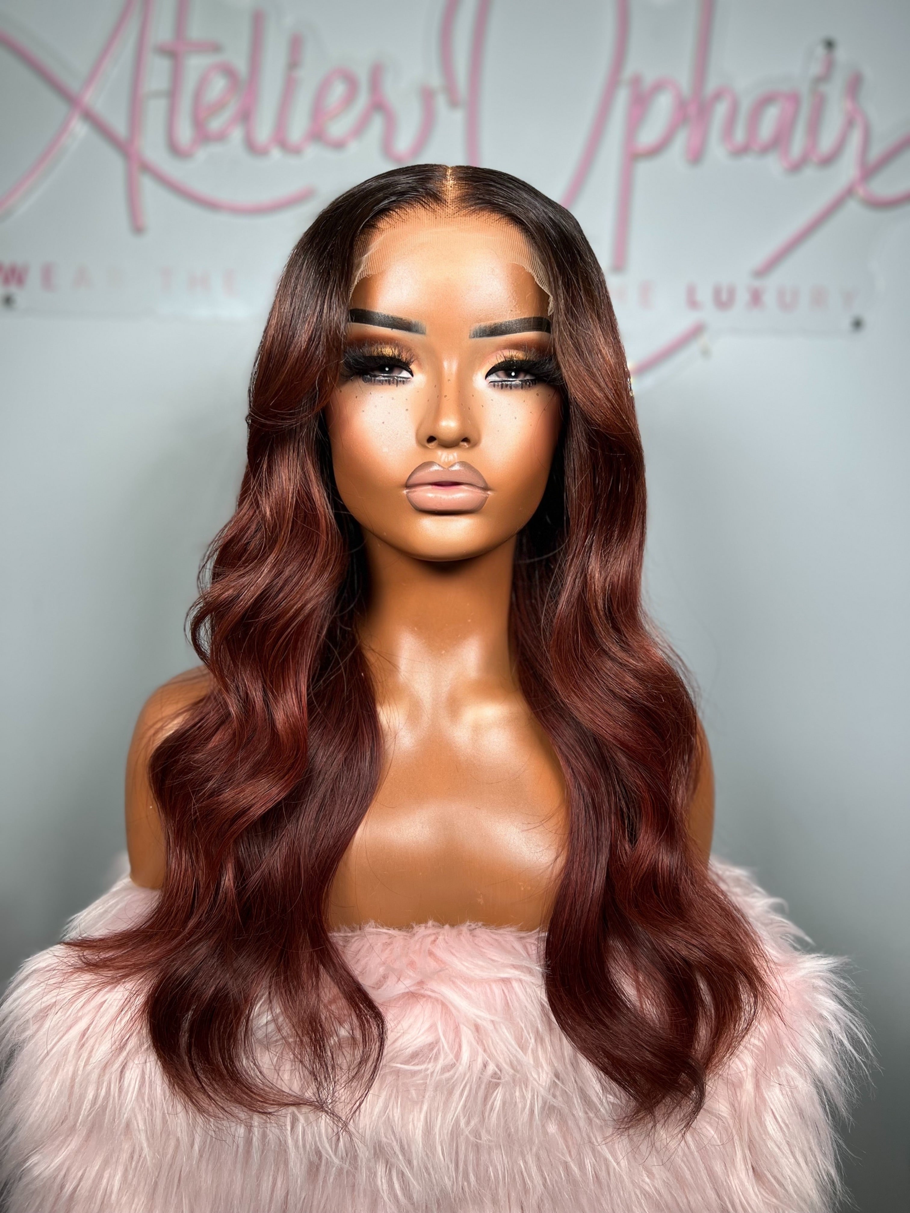 A rich deep auburn red, full of dimension and warmth, flows through soft, cascading waves. The center part frames the face elegantly, while the silky finish enhances shine and movement. This shade strikes a balance between bold and refined, adding vibrance without overpowering your look.