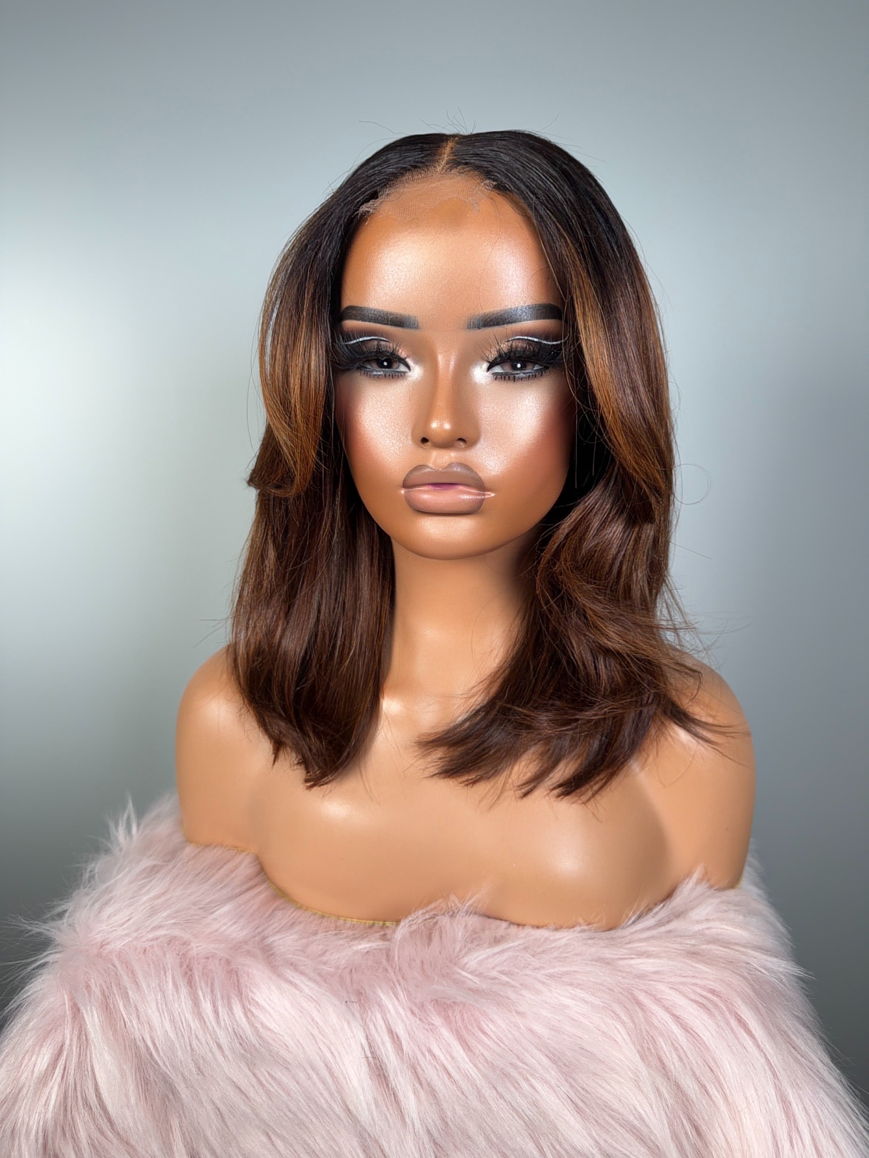 This unit features a rich chestnut auburn base that glow under the light, creating depth and dimension. the layered cut gives movement and body. Styled in loose waves, the texture enhances the natural shine of the auburn blend, giving bounce and fluidity with every step. The combination of red warmth, glossy finish, and layered bangs makes this look both timeless and bold a statement piece that’s still wearable every day.
