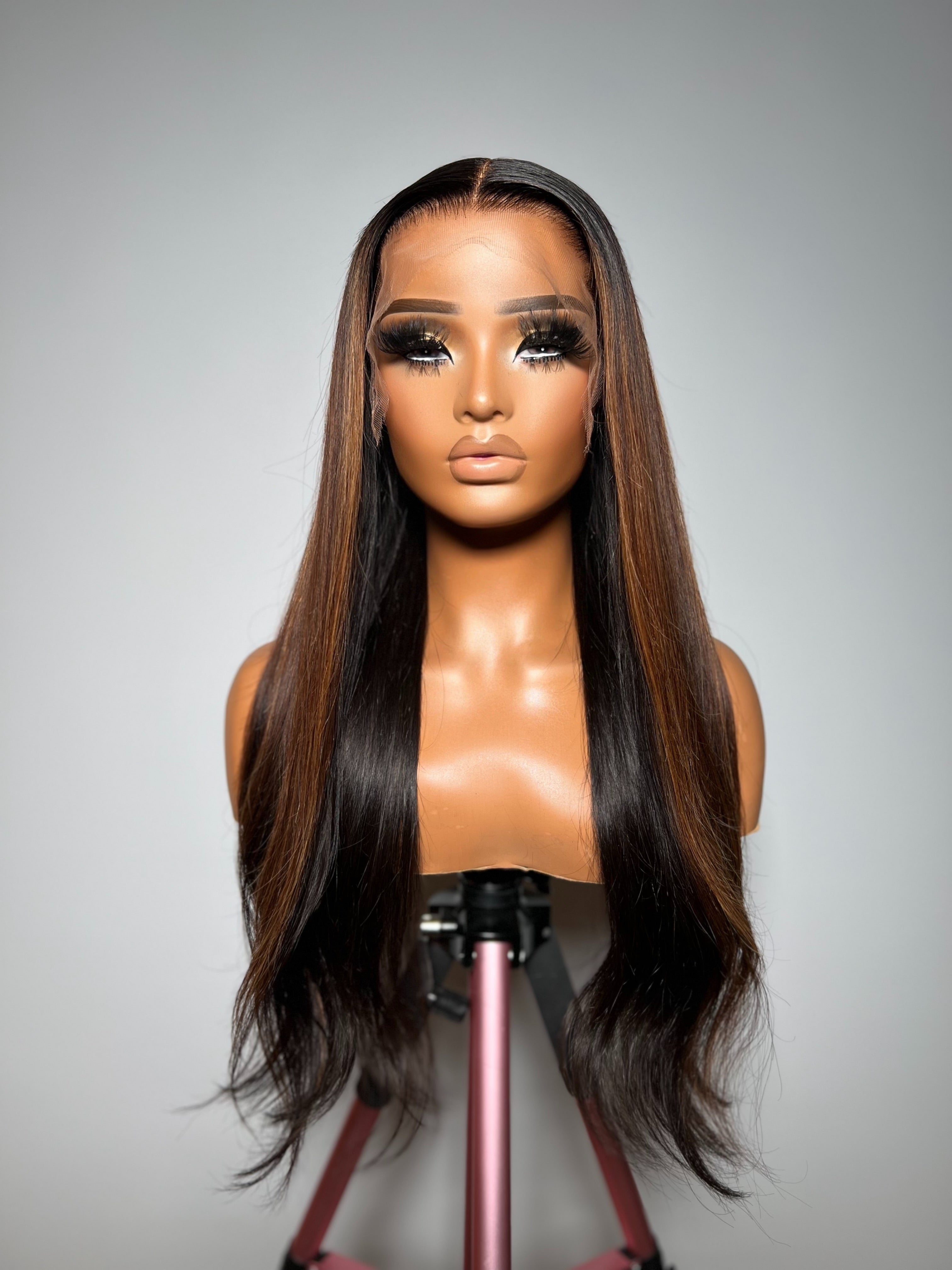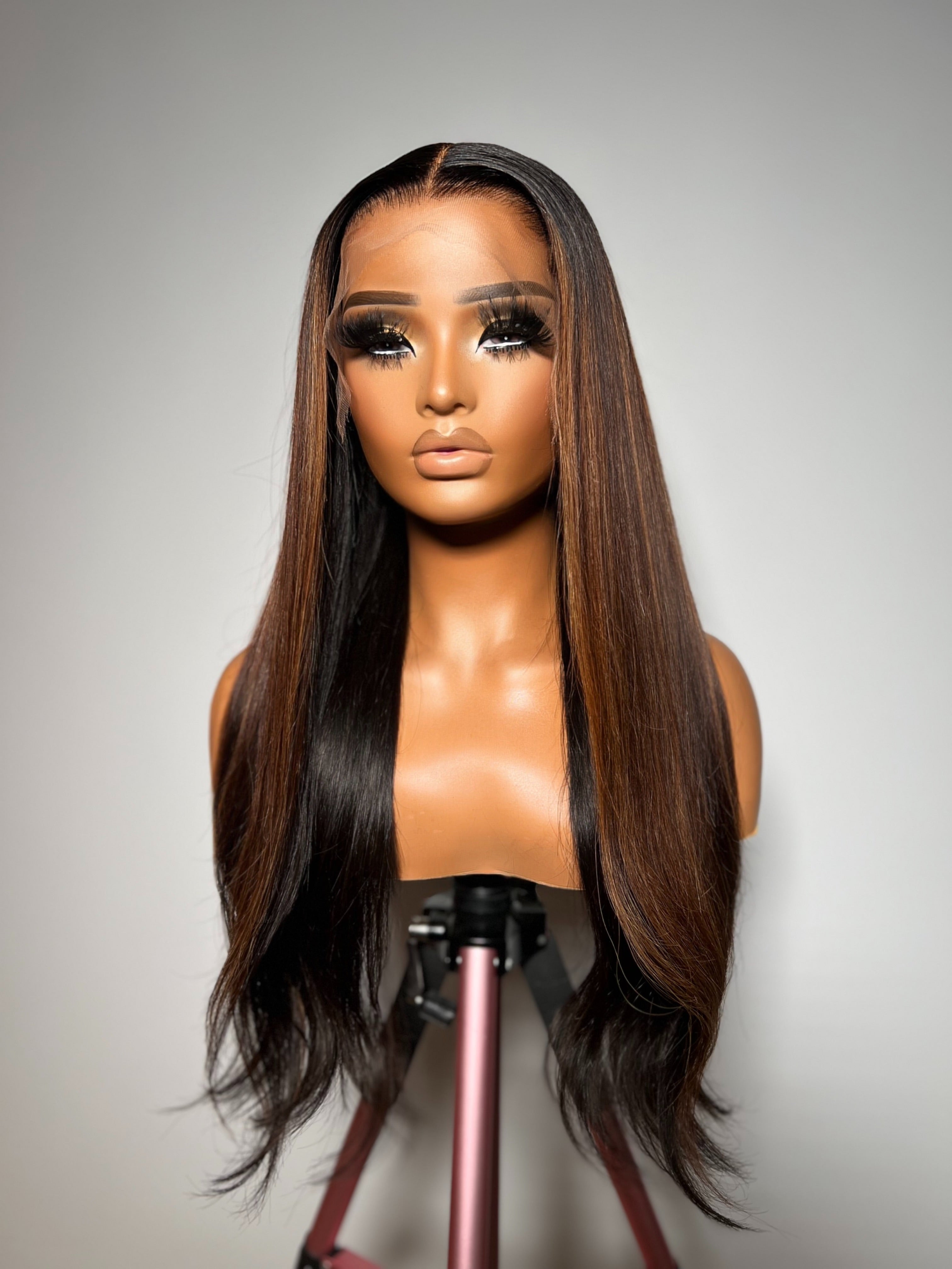 This unit features a deep chocolate brown base with golden caramel streaks that frame the face and melt subtly through the length. The highlights add movement and a radiant glow, giving dimension without overpowering. Styled in a soft natural wave, it balances warmth and elegance ideal for those who love a rich brunette with a touch of brightness.