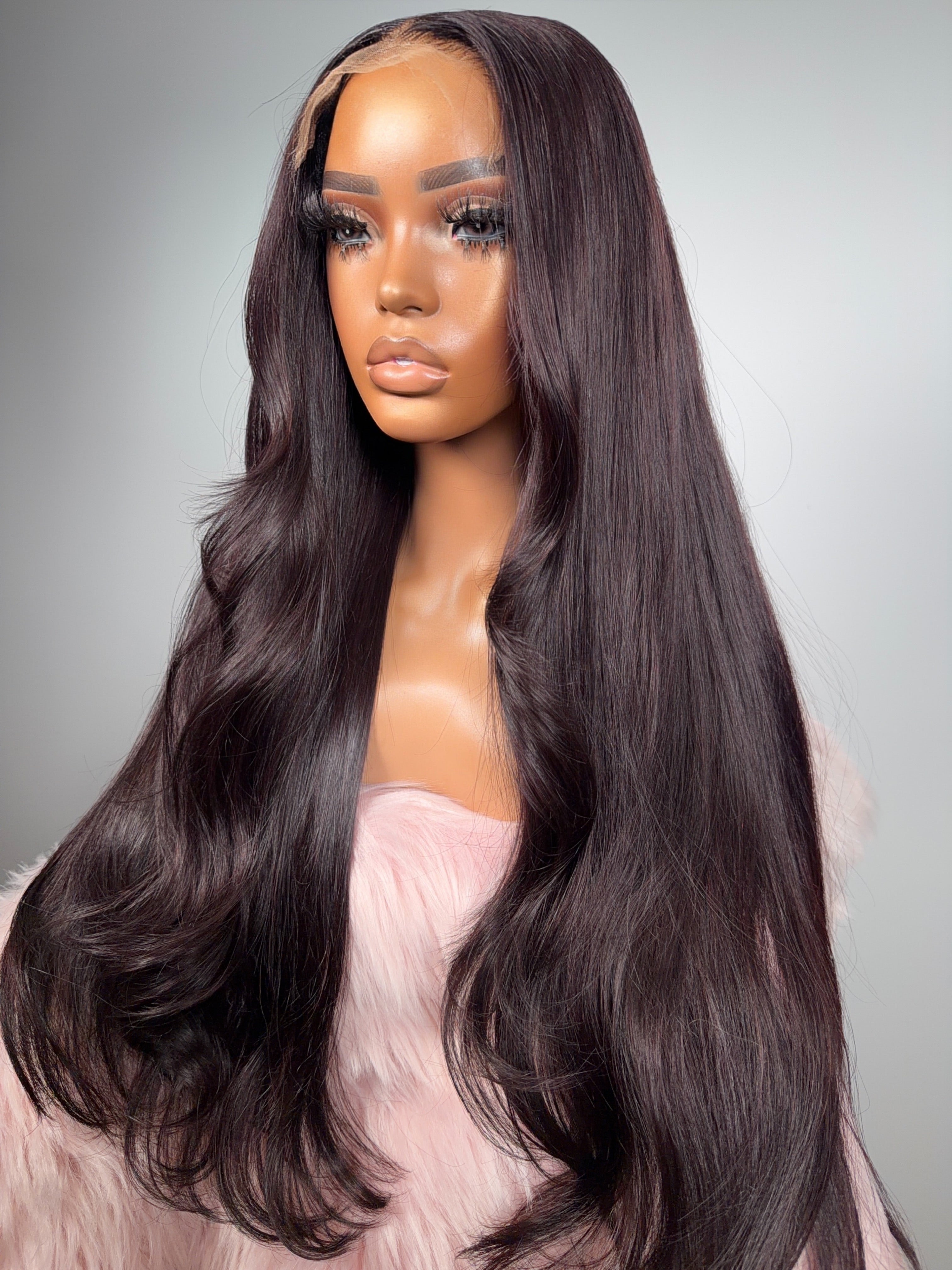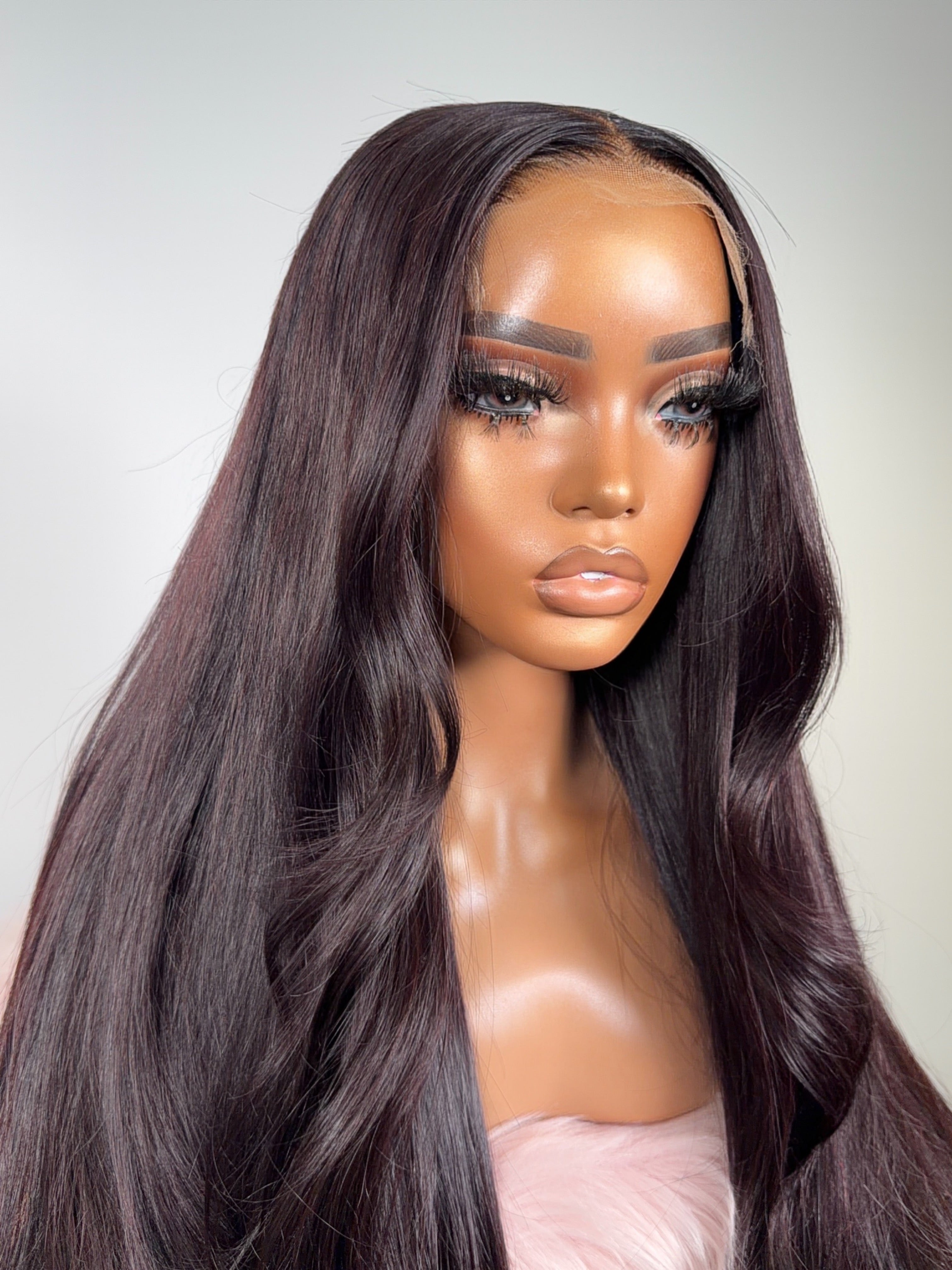 Nadine is a 5x5 HD very thin transparent lace closure wig, Medium cap (22–23”), 28–30” straight cut, made with 3.5 bundles (24” bundles used for the pictured style).