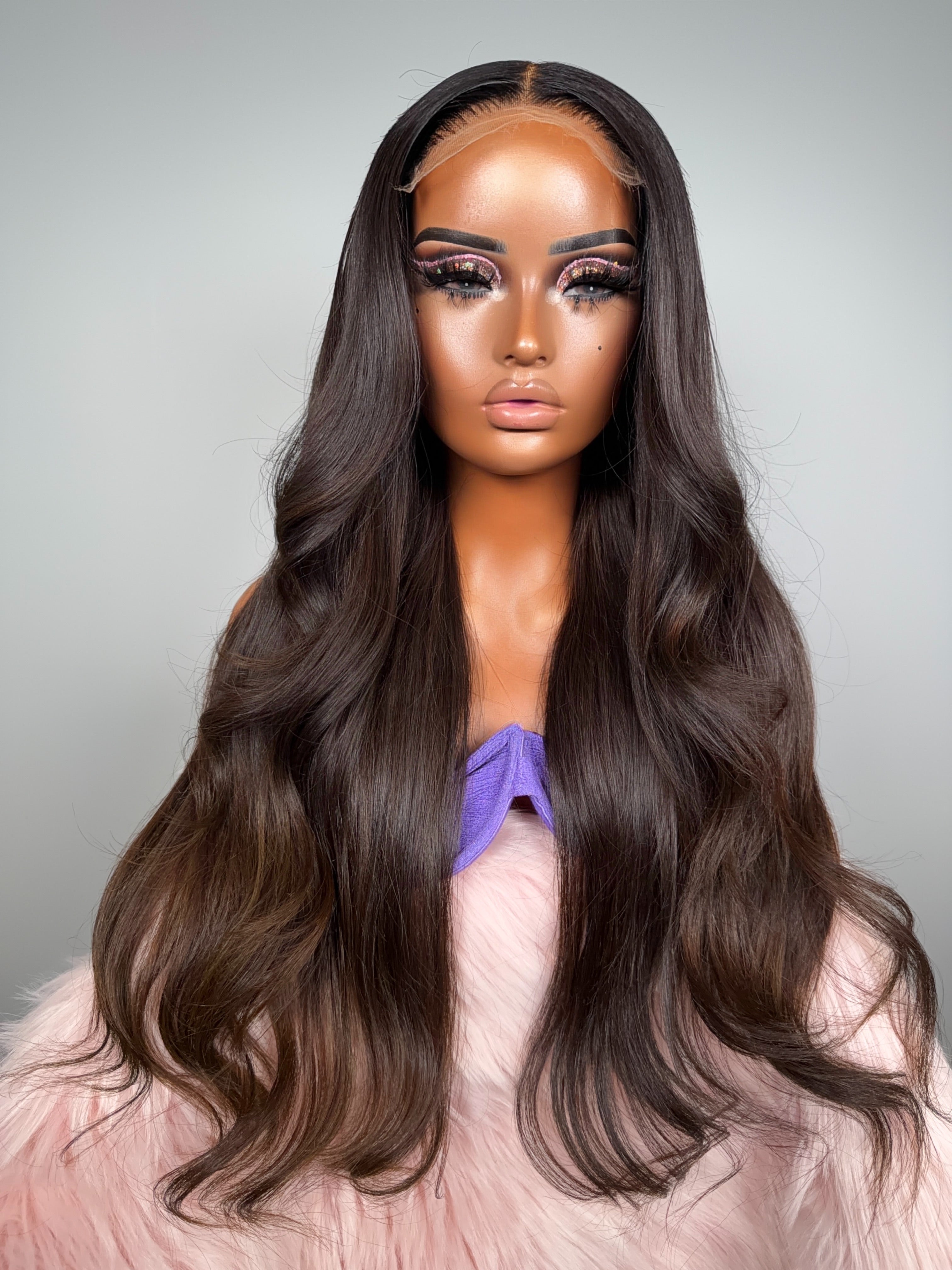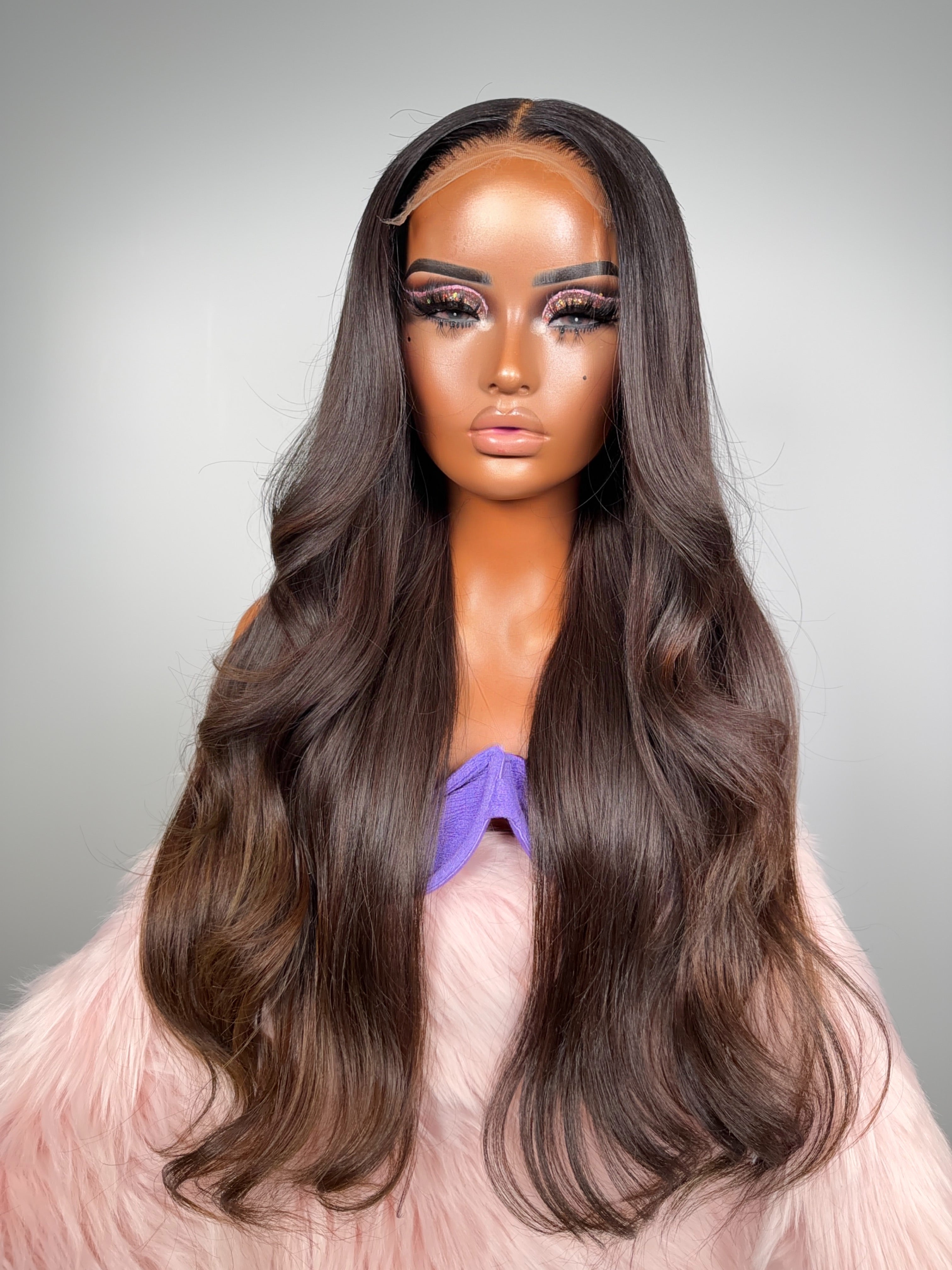 This unit features a rich chocolate brunette tone with subtle warm undertones that glow beautifully under light. Styled in long, flowing loose waves with a soft middle part, it gives an elegant, classic silhouette that feels both modern and timeless. The shine, movement, and fullness make it look expensive, soft, and irresistibly romantic from every angle.