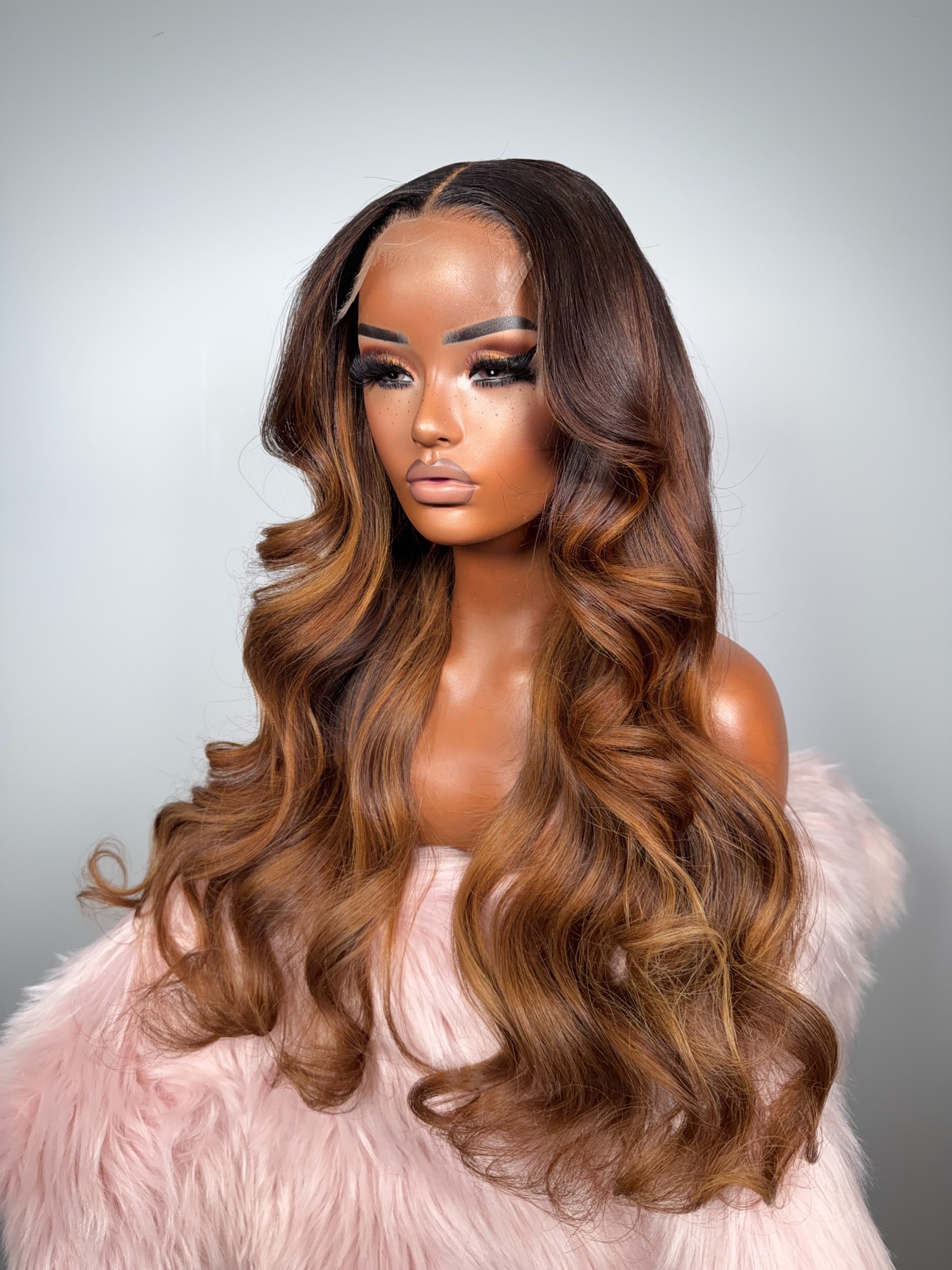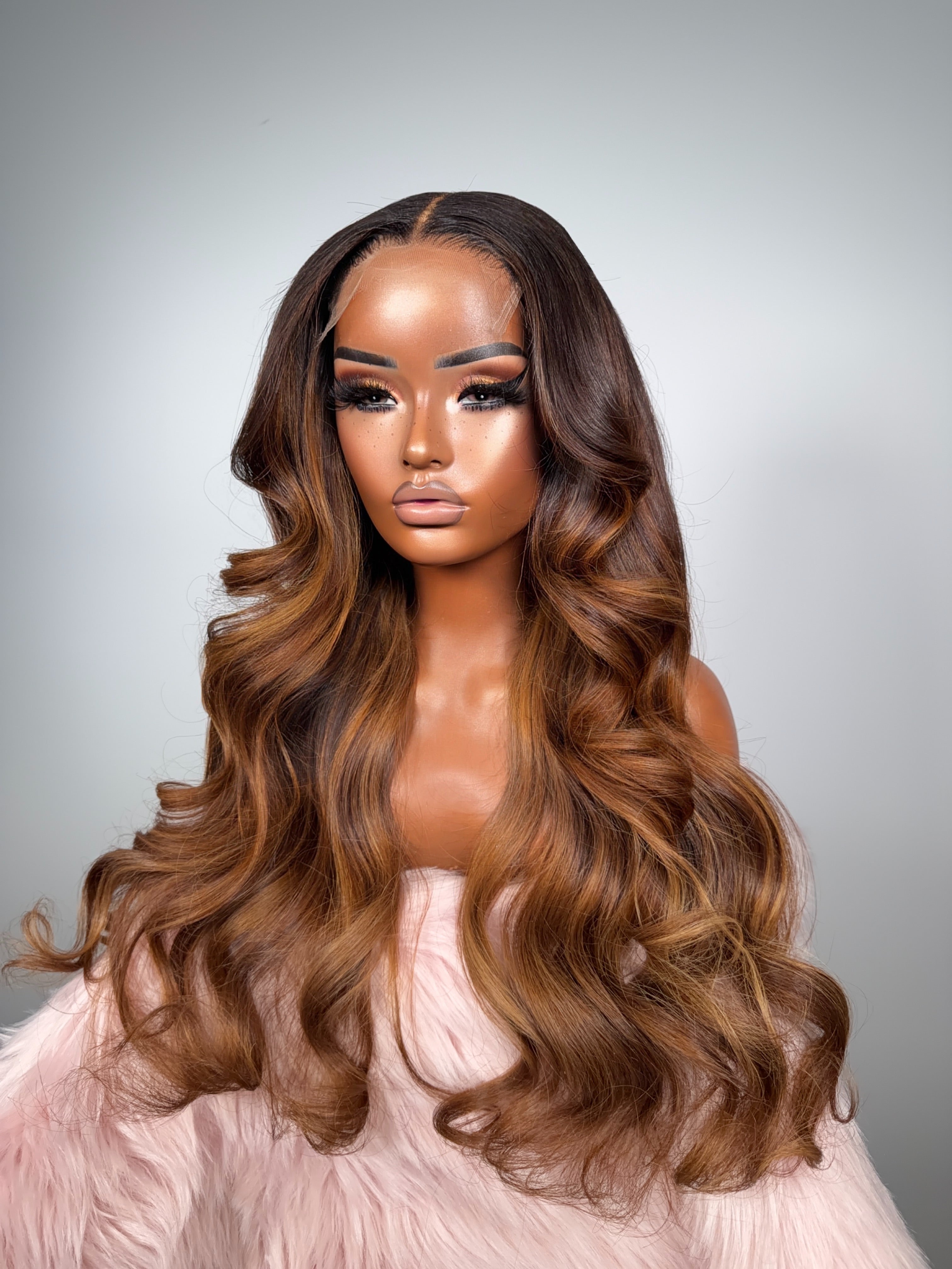 This unit features a rich chocolate brown base elevated with warm caramel and golden honey highlights woven throughout for a multidimensional, glowing finish. The long, cascading waves add movement and softness, creating a romantic, flowing silhouette from every angle.